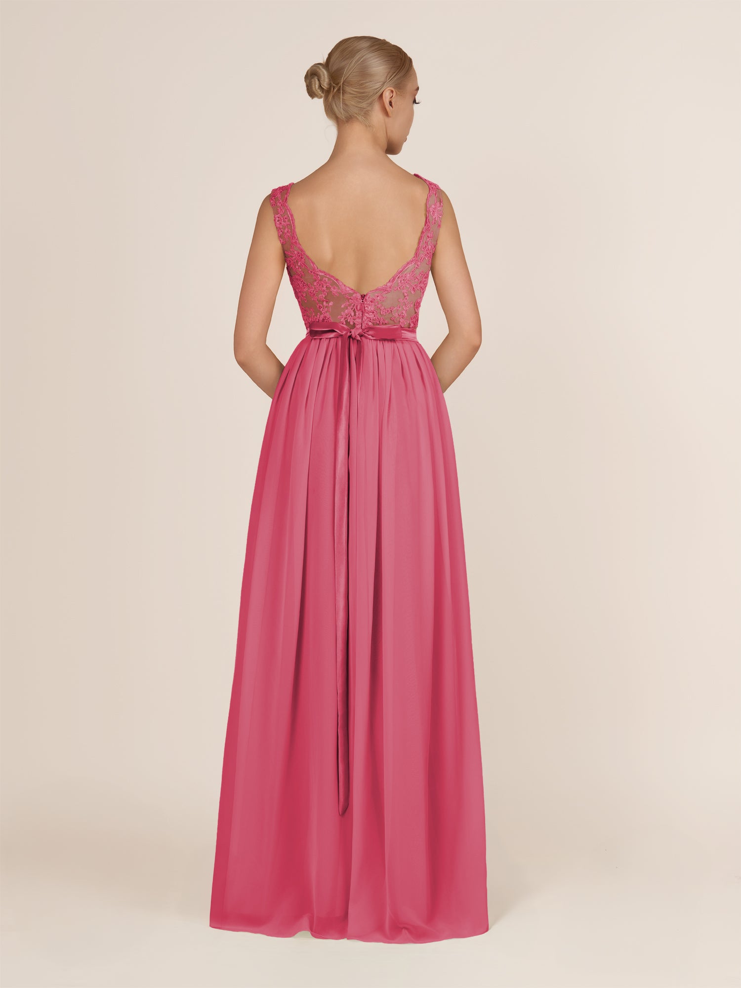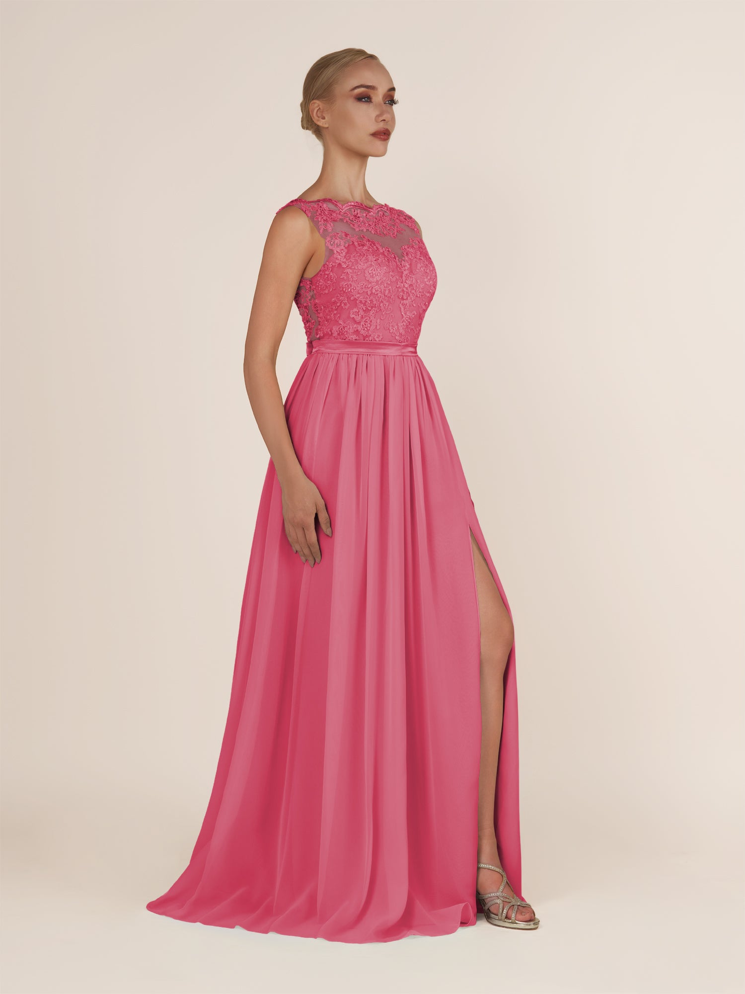 Sable | Fuchsia - A-Line Illusion Neck Chiffon Long Bridesmaid Dress with Lace Appliques