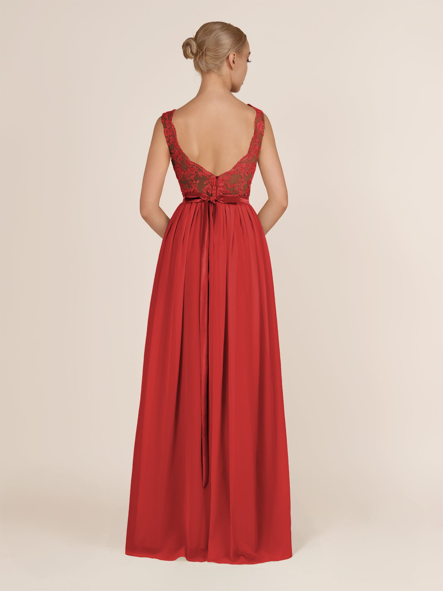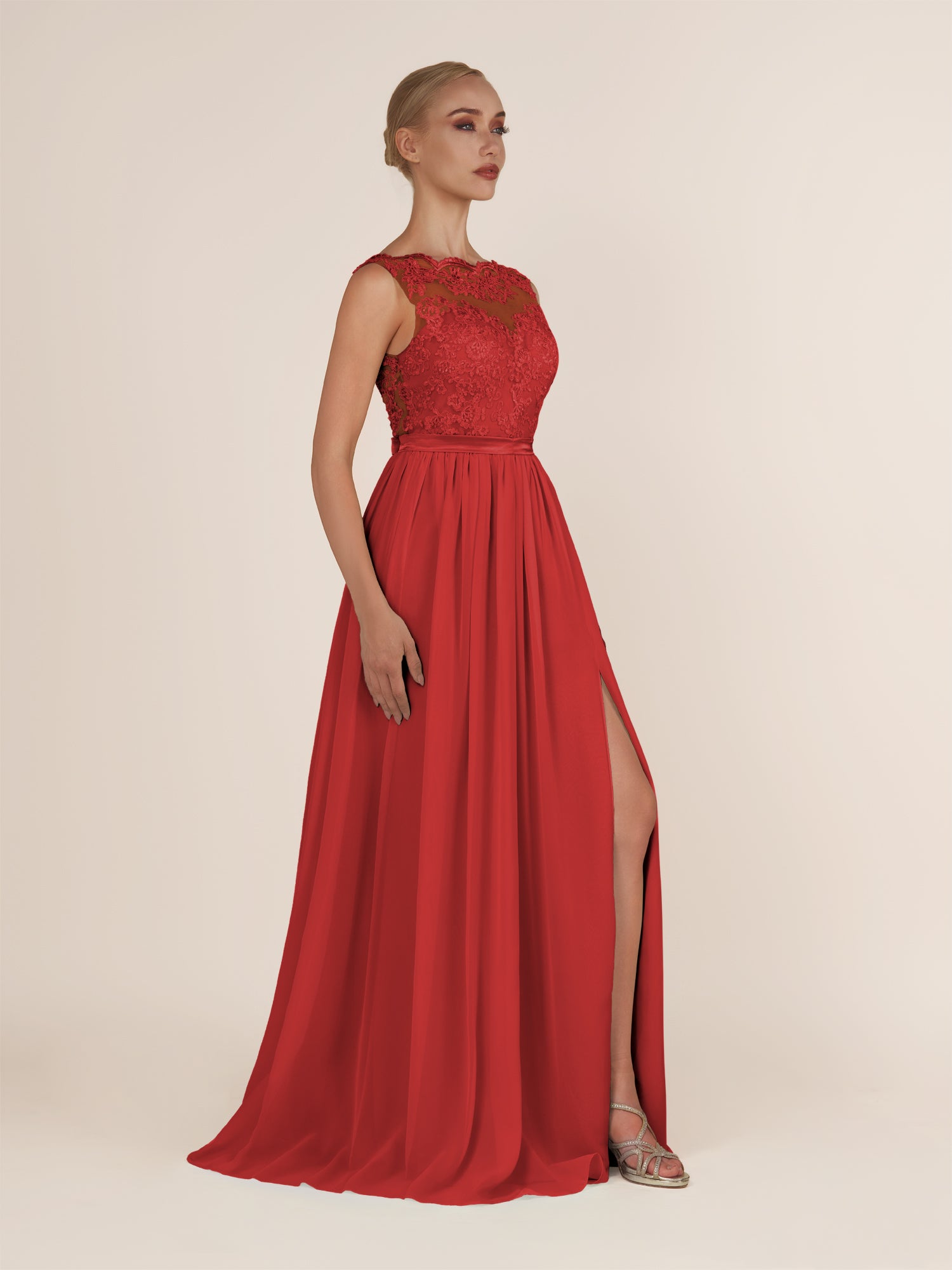 Sable | Ruby Red - A-Line Illusion Neck Chiffon Long Bridesmaid Dress with Lace Appliques