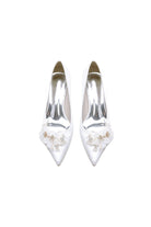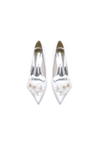 Exquisite satin wedding shoes featuring stiletto heels and adorned with a stunning rhinestone flower, perfectly combining glamour and elegance for your special day.