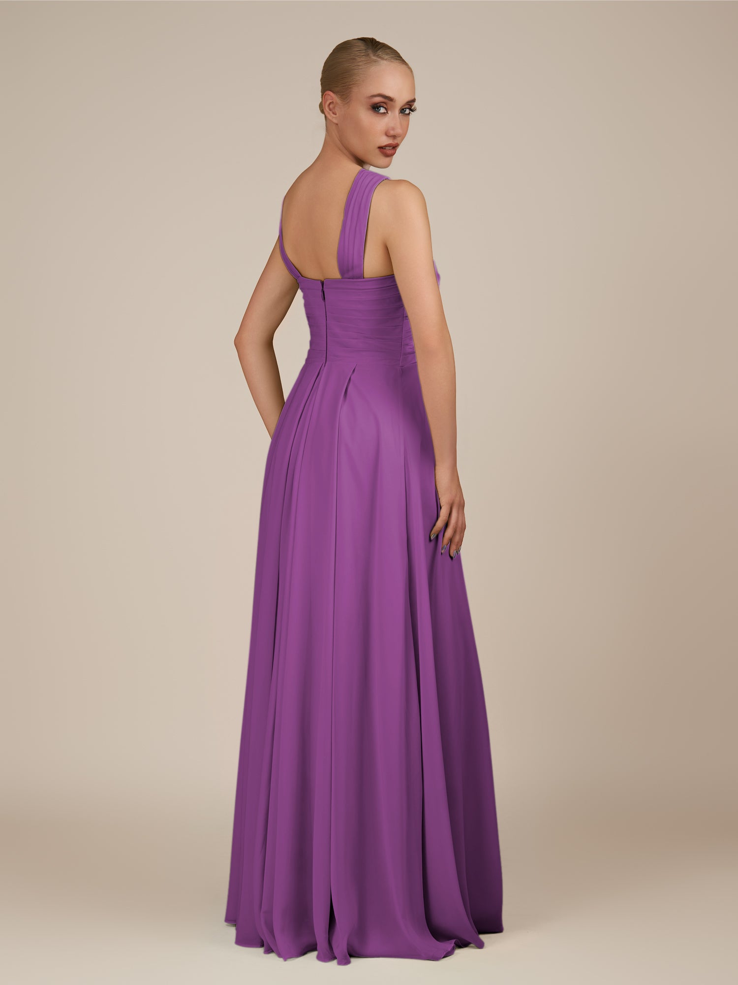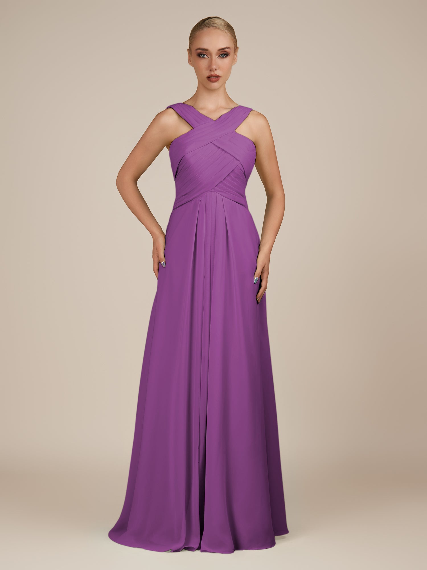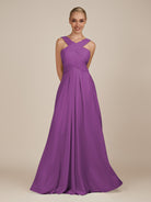 Sharlie | Amethyst - A Line Chiffon Halter Neck Long Bridesmaid Dress with Pleats