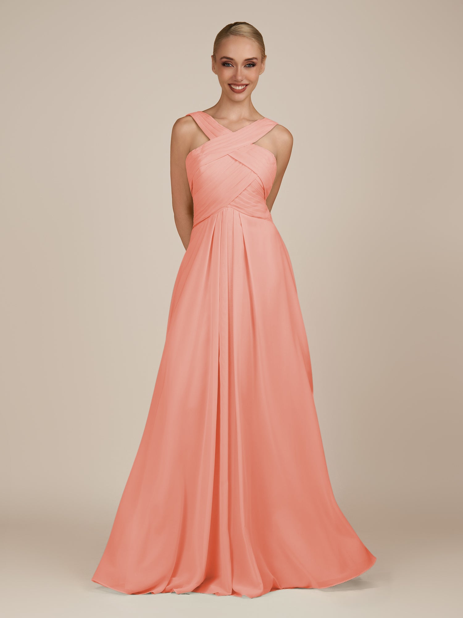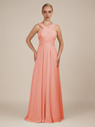 Sharlie | Coral Pink - A Line Chiffon Halter Neck Long Bridesmaid Dress with Pleats