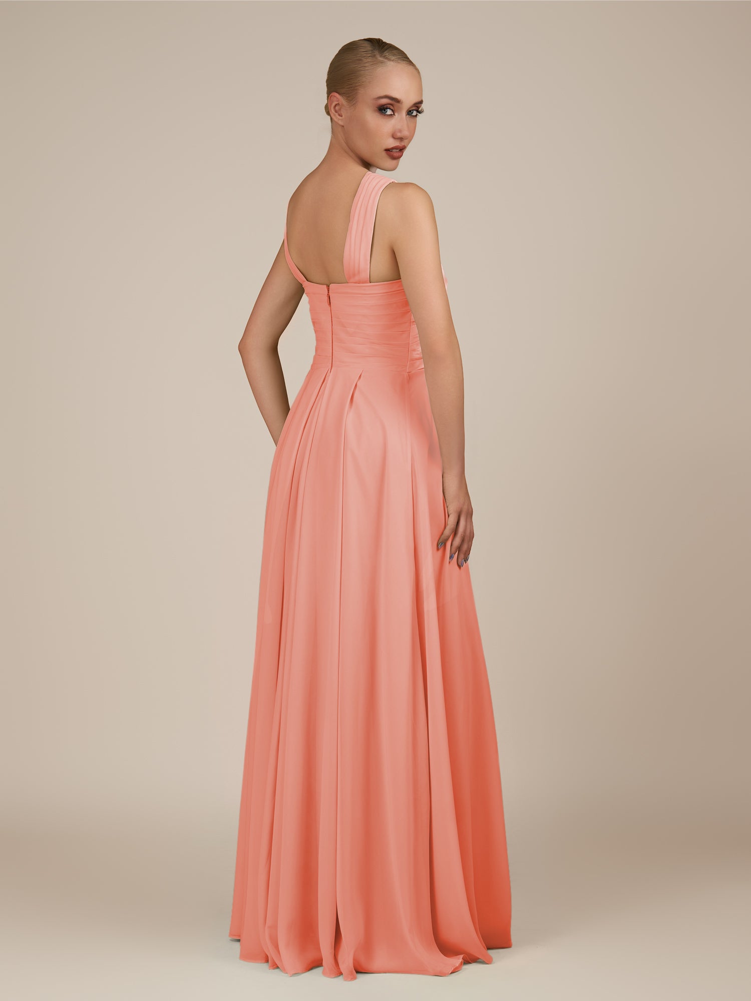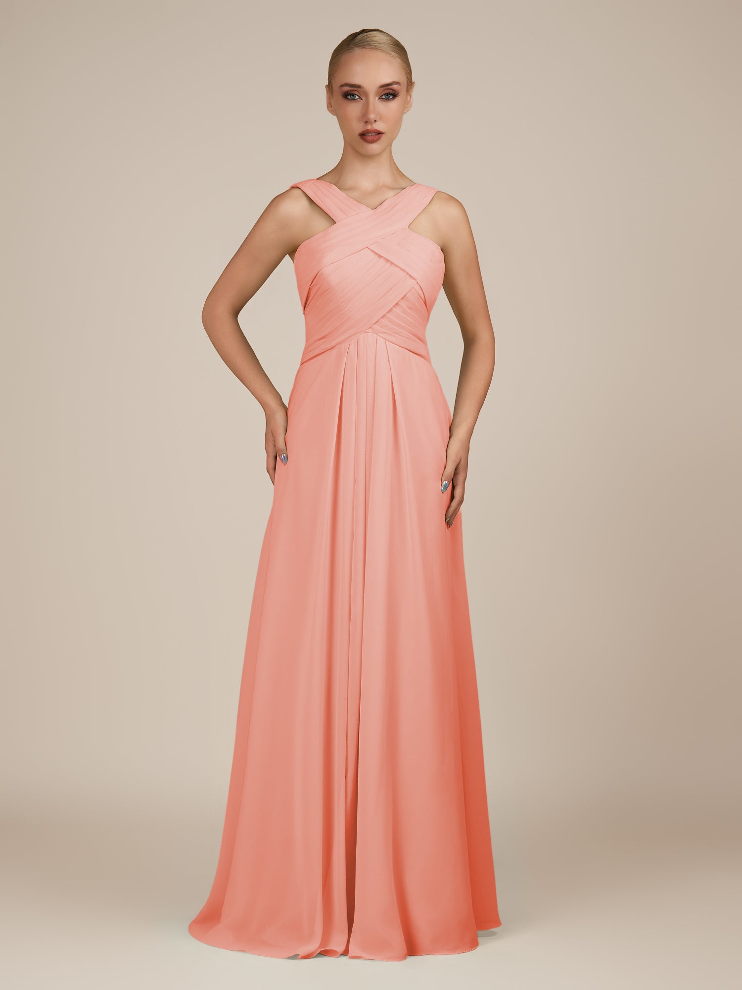 Sharlie is an elegant and refined choice for your bridal party. Crafted from soft chiffon, she features a flattering halter neckline and a sleeveless bodice for a modern, graceful look. Her floor-length A-line skirt flows effortlessly with every step, enhanced by delicate pleats that add texture and sophistication. Finished with a smooth zipper back, Sharlie combines timeless elegance with effortless style for weddings and special occasions.