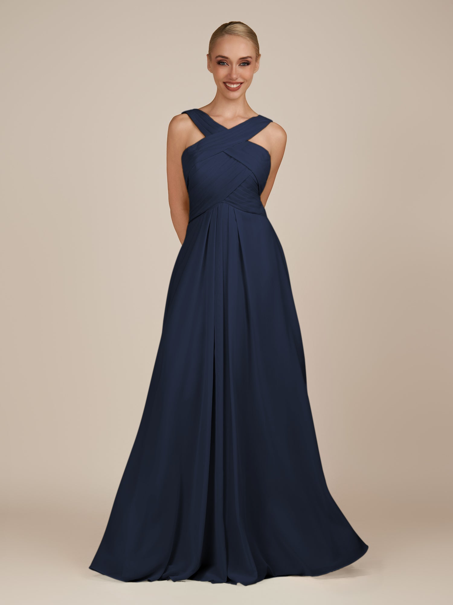 Sharlie is an elegant and refined choice for your bridal party. Crafted from soft chiffon, she features a flattering halter neckline and a sleeveless bodice for a modern, graceful look. Her floor-length A-line skirt flows effortlessly with every step, enhanced by delicate pleats that add texture and sophistication. Finished with a smooth zipper back, Sharlie combines timeless elegance with effortless style for weddings and special occasions.