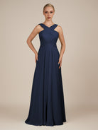 Sharlie | Dark Navy - A Line Chiffon Halter Neck Long Bridesmaid Dress with Pleats