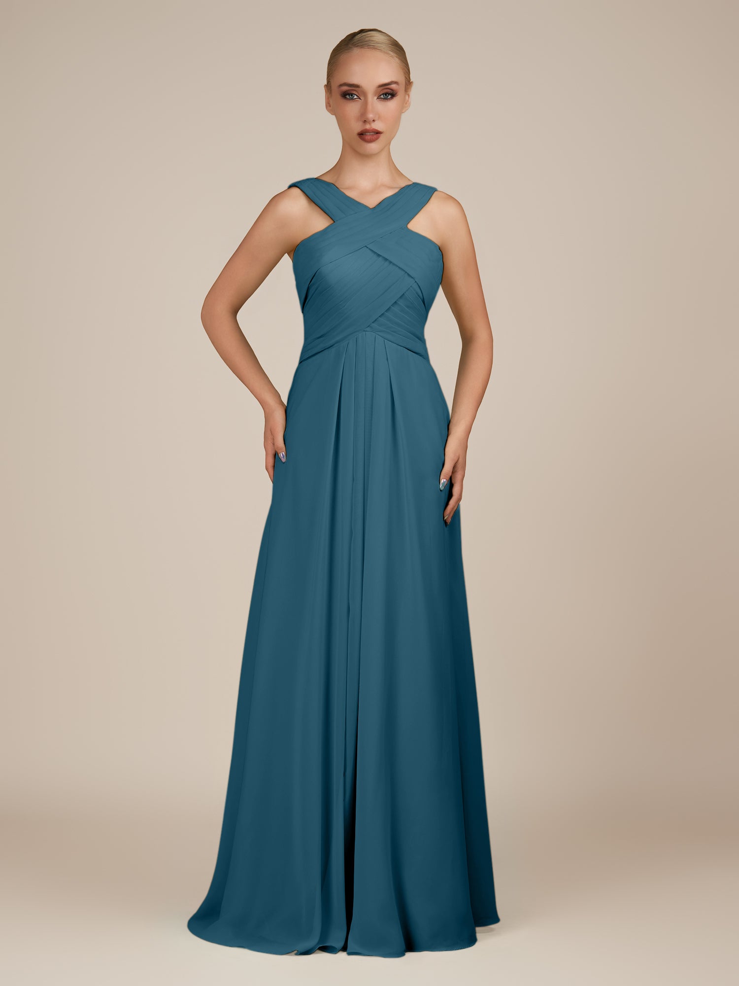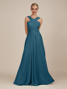 Sharlie | Dark Teal - A Line Chiffon Halter Neck Long Bridesmaid Dress with Pleats