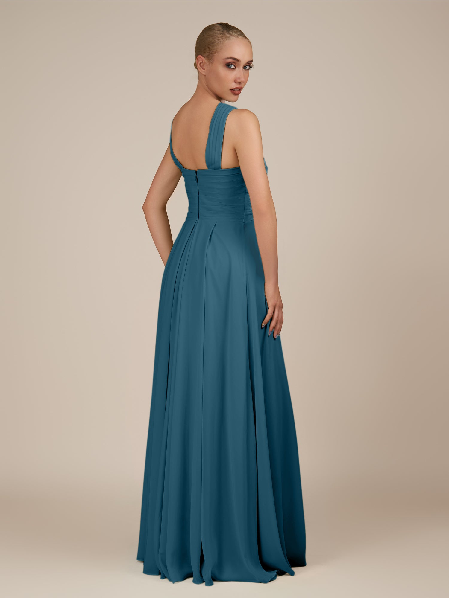 Sharlie is an elegant and refined choice for your bridal party. Crafted from soft chiffon, she features a flattering halter neckline and a sleeveless bodice for a modern, graceful look. Her floor-length A-line skirt flows effortlessly with every step, enhanced by delicate pleats that add texture and sophistication. Finished with a smooth zipper back, Sharlie combines timeless elegance with effortless style for weddings and special occasions.