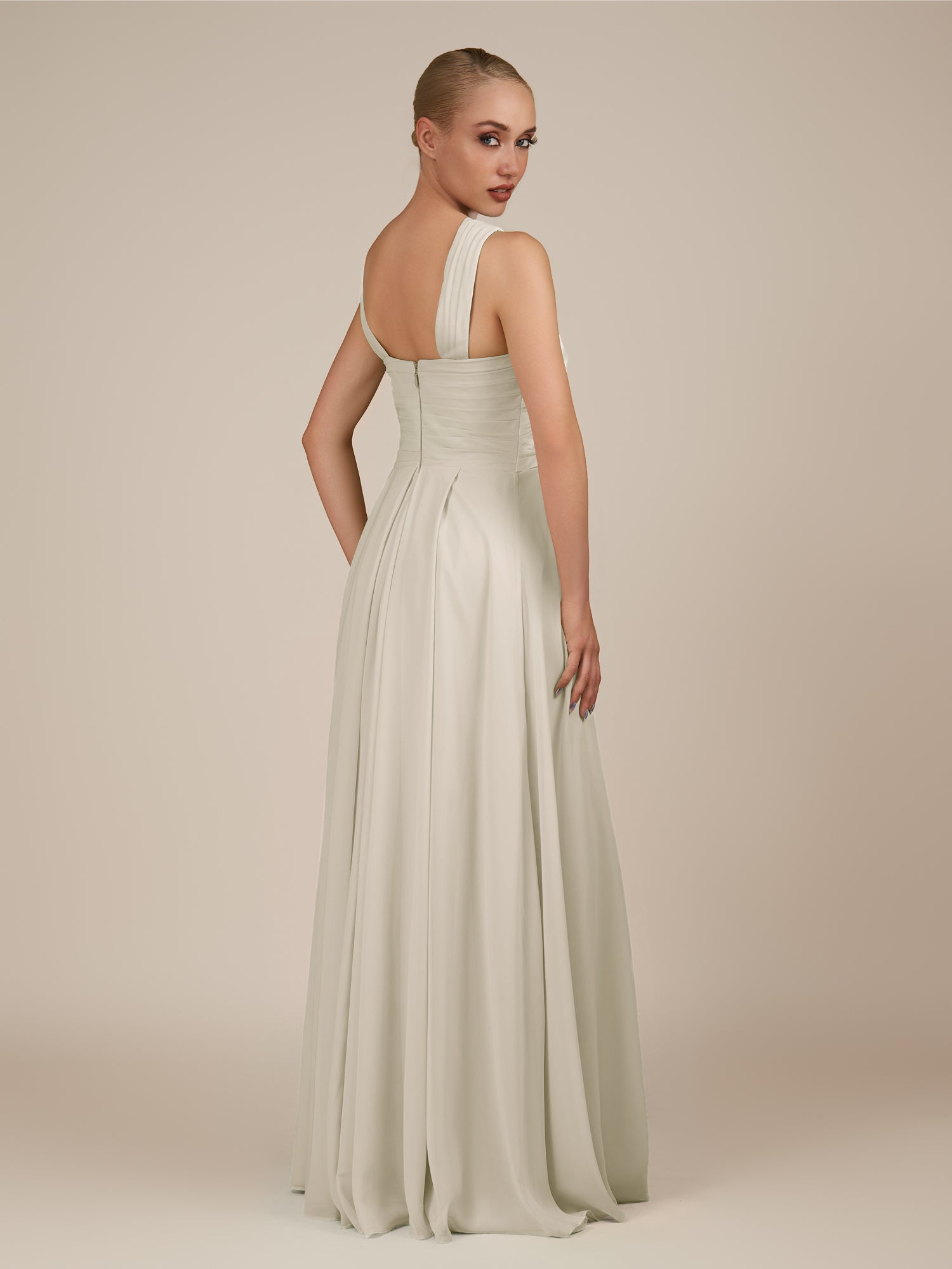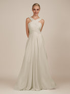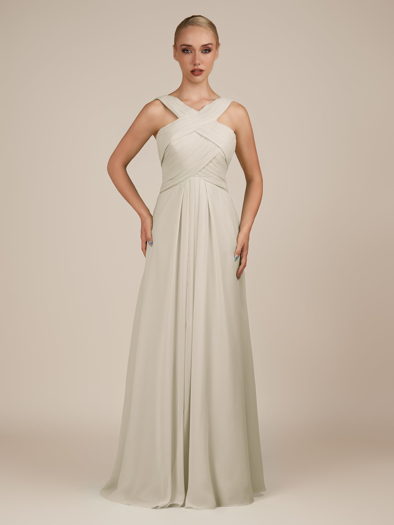 Sharlie is an elegant and refined choice for your bridal party. Crafted from soft chiffon, she features a flattering halter neckline and a sleeveless bodice for a modern, graceful look. Her floor-length A-line skirt flows effortlessly with every step, enhanced by delicate pleats that add texture and sophistication. Finished with a smooth zipper back, Sharlie combines timeless elegance with effortless style for weddings and special occasions.