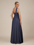 Sharlie | Dusk Blue - A Line Chiffon Halter Neck Long Bridesmaid Dress with Pleats