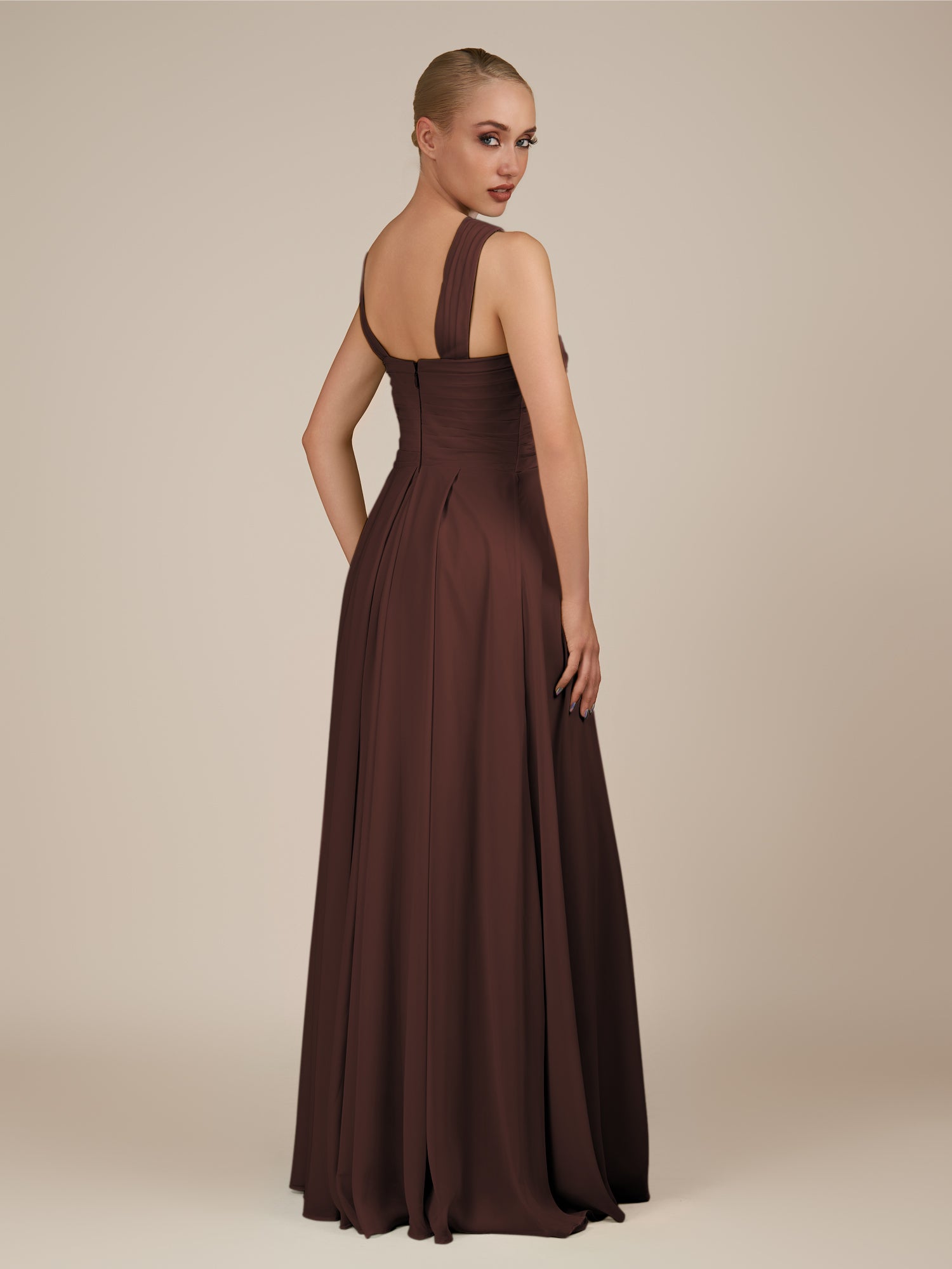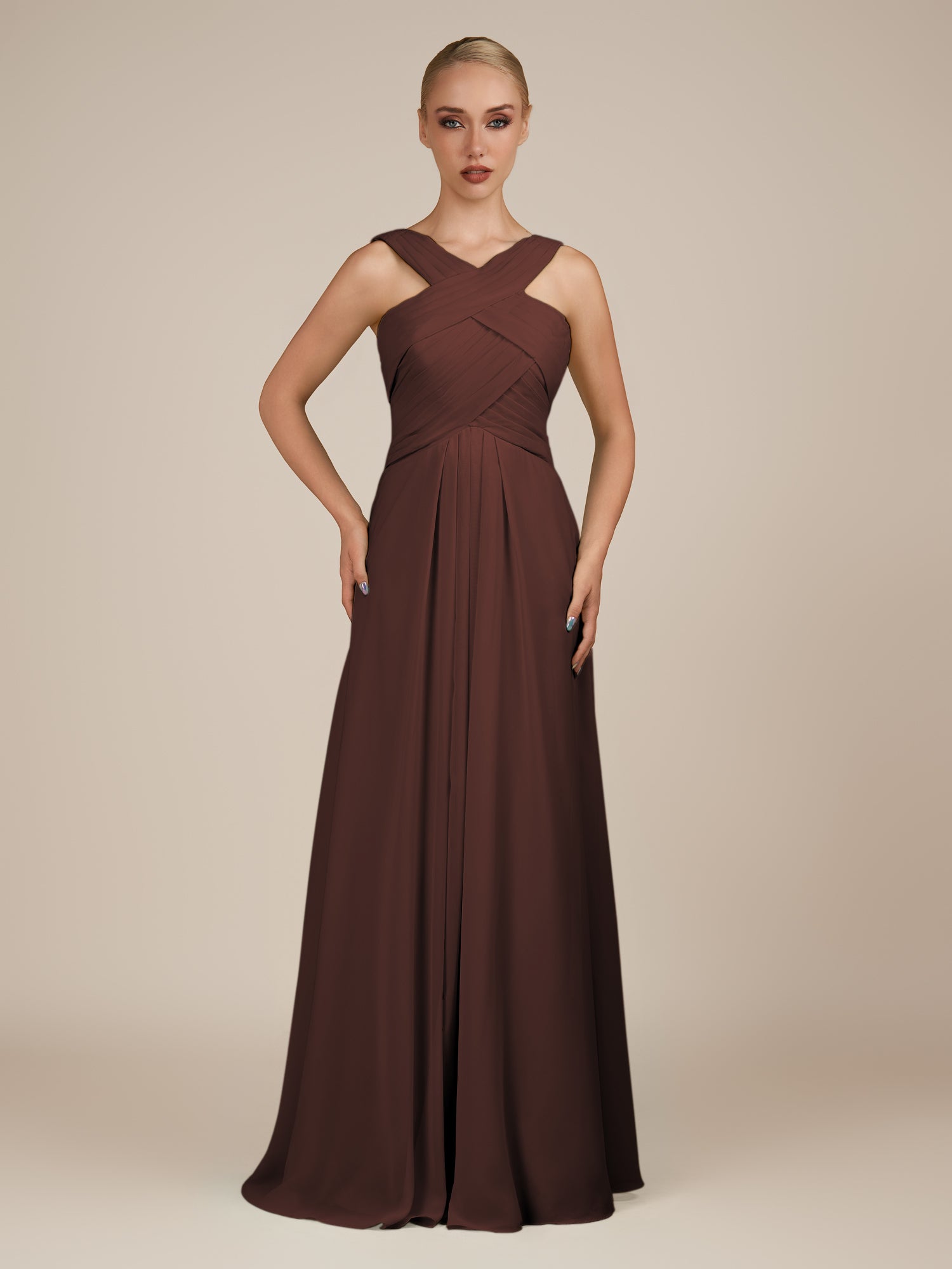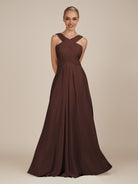 Sharlie | Espresso - A Line Chiffon Halter Neck Long Bridesmaid Dress with Pleats