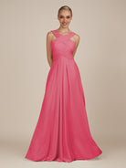 Sharlie | Fuchsia - A Line Chiffon Halter Neck Long Bridesmaid Dress with Pleats