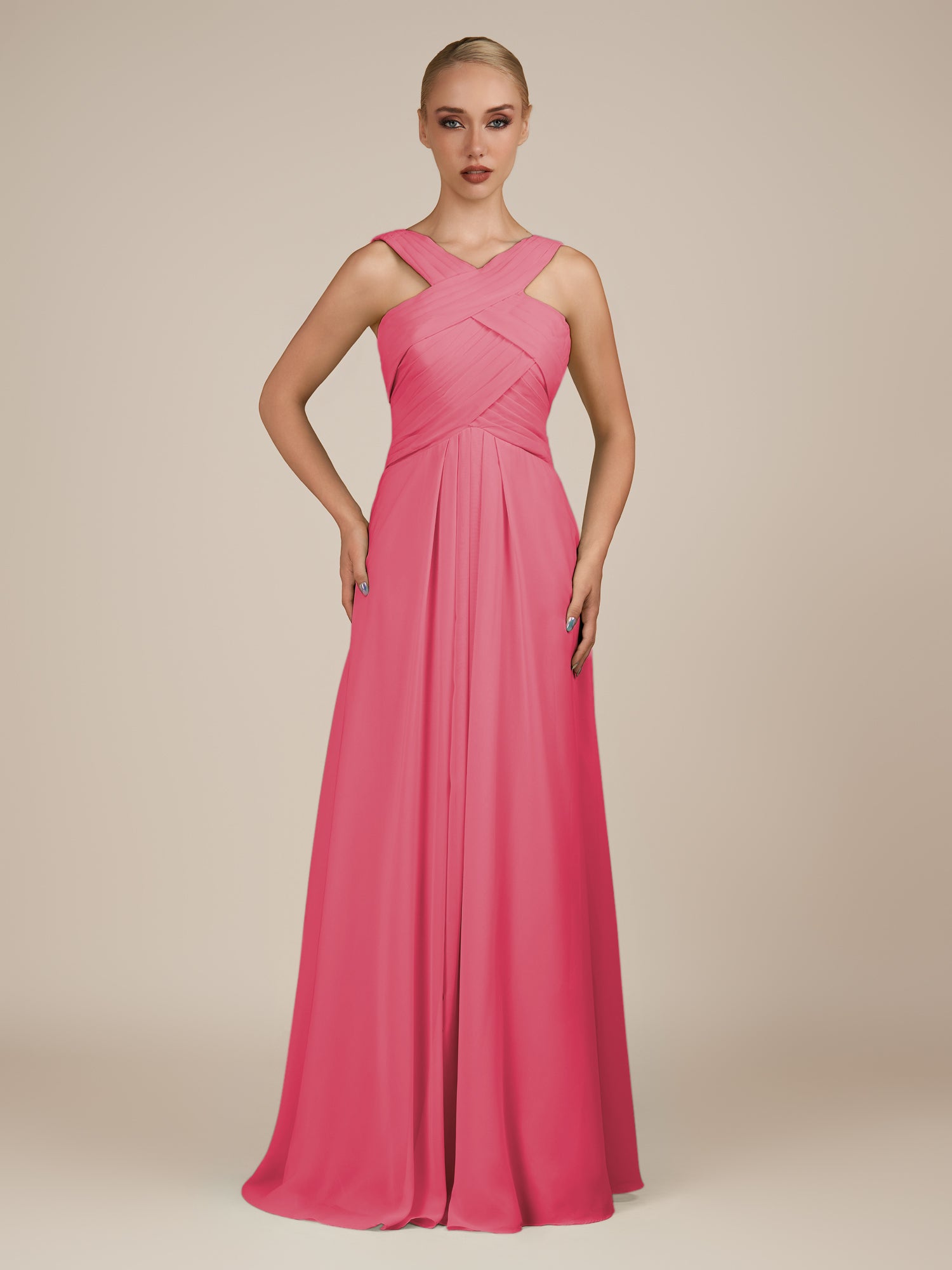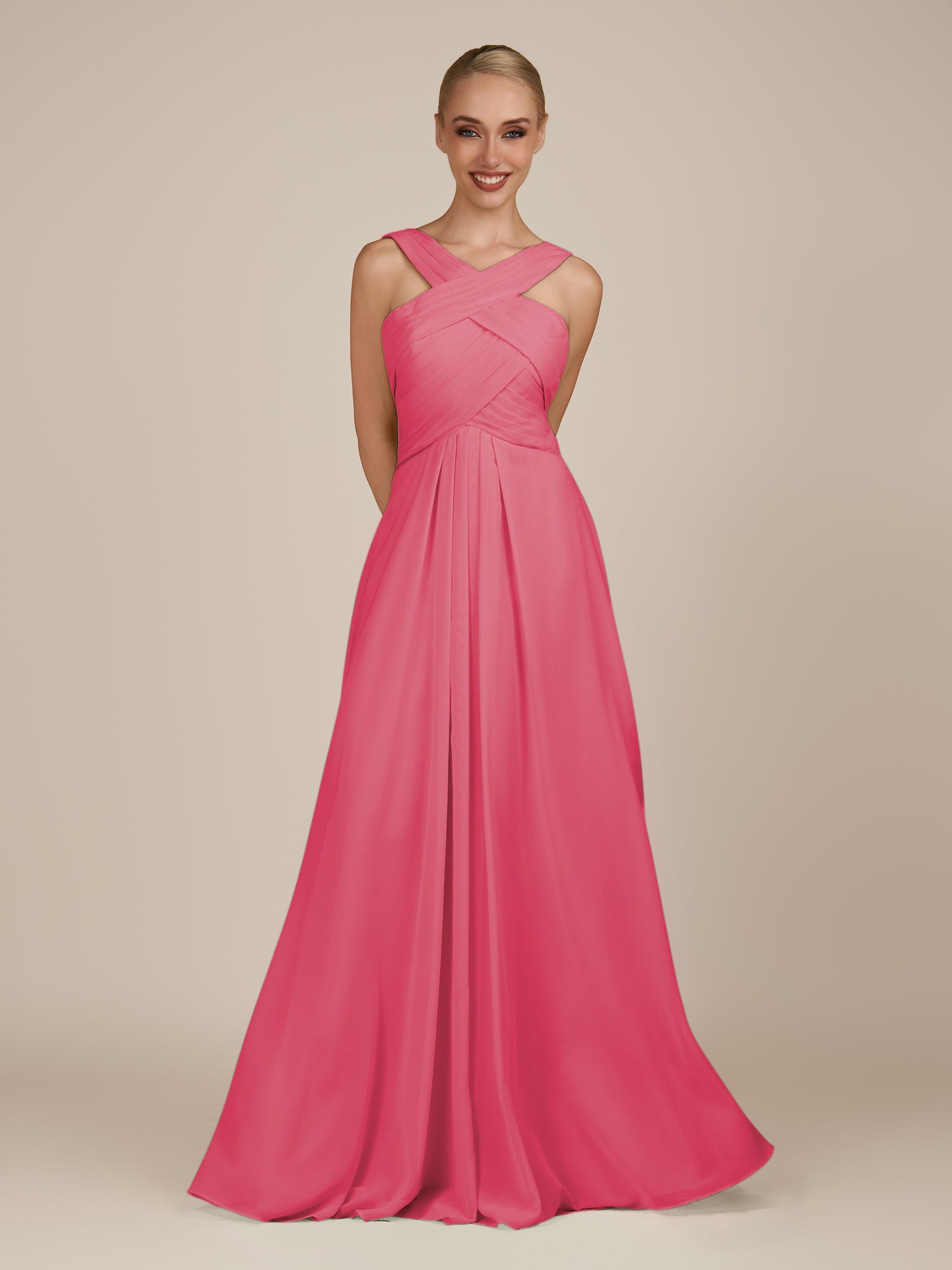 Sharlie is an elegant and refined choice for your bridal party. Crafted from soft chiffon, she features a flattering halter neckline and a sleeveless bodice for a modern, graceful look. Her floor-length A-line skirt flows effortlessly with every step, enhanced by delicate pleats that add texture and sophistication. Finished with a smooth zipper back, Sharlie combines timeless elegance with effortless style for weddings and special occasions.