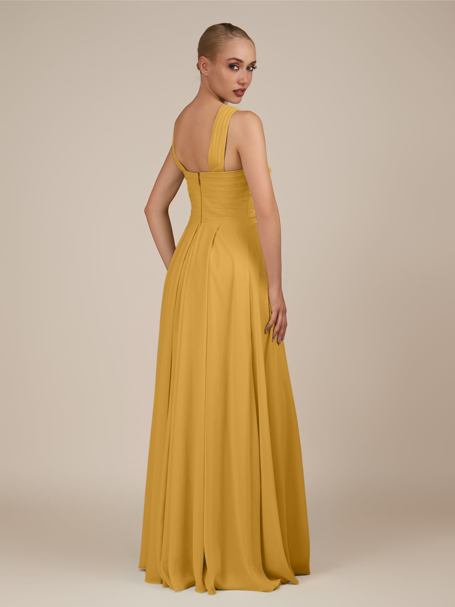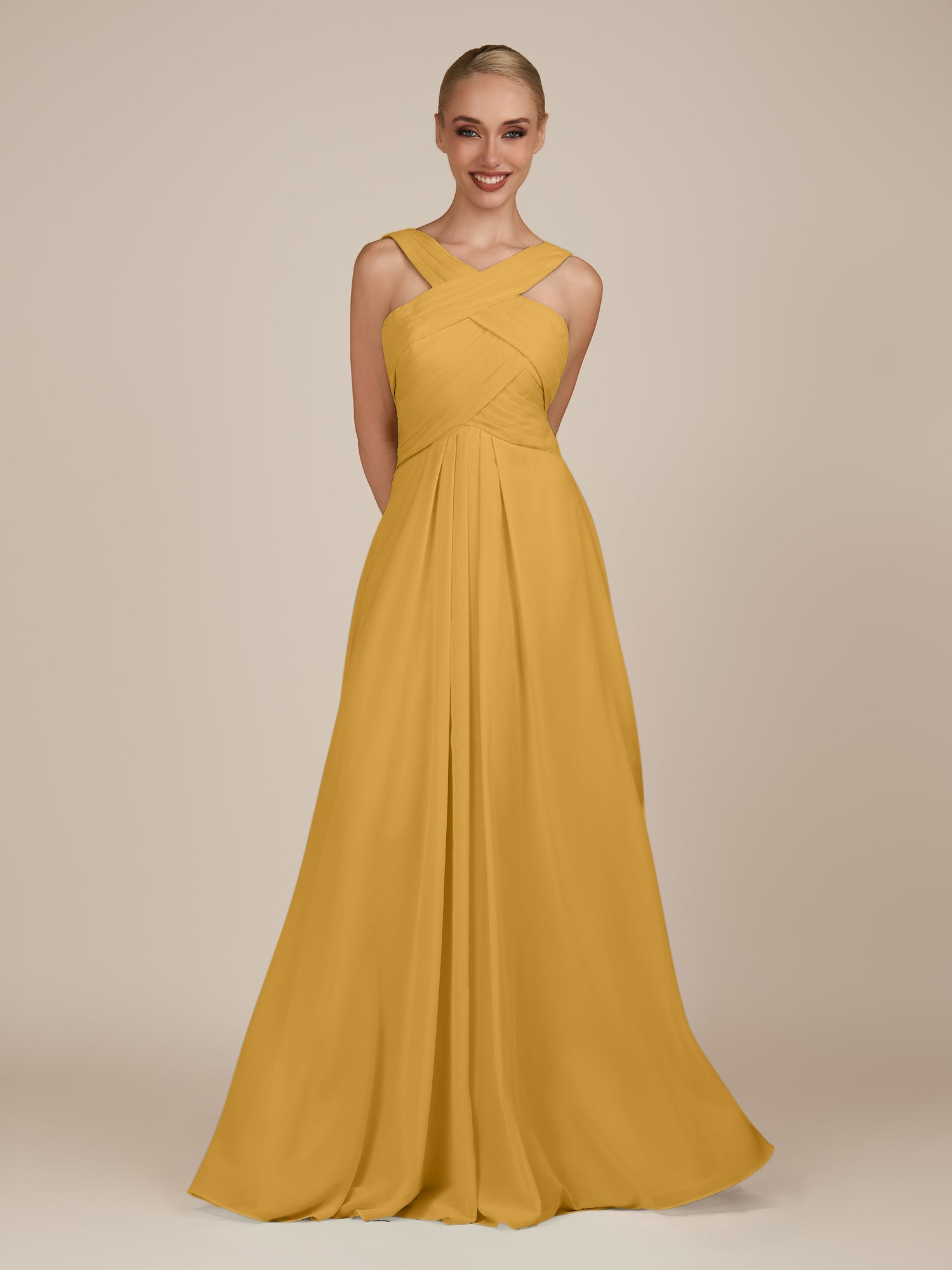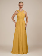 Sharlie | Marigold - A Line Chiffon Halter Neck Long Bridesmaid Dress with Pleats