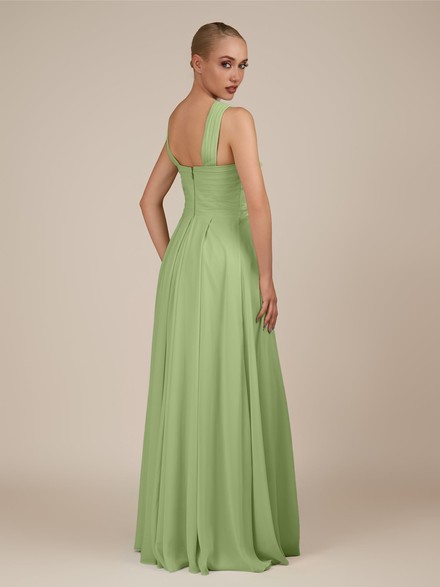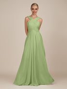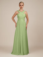 Sharlie | Matcha - A Line Chiffon Halter Neck Long Bridesmaid Dress with Pleats