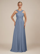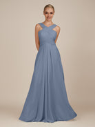 Sharlie | Neptune - A Line Chiffon Halter Neck Long Bridesmaid Dress with Pleats