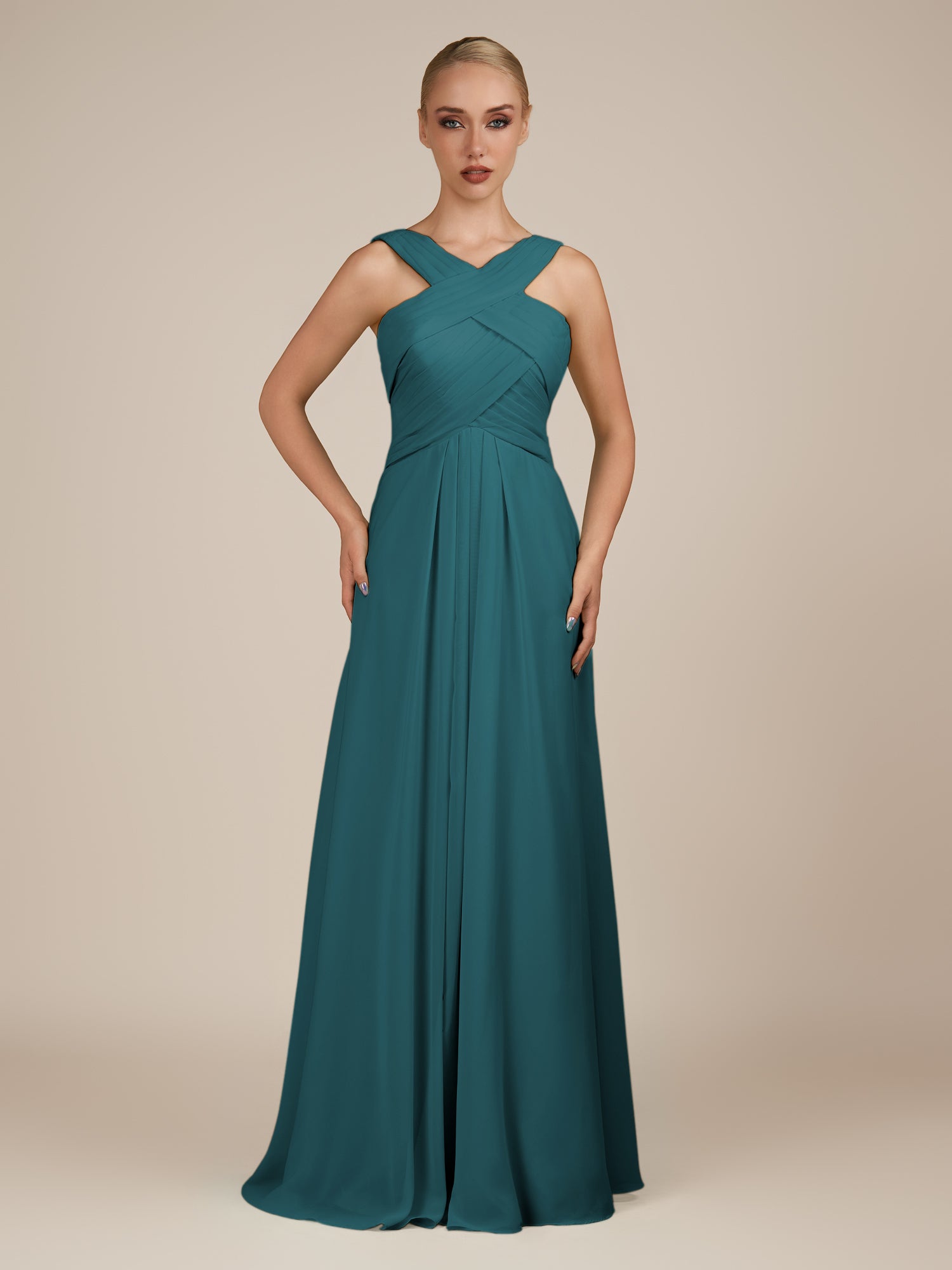 Sharlie | Pine - A Line Chiffon Halter Neck Long Bridesmaid Dress with Pleats