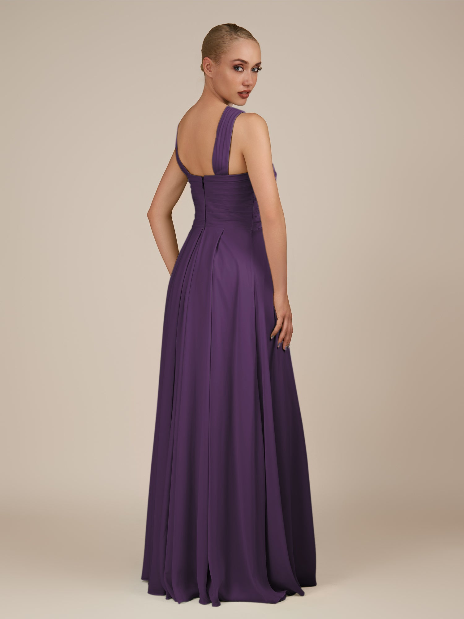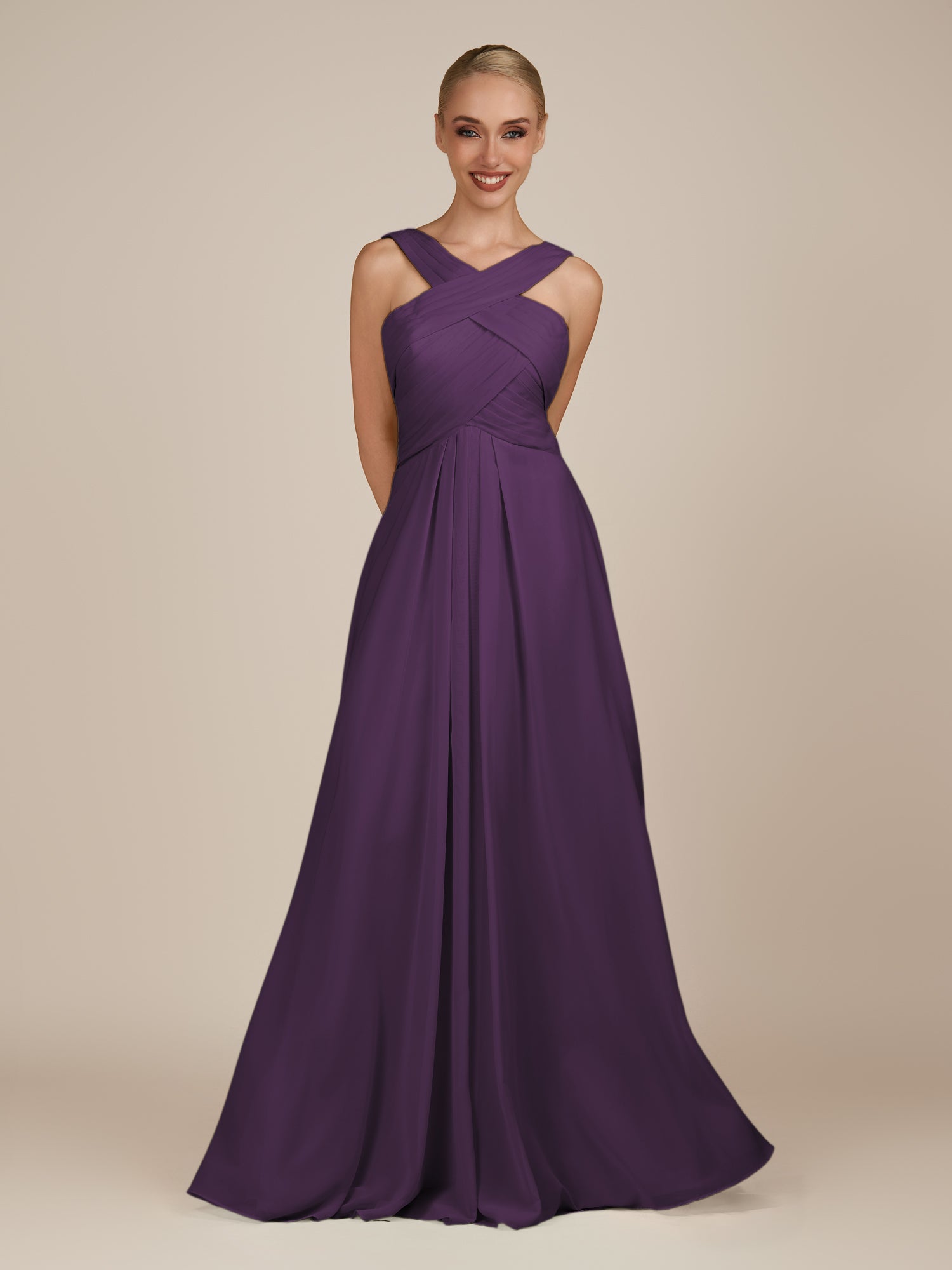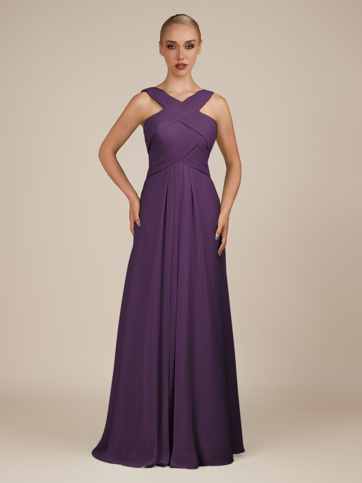 Sharlie is an elegant and refined choice for your bridal party. Crafted from soft chiffon, she features a flattering halter neckline and a sleeveless bodice for a modern, graceful look. Her floor-length A-line skirt flows effortlessly with every step, enhanced by delicate pleats that add texture and sophistication. Finished with a smooth zipper back, Sharlie combines timeless elegance with effortless style for weddings and special occasions.
