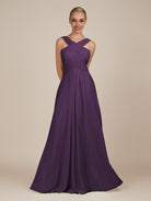 Sharlie | Plum - A Line Chiffon Halter Neck Long Bridesmaid Dress with Pleats