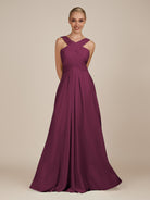 Sharlie | Sangria - A Line Chiffon Halter Neck Long Bridesmaid Dress with Pleats