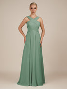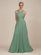 Sharlie | Sea Glass - A Line Chiffon Halter Neck Long Bridesmaid Dress with Pleats