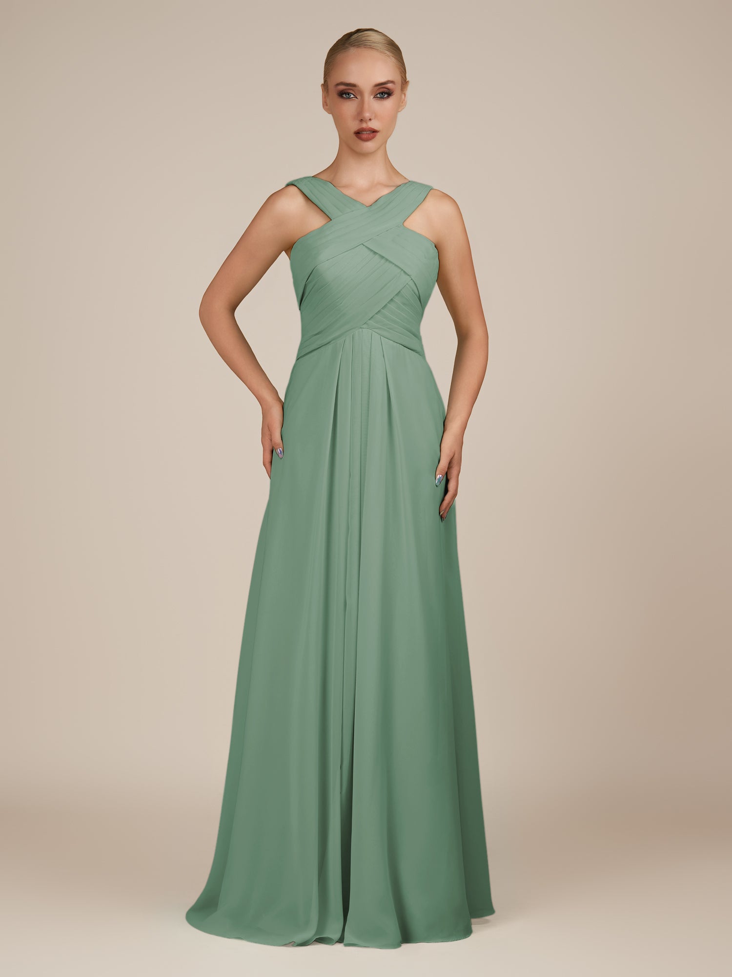 Sharlie is an elegant and refined choice for your bridal party. Crafted from soft chiffon, she features a flattering halter neckline and a sleeveless bodice for a modern, graceful look. Her floor-length A-line skirt flows effortlessly with every step, enhanced by delicate pleats that add texture and sophistication. Finished with a smooth zipper back, Sharlie combines timeless elegance with effortless style for weddings and special occasions.