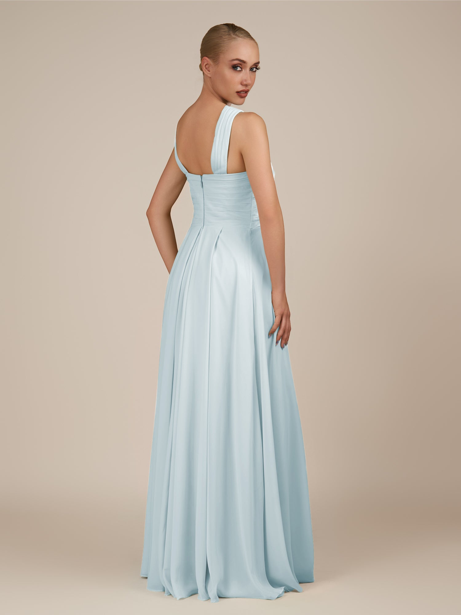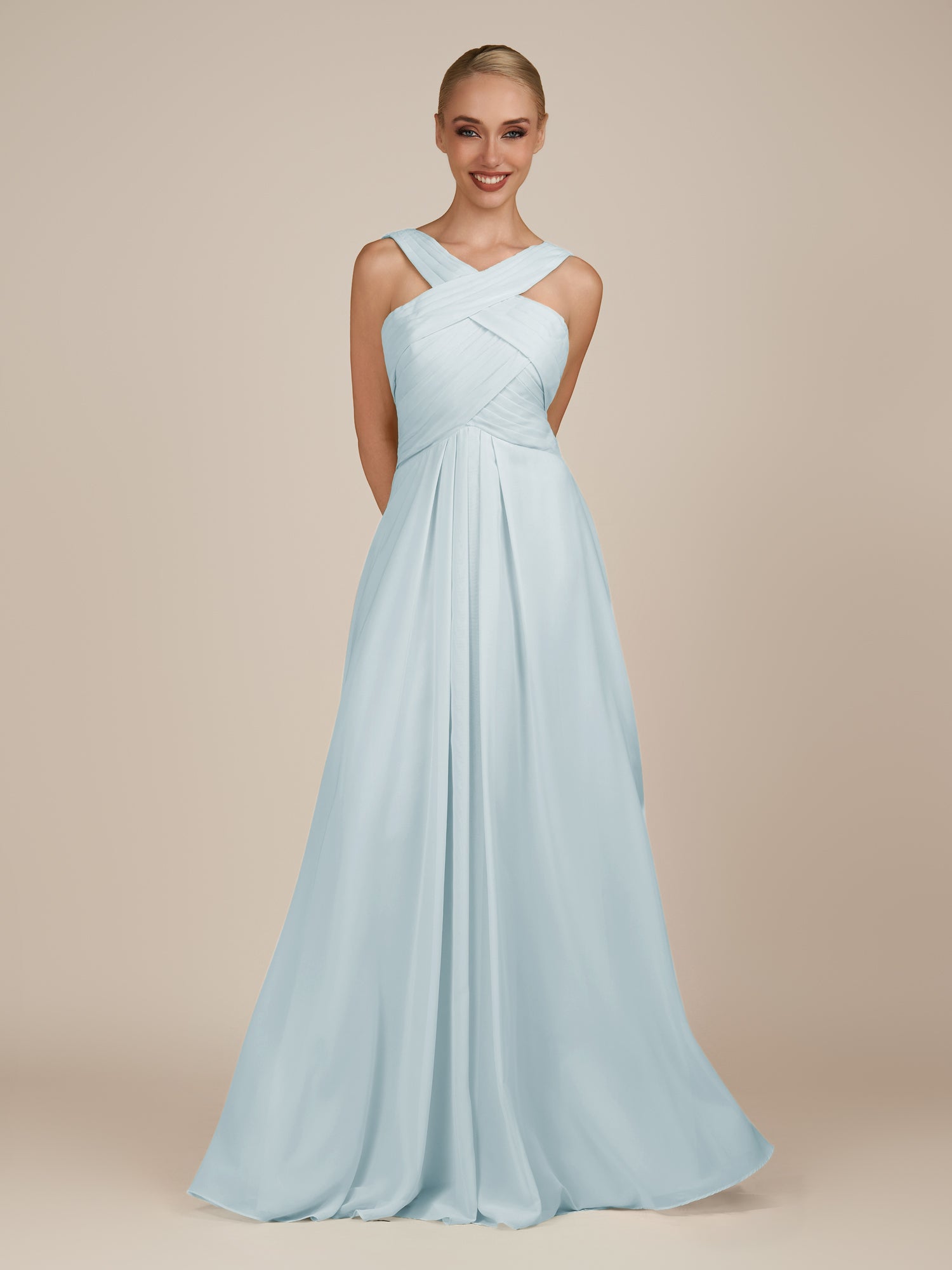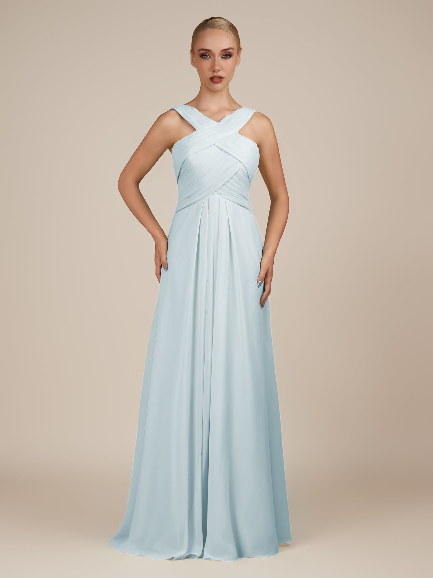 Sharlie is an elegant and refined choice for your bridal party. Crafted from soft chiffon, she features a flattering halter neckline and a sleeveless bodice for a modern, graceful look. Her floor-length A-line skirt flows effortlessly with every step, enhanced by delicate pleats that add texture and sophistication. Finished with a smooth zipper back, Sharlie combines timeless elegance with effortless style for weddings and special occasions.