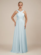 Sharlie | Sky Blue - A Line Chiffon Halter Neck Long Bridesmaid Dress with Pleats