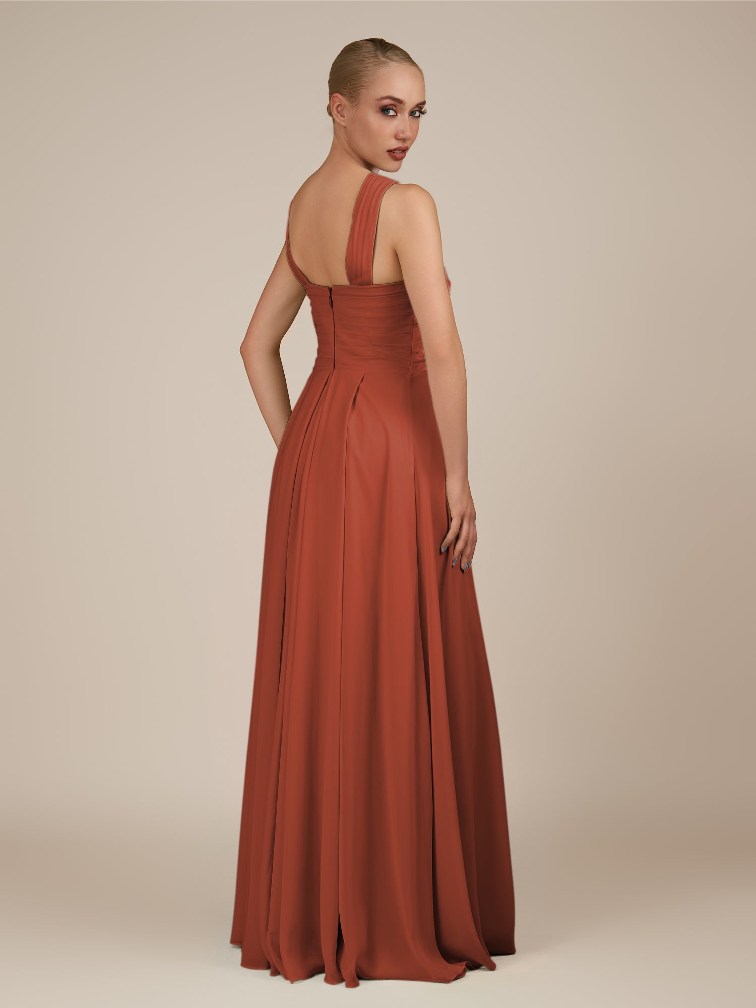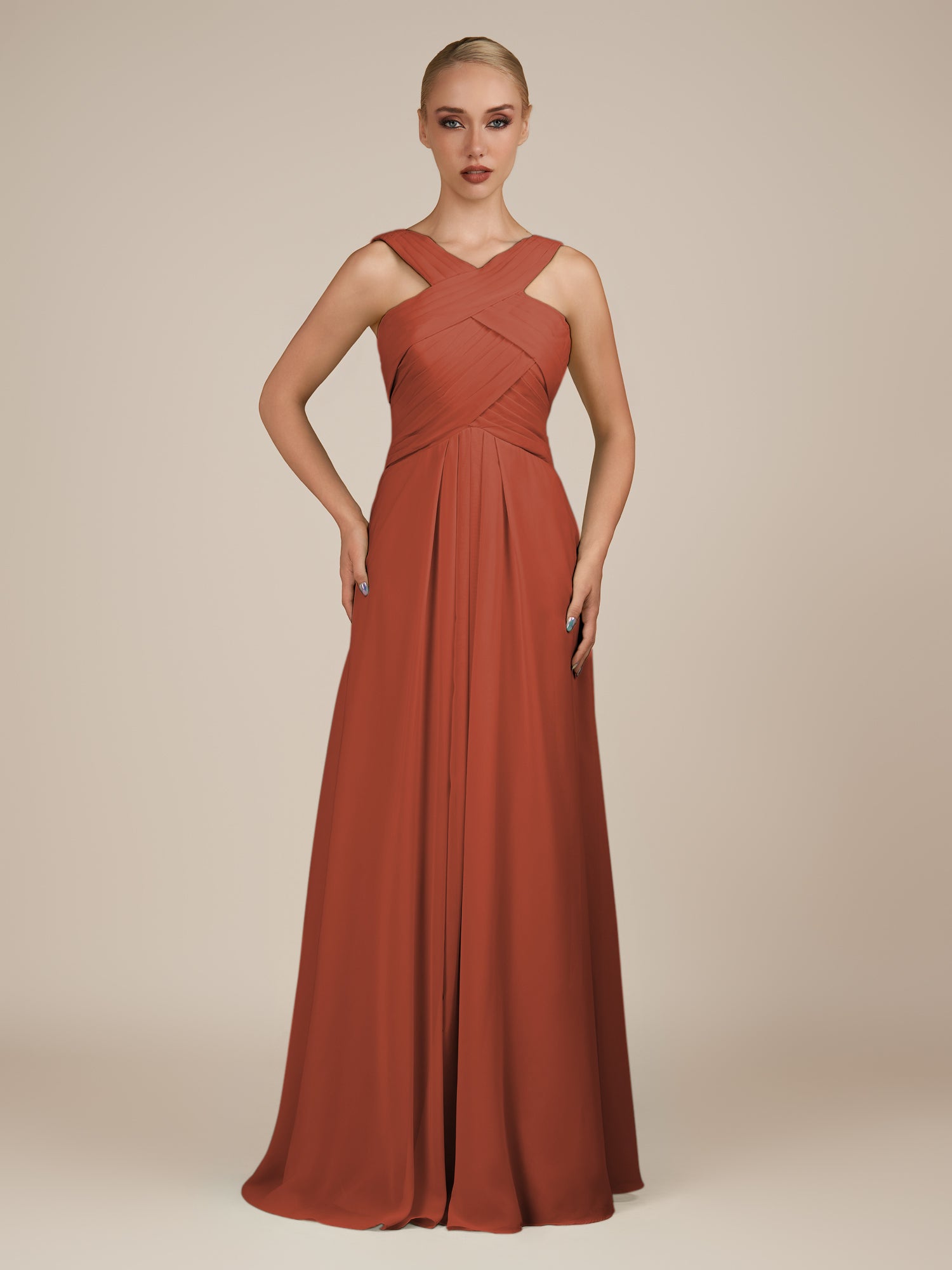 Sharlie is an elegant and refined choice for your bridal party. Crafted from soft chiffon, she features a flattering halter neckline and a sleeveless bodice for a modern, graceful look. Her floor-length A-line skirt flows effortlessly with every step, enhanced by delicate pleats that add texture and sophistication. Finished with a smooth zipper back, Sharlie combines timeless elegance with effortless style for weddings and special occasions.