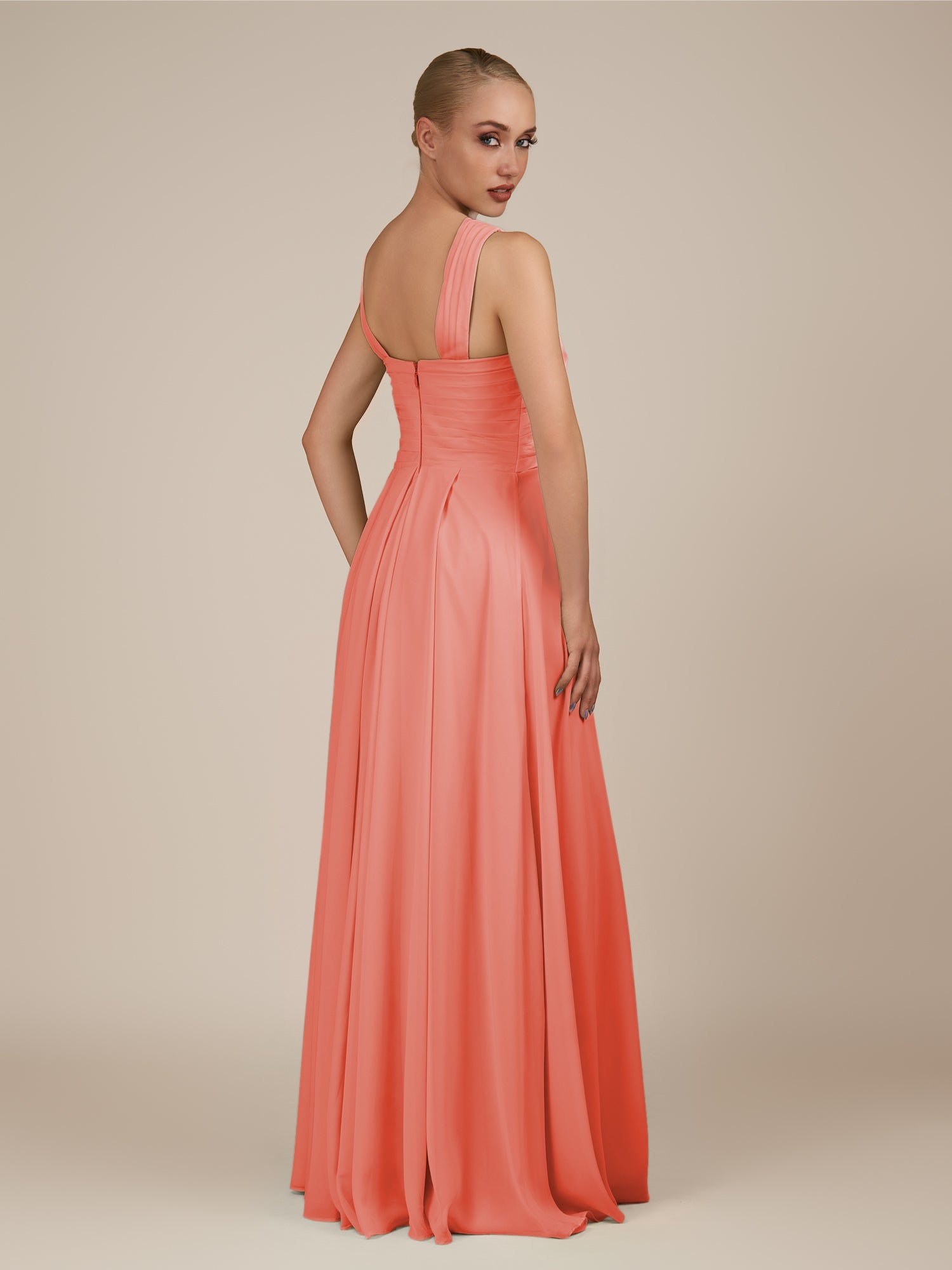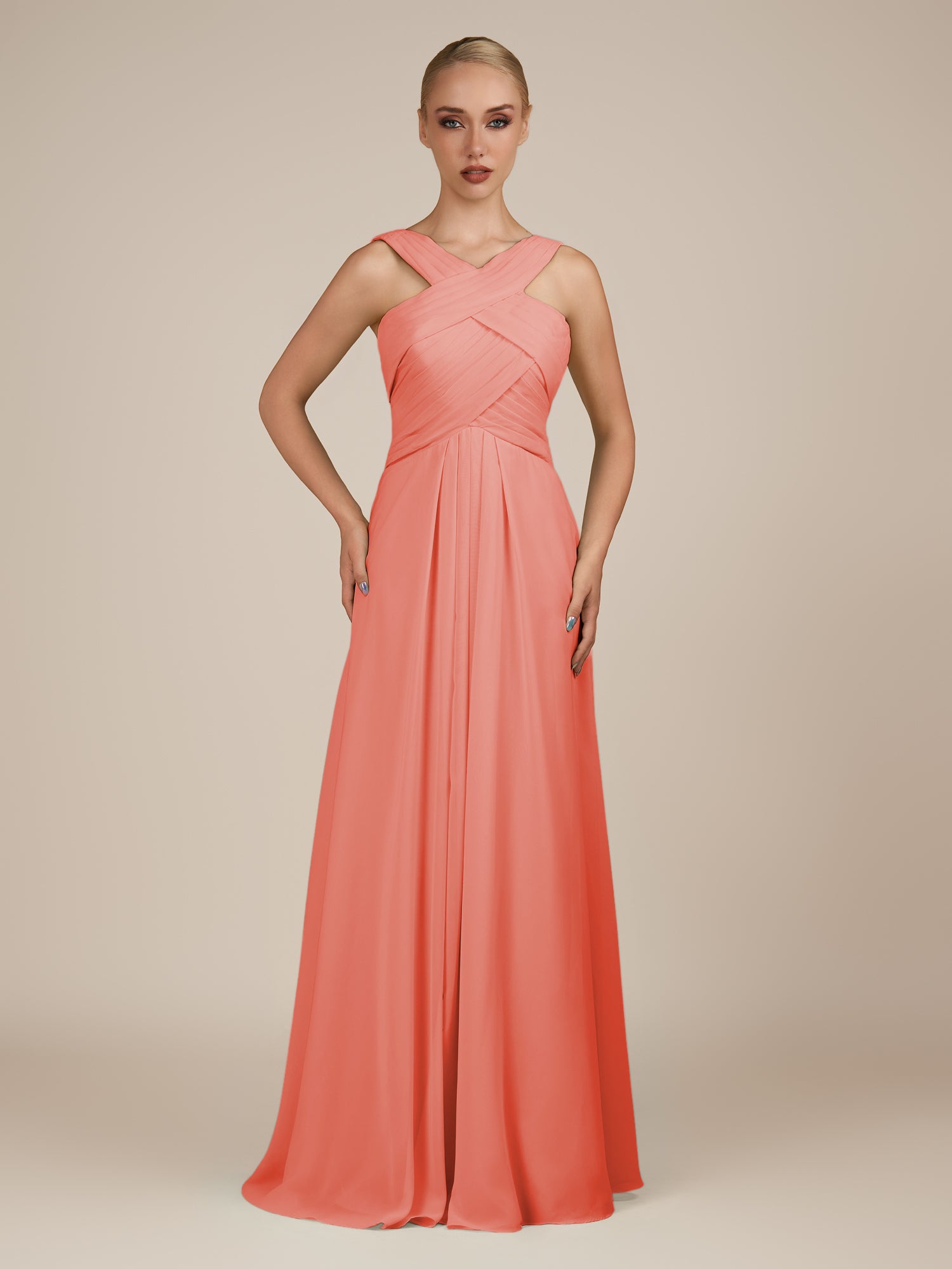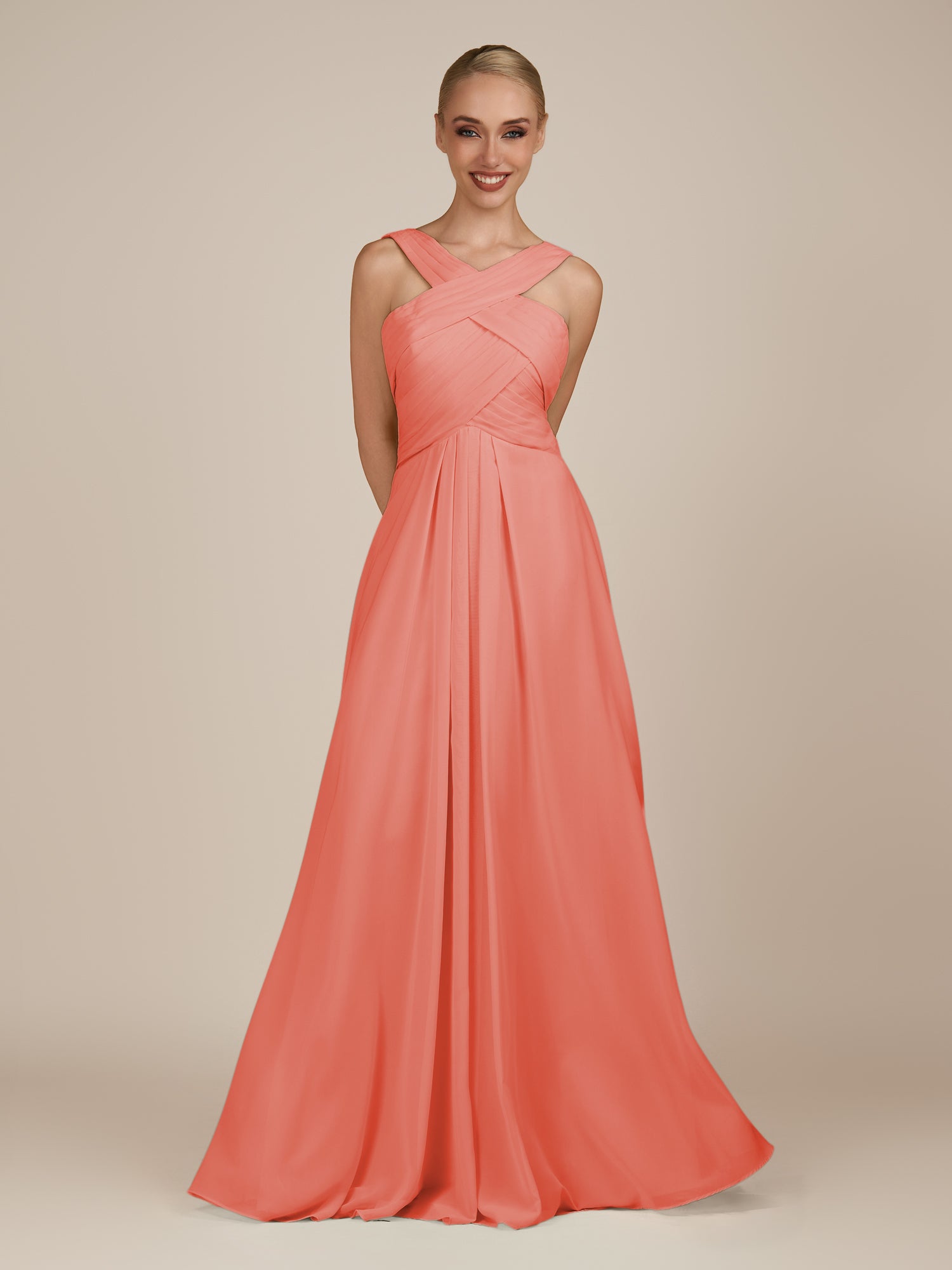 Sharlie is an elegant and refined choice for your bridal party. Crafted from soft chiffon, she features a flattering halter neckline and a sleeveless bodice for a modern, graceful look. Her floor-length A-line skirt flows effortlessly with every step, enhanced by delicate pleats that add texture and sophistication. Finished with a smooth zipper back, Sharlie combines timeless elegance with effortless style for weddings and special occasions.