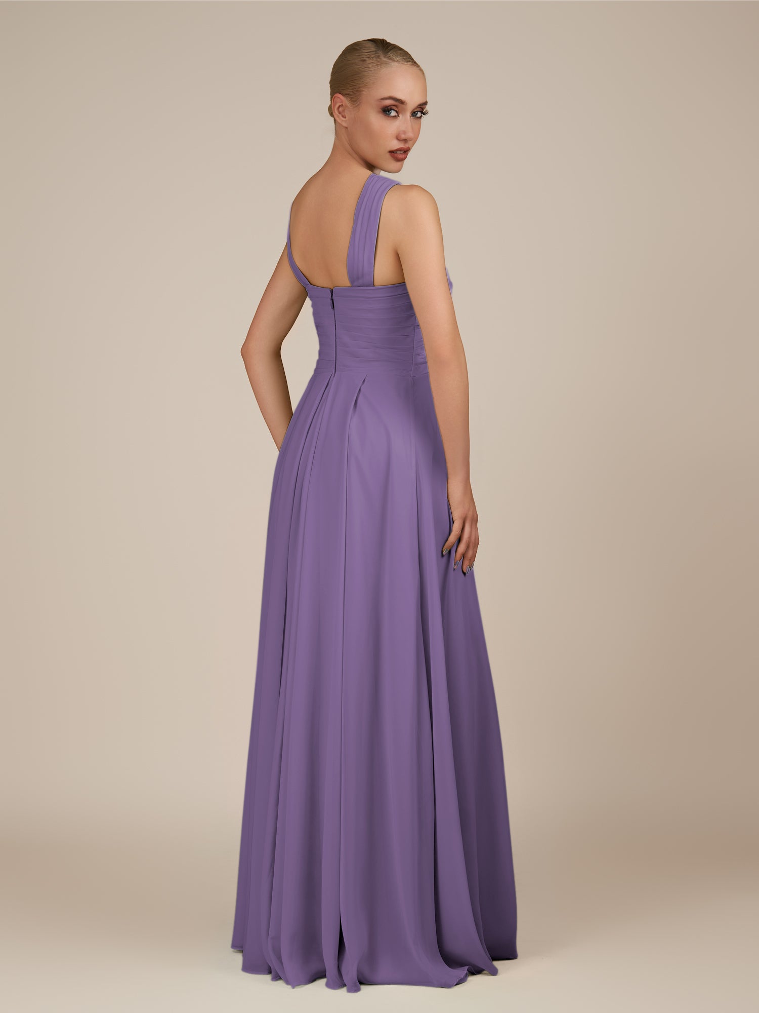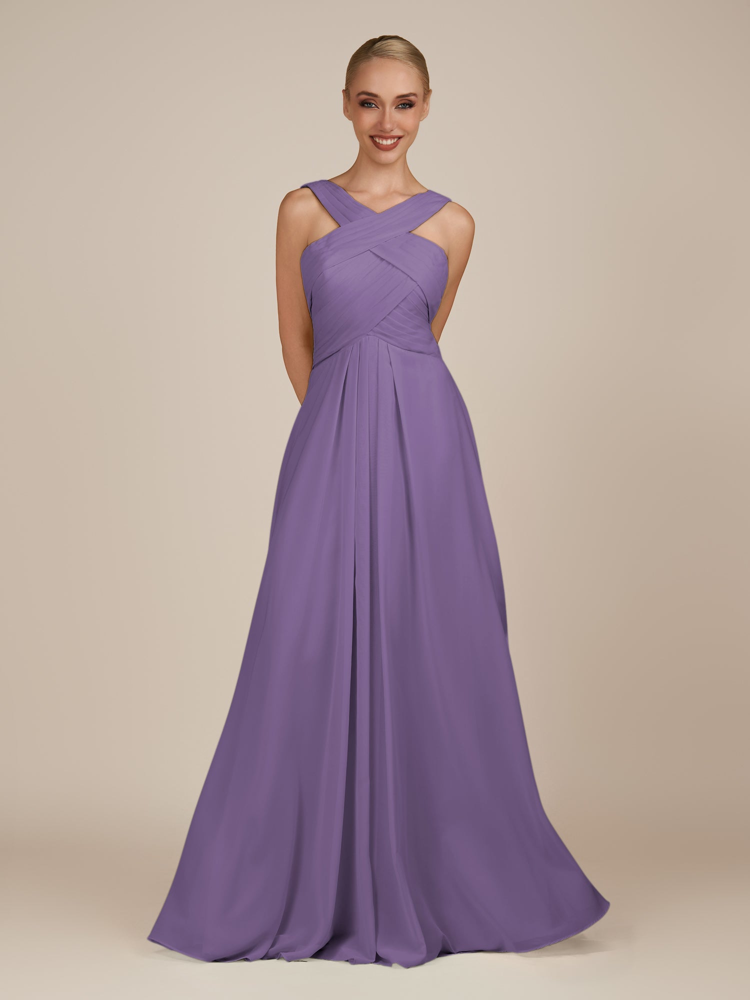 Sharlie is an elegant and refined choice for your bridal party. Crafted from soft chiffon, she features a flattering halter neckline and a sleeveless bodice for a modern, graceful look. Her floor-length A-line skirt flows effortlessly with every step, enhanced by delicate pleats that add texture and sophistication. Finished with a smooth zipper back, Sharlie combines timeless elegance with effortless style for weddings and special occasions.