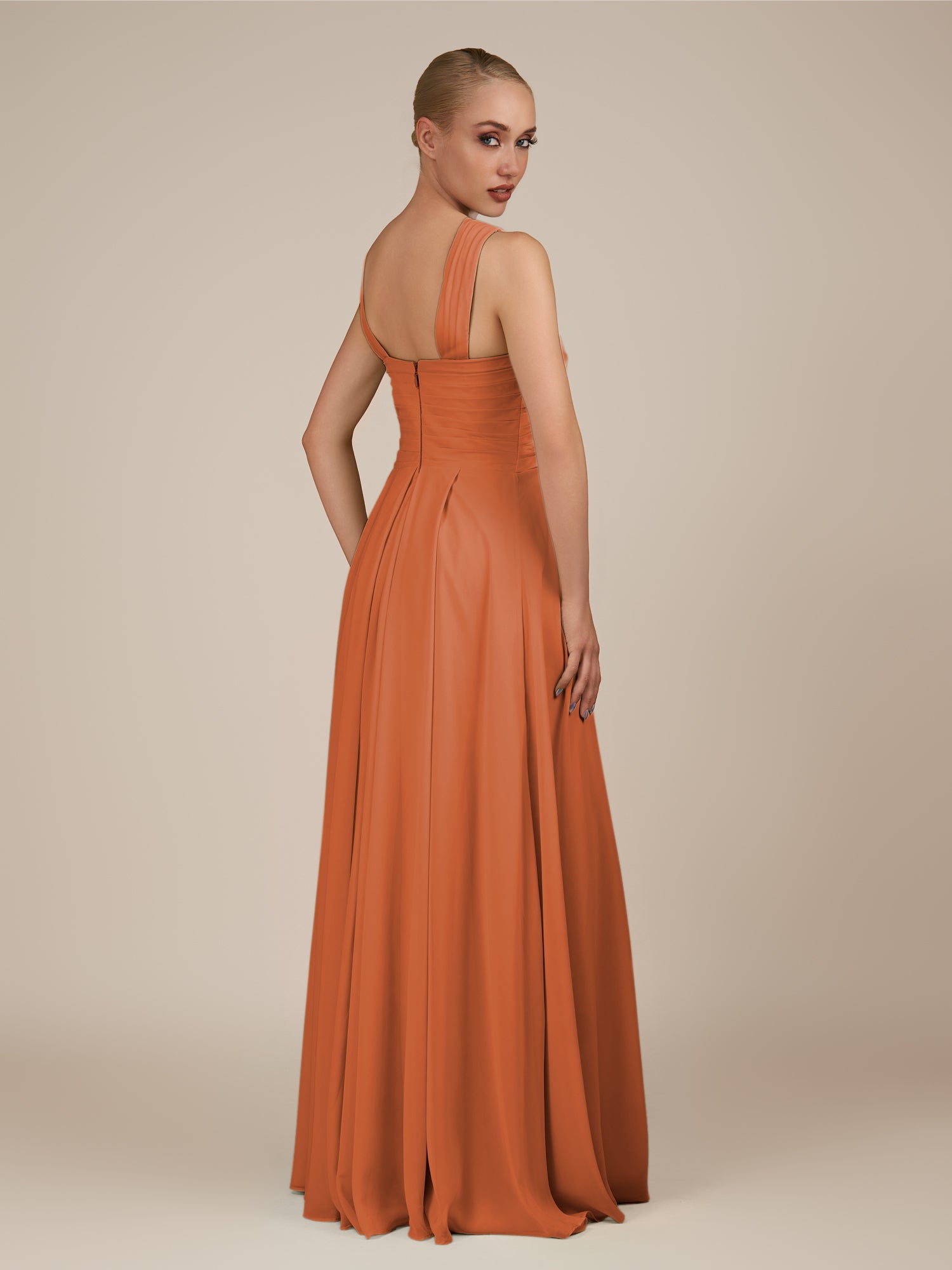Sharlie is an elegant and refined choice for your bridal party. Crafted from soft chiffon, she features a flattering halter neckline and a sleeveless bodice for a modern, graceful look. Her floor-length A-line skirt flows effortlessly with every step, enhanced by delicate pleats that add texture and sophistication. Finished with a smooth zipper back, Sharlie combines timeless elegance with effortless style for weddings and special occasions.