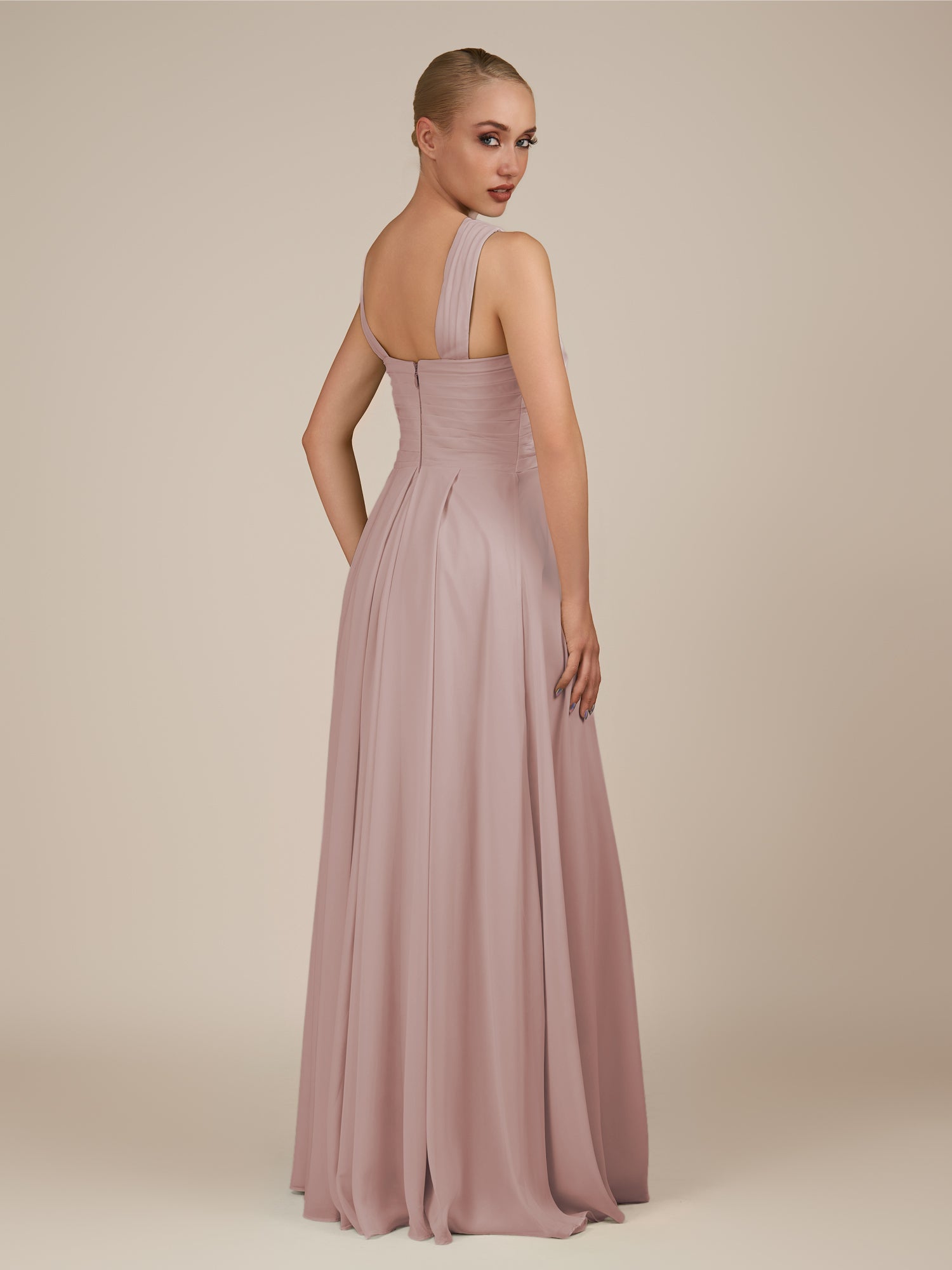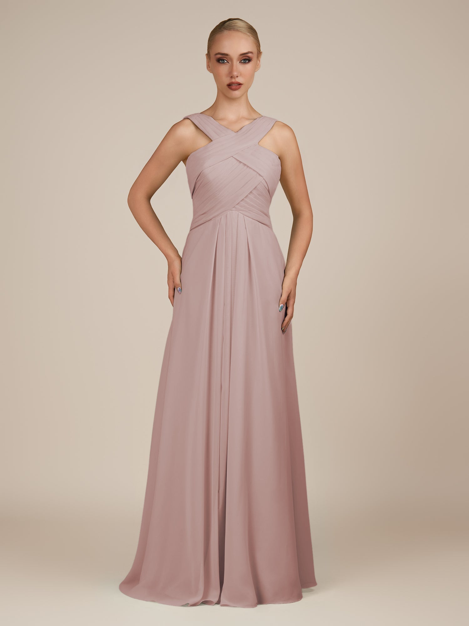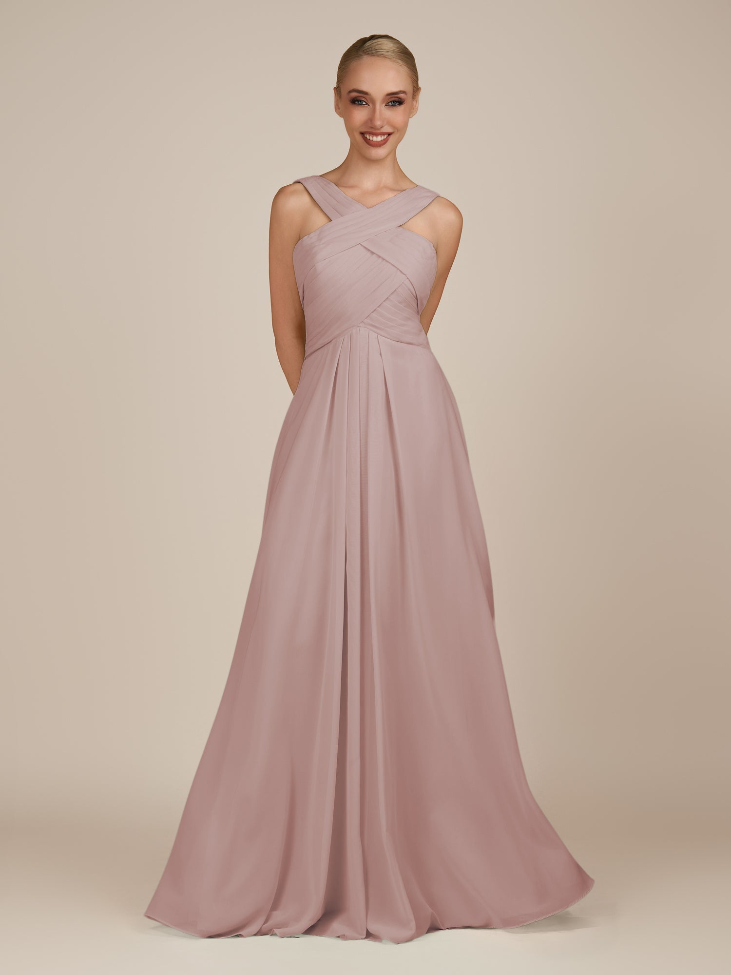Sharlie is an elegant and refined choice for your bridal party. Crafted from soft chiffon, she features a flattering halter neckline and a sleeveless bodice for a modern, graceful look. Her floor-length A-line skirt flows effortlessly with every step, enhanced by delicate pleats that add texture and sophistication. Finished with a smooth zipper back, Sharlie combines timeless elegance with effortless style for weddings and special occasions.