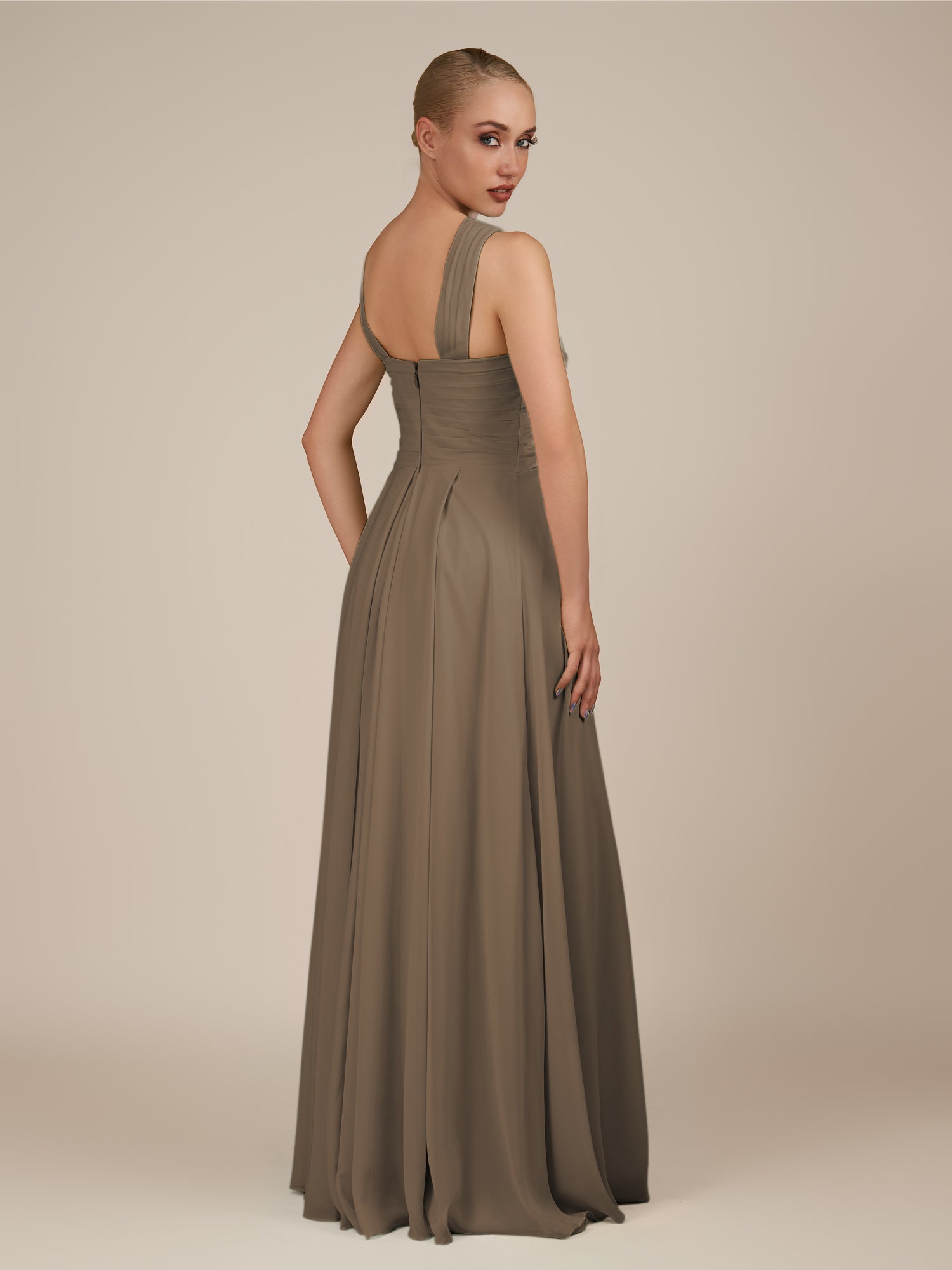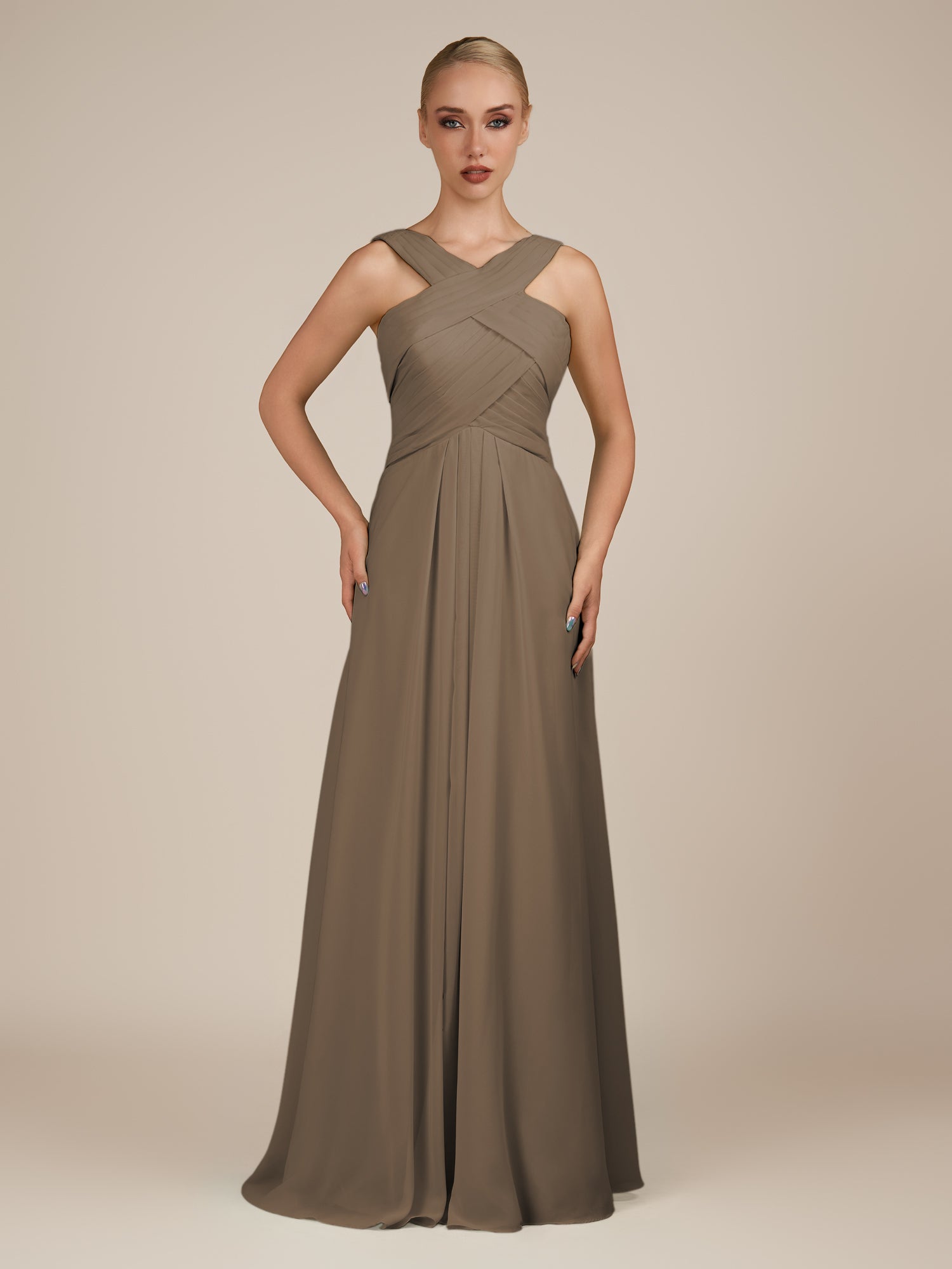Sharlie is an elegant and refined choice for your bridal party. Crafted from soft chiffon, she features a flattering halter neckline and a sleeveless bodice for a modern, graceful look. Her floor-length A-line skirt flows effortlessly with every step, enhanced by delicate pleats that add texture and sophistication. Finished with a smooth zipper back, Sharlie combines timeless elegance with effortless style for weddings and special occasions.