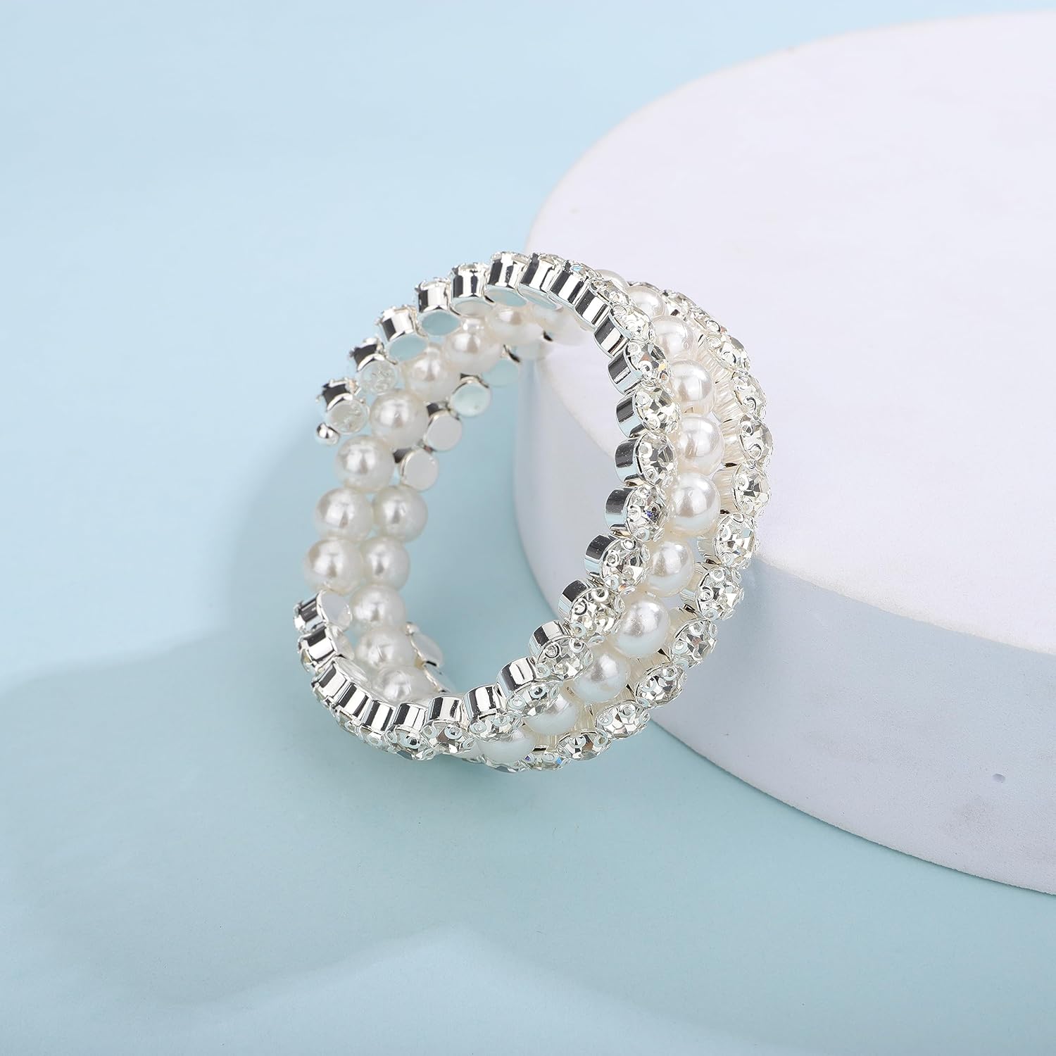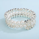 Silver 3 Row Pearl Layered Adjustable Stretch Wrap Cuff Bracelets with Rhinestone