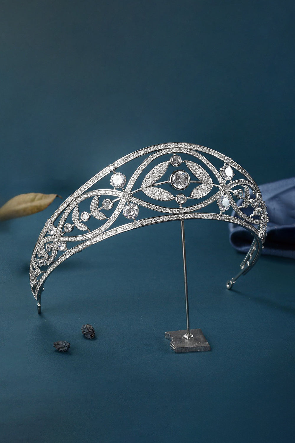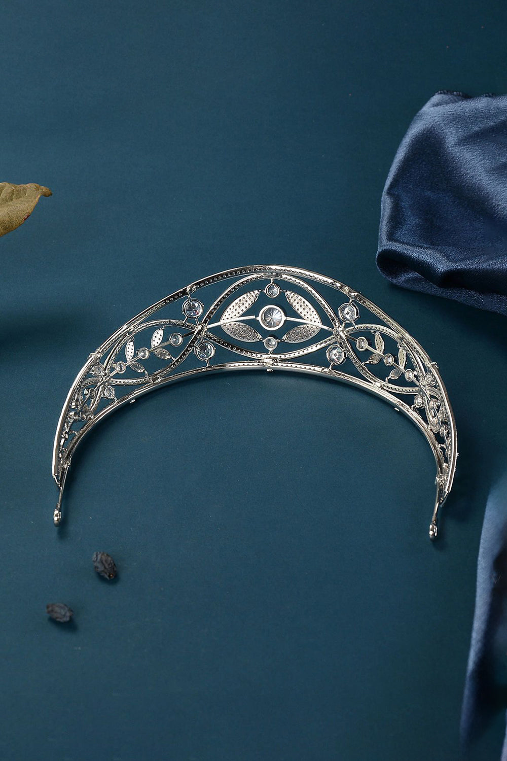 Discover our exquisite zirconia tiara, a symbol of refined elegance and artistry. It features a delicate, openwork design with intricate leaf motifs and interwoven patterns, each encrusted with radiant zircon stones.The flowing lines and organic shapes create a harmonious and graceful appearance.Let your elegance shine through.