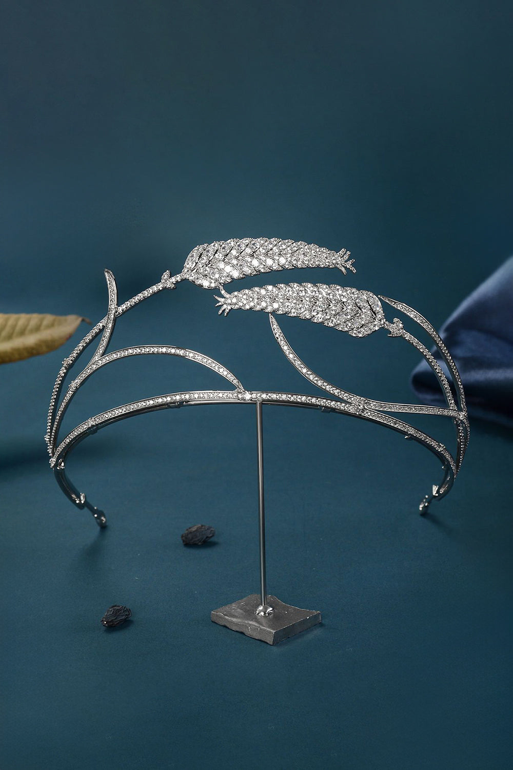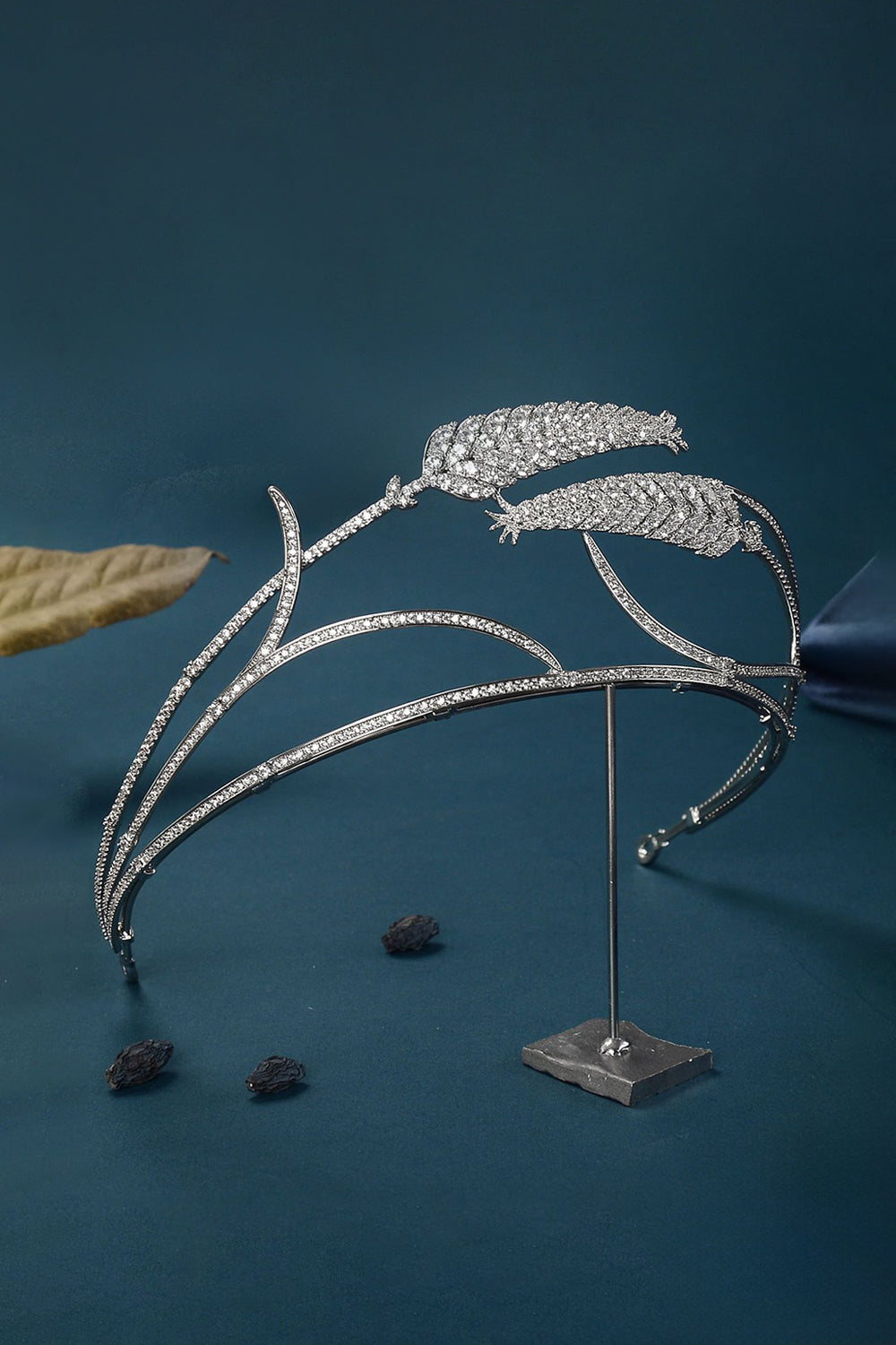 The Wheat Zircon Tiara is a stunning piece that features delicate wheat motifs, intricately adorned with sparkling zirconia stones. The graceful curves and elegant design evoke a sense of natural beauty and sophistication, making it a perfect accessory for special occasions.