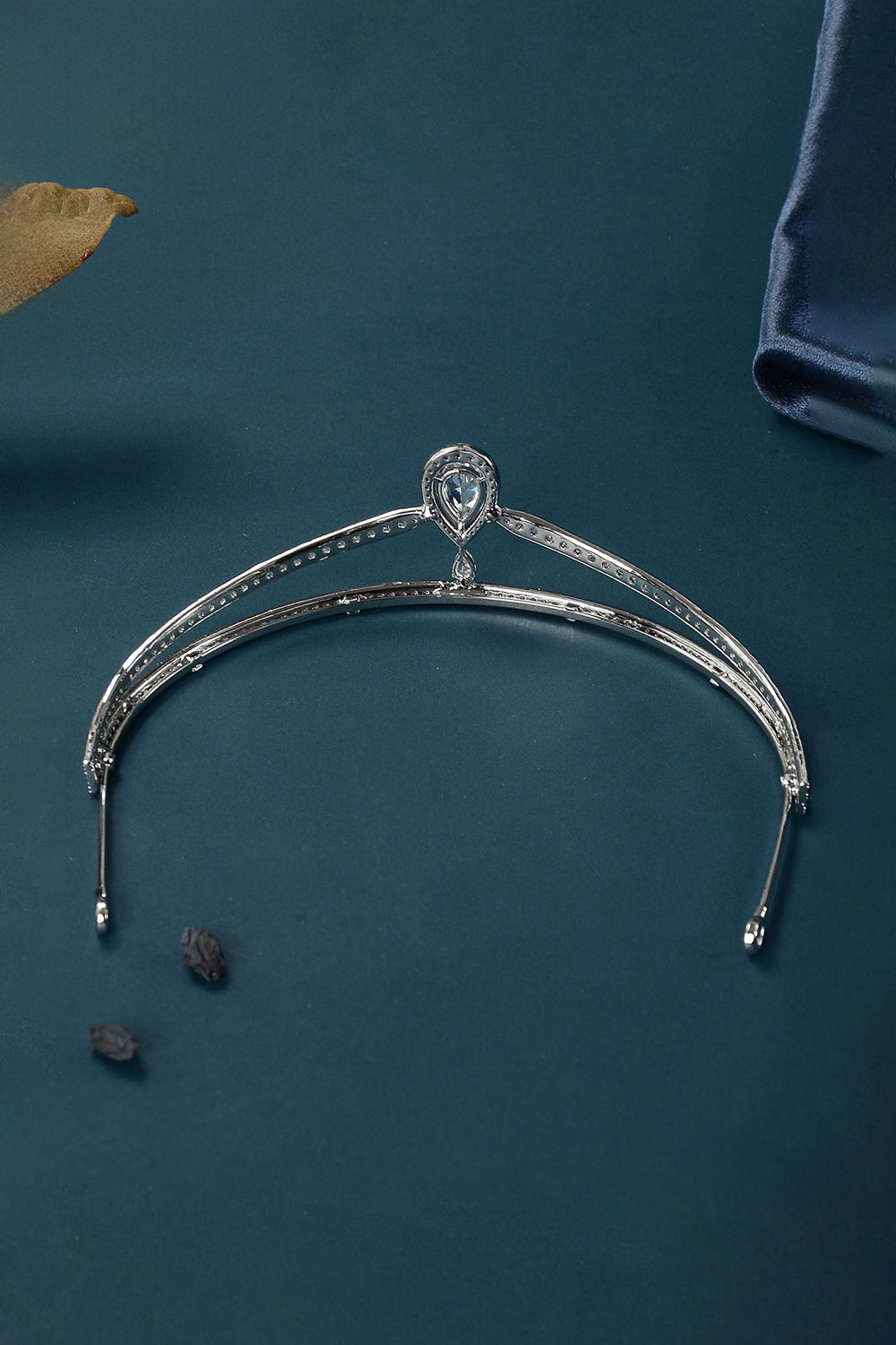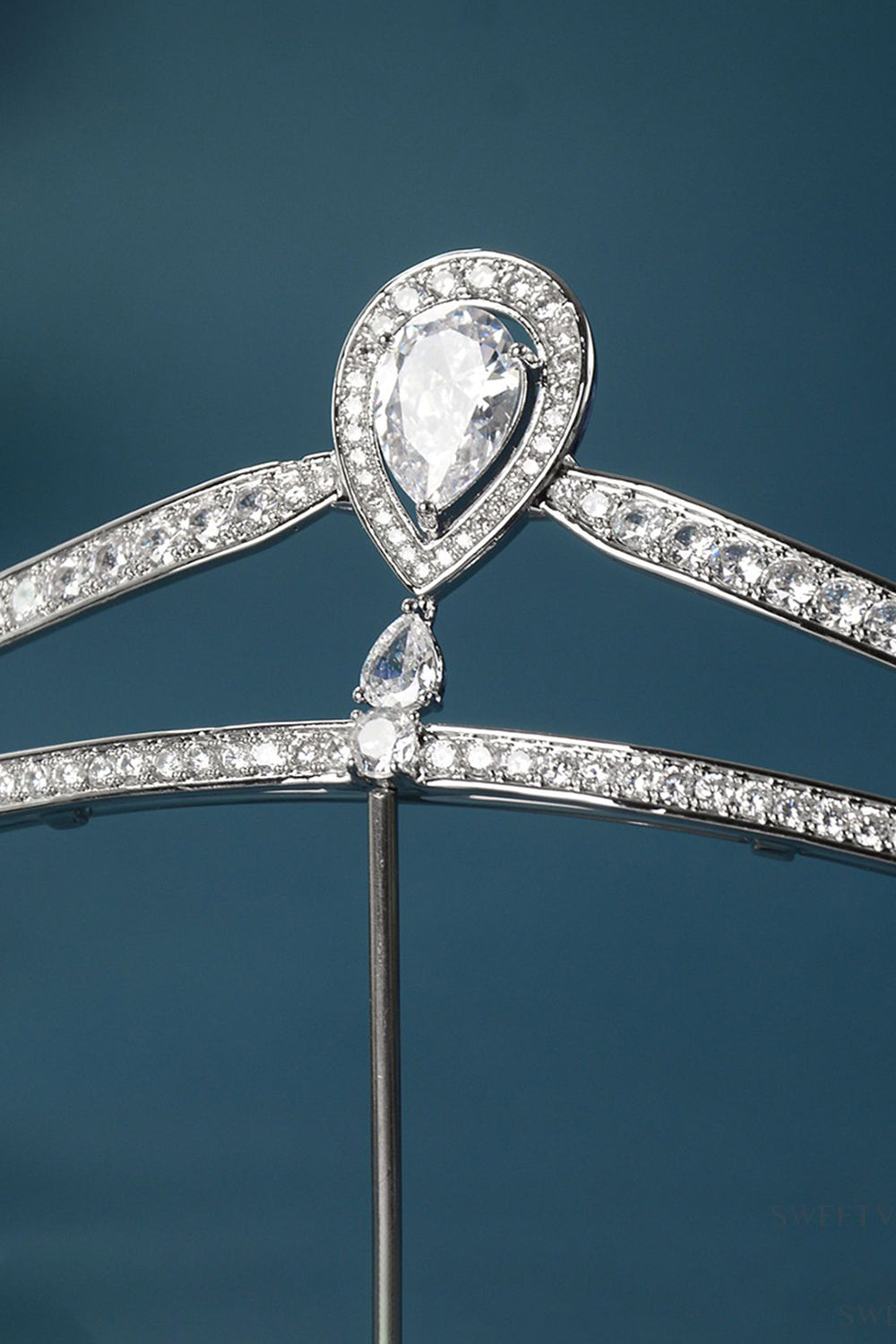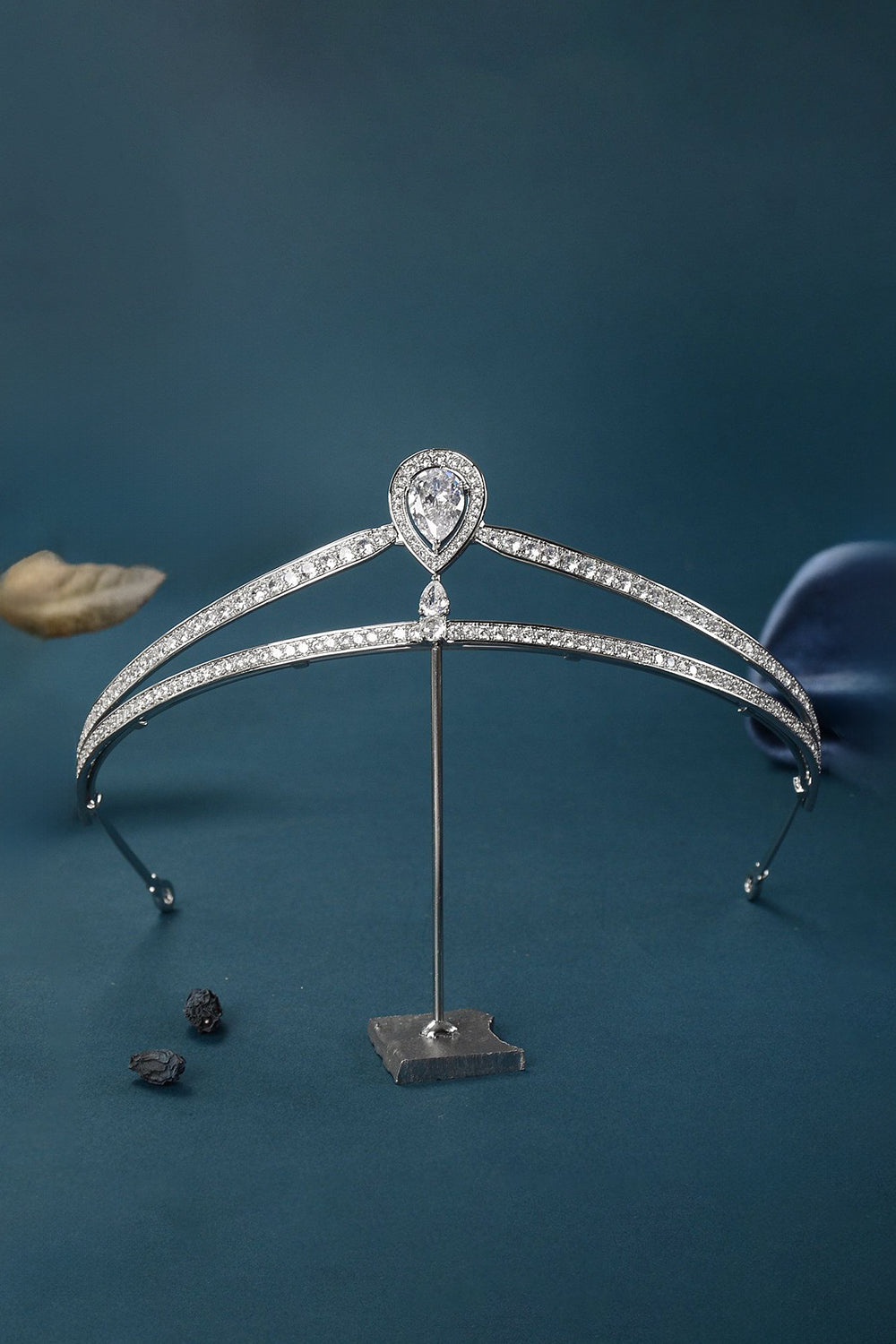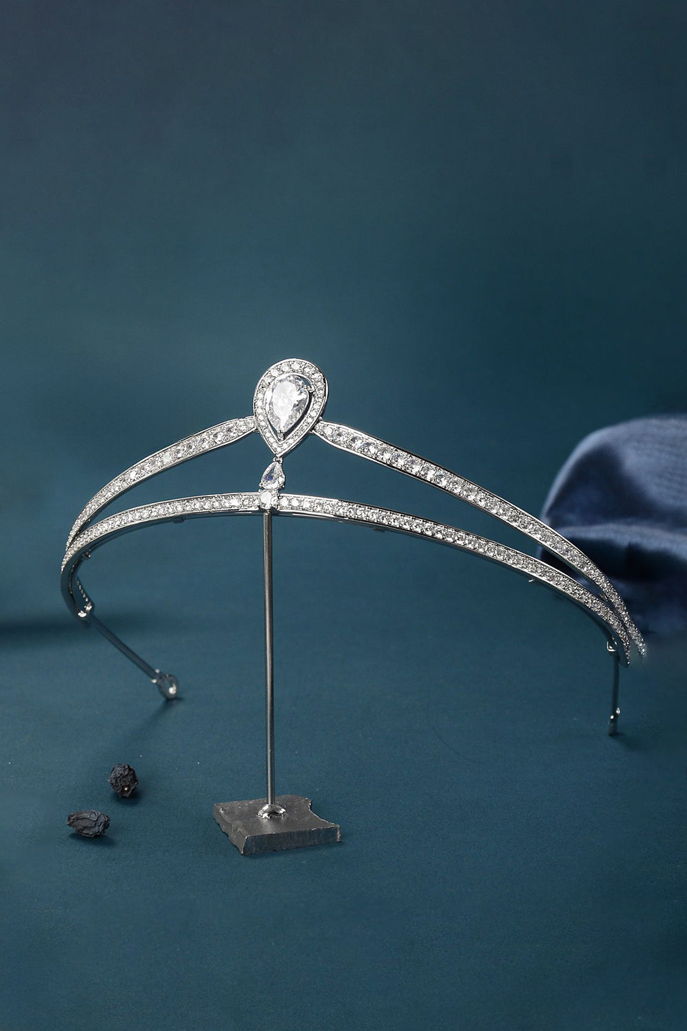 SV Linda Tiara exudes classic charm with its minimalist design, highlighted by a prominent teardrop-shaped zirconia stone at the center. The sleek lines and sparkling zirconia accents create a refined and graceful look, perfect for any special occasion.
