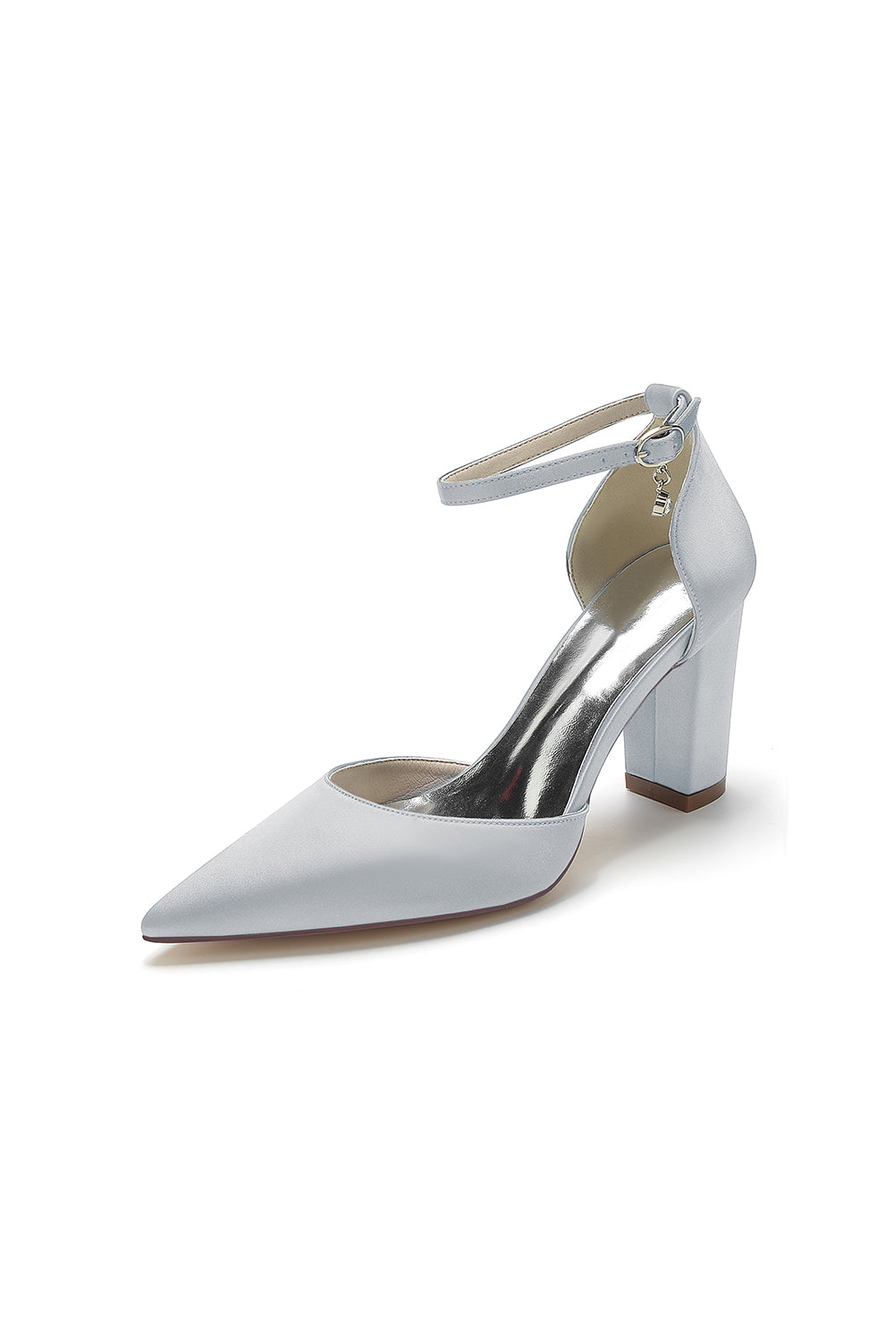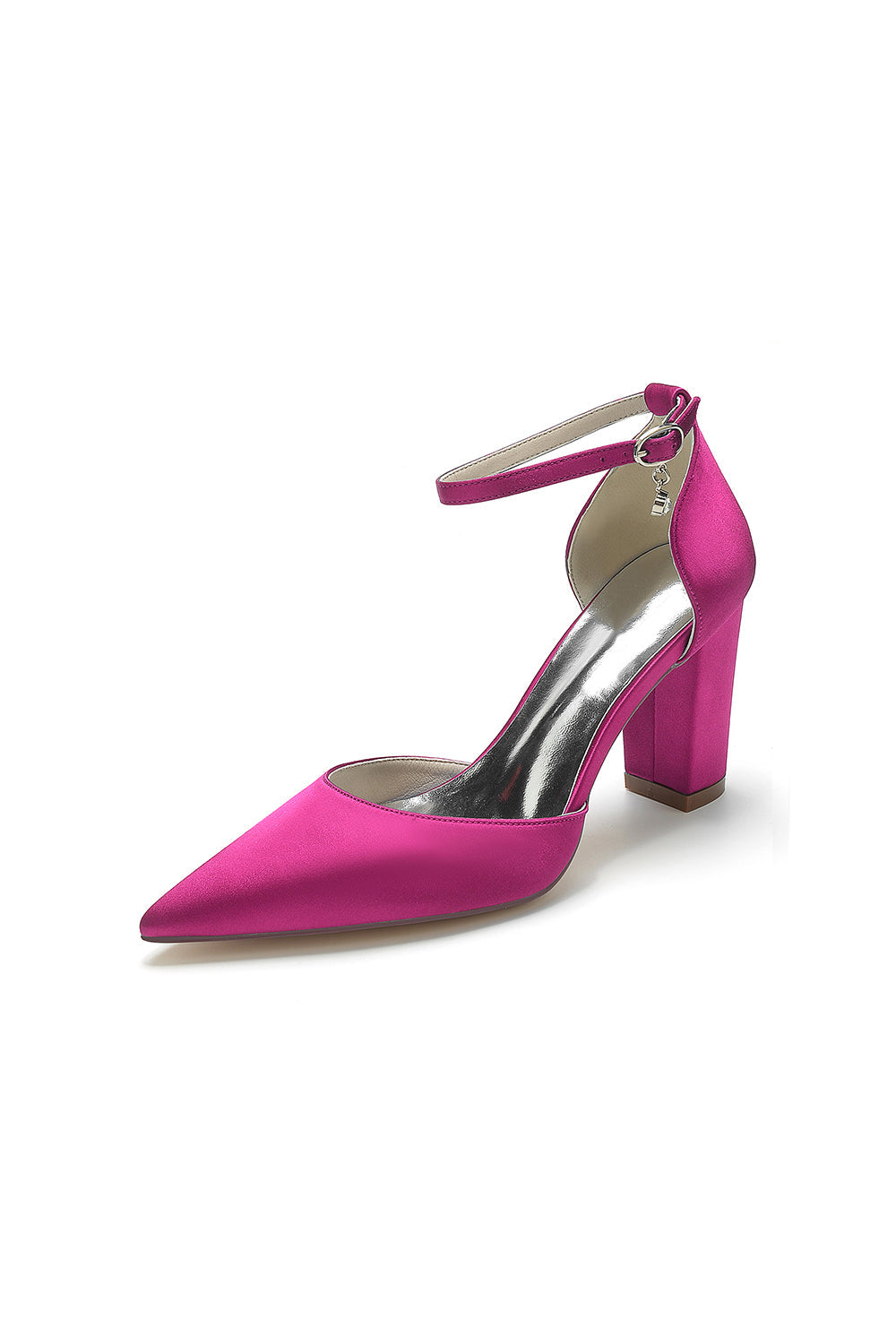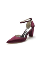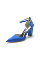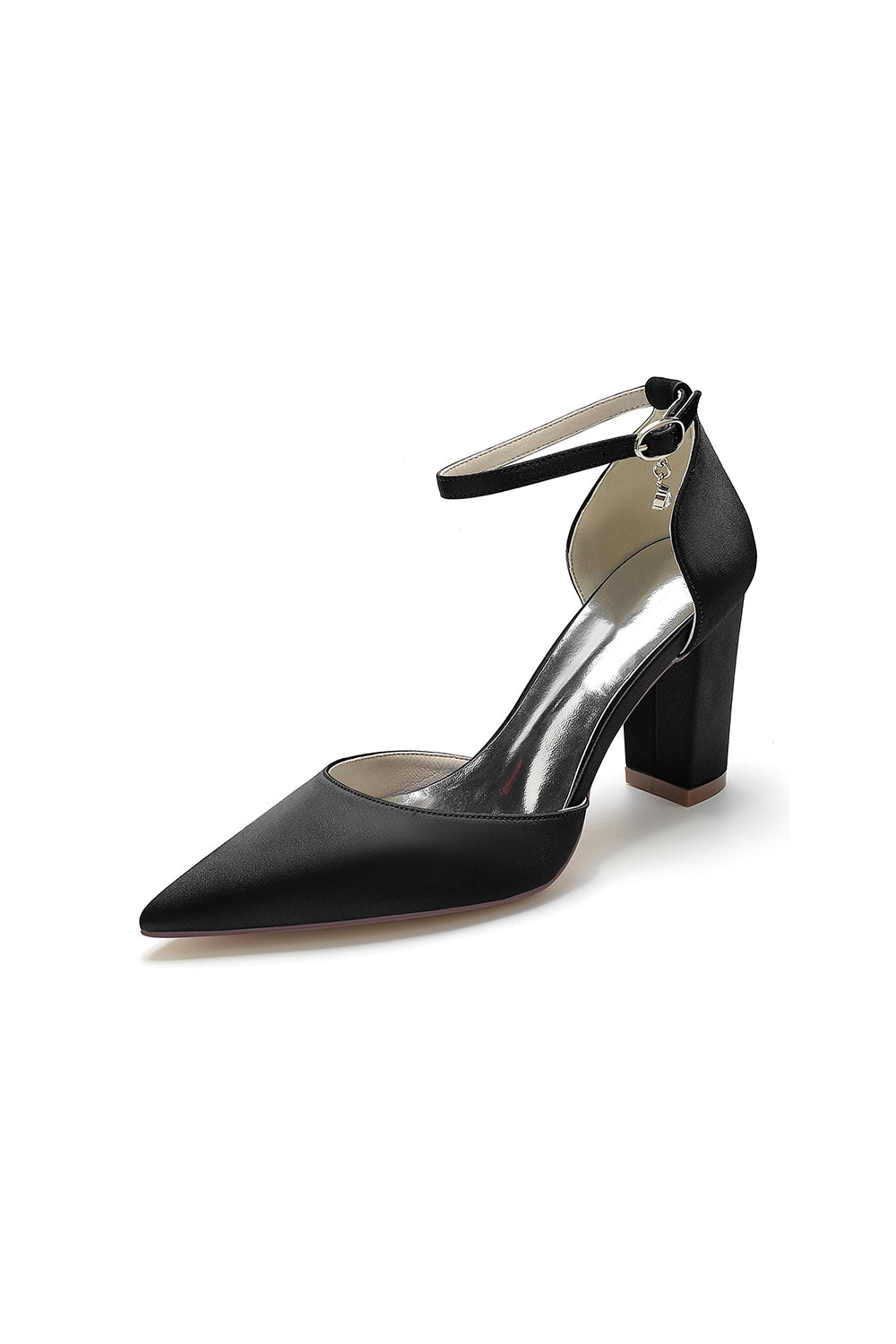 Elevate your look with our Simple Satin Pointed Toe Ankle Strap Chunky Heels. these heels are made from luxurious satin, feature a pointed toe for a sleek and sophisticated style. The ankle strap adds support and the chunky heel provides all-day comfort. Perfect for any occasion with a touch of elegance.