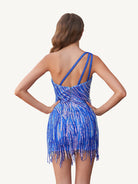 Sparkly Blue One Shoulder Sequins Tight Short Hoco Dress with Fringes