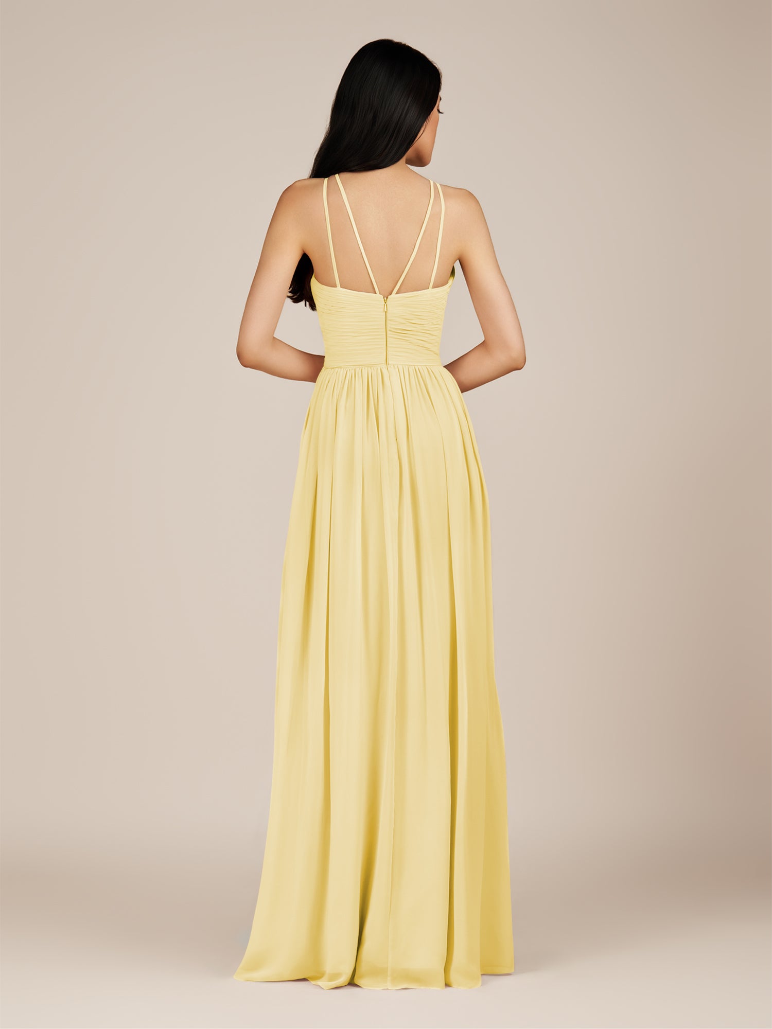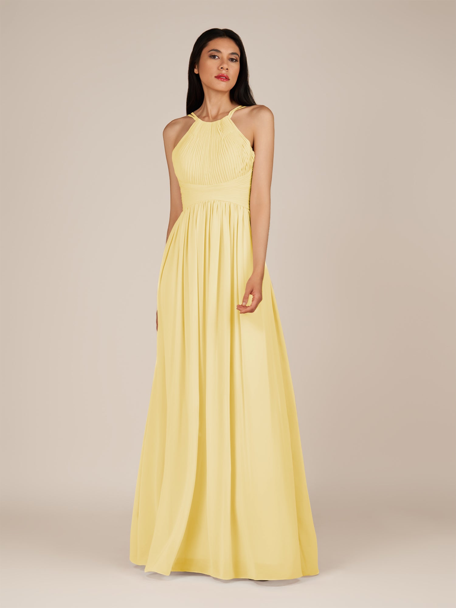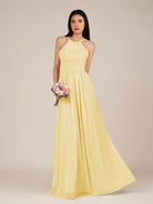 Ursa | Pastel Yellow - A Line Chiffon Halter Neck Long Bridesmaid Dress with Pleats