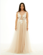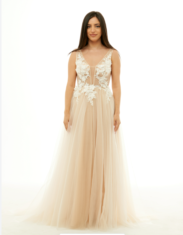 - Length: Floor-length with sweep train