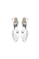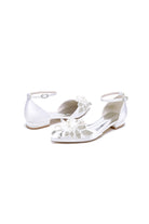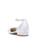 Elegant white pointed toe ankle strap low heels embellished with sparkling rhinestones, perfect for adding a touch of glamour to any outfit.