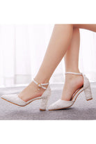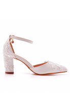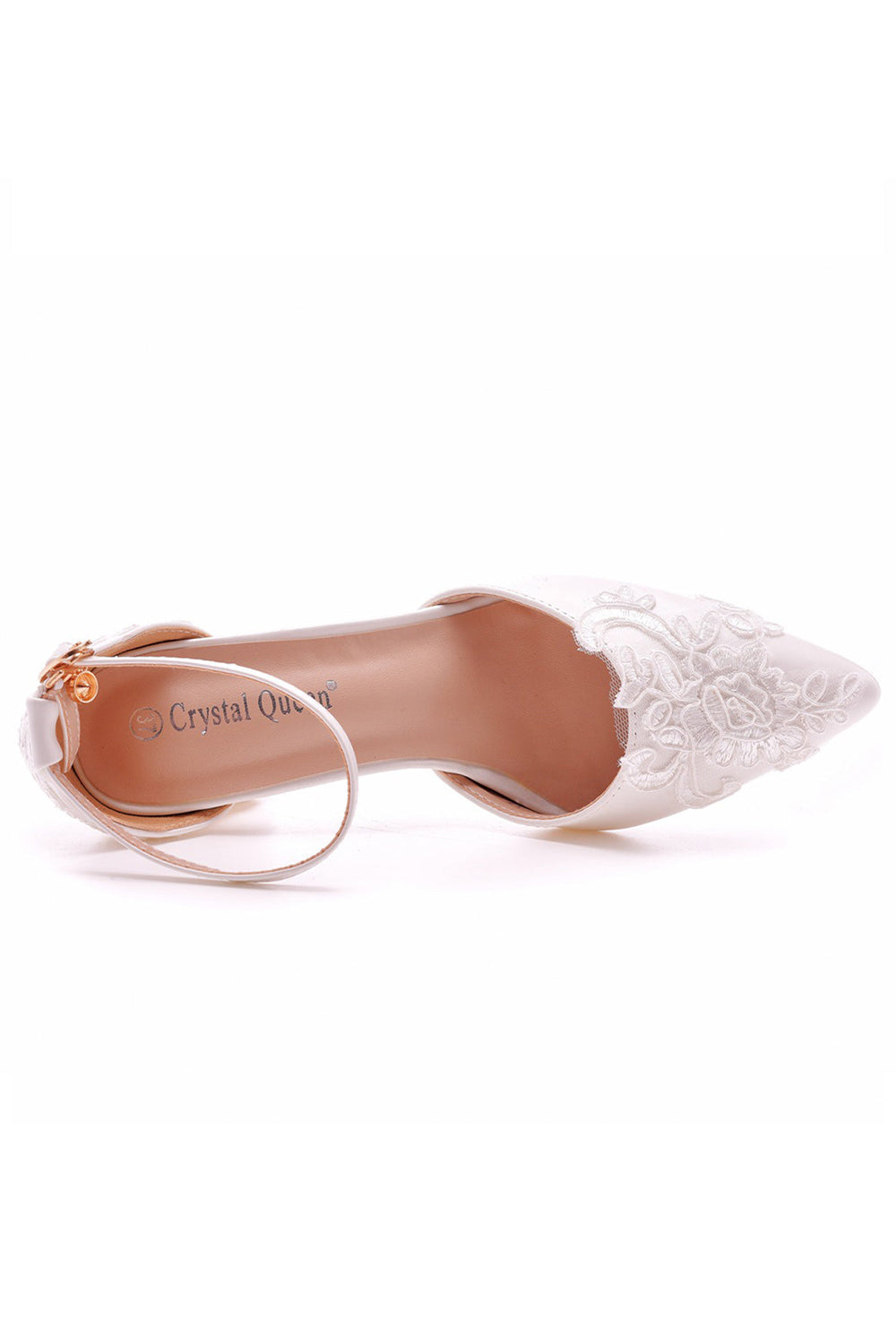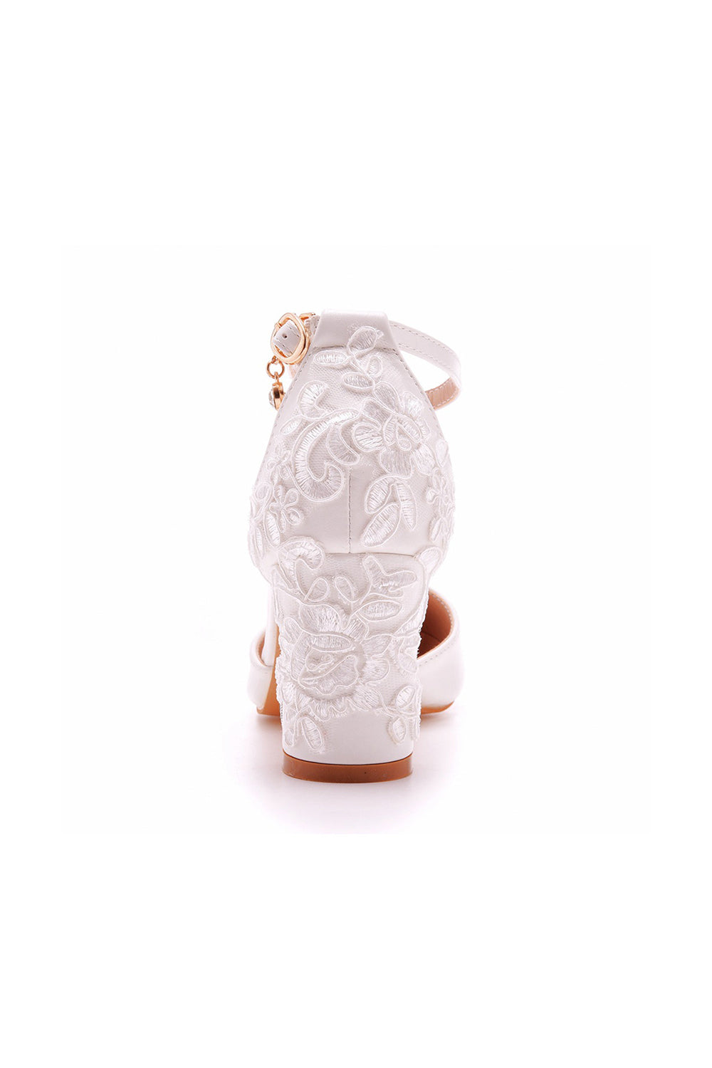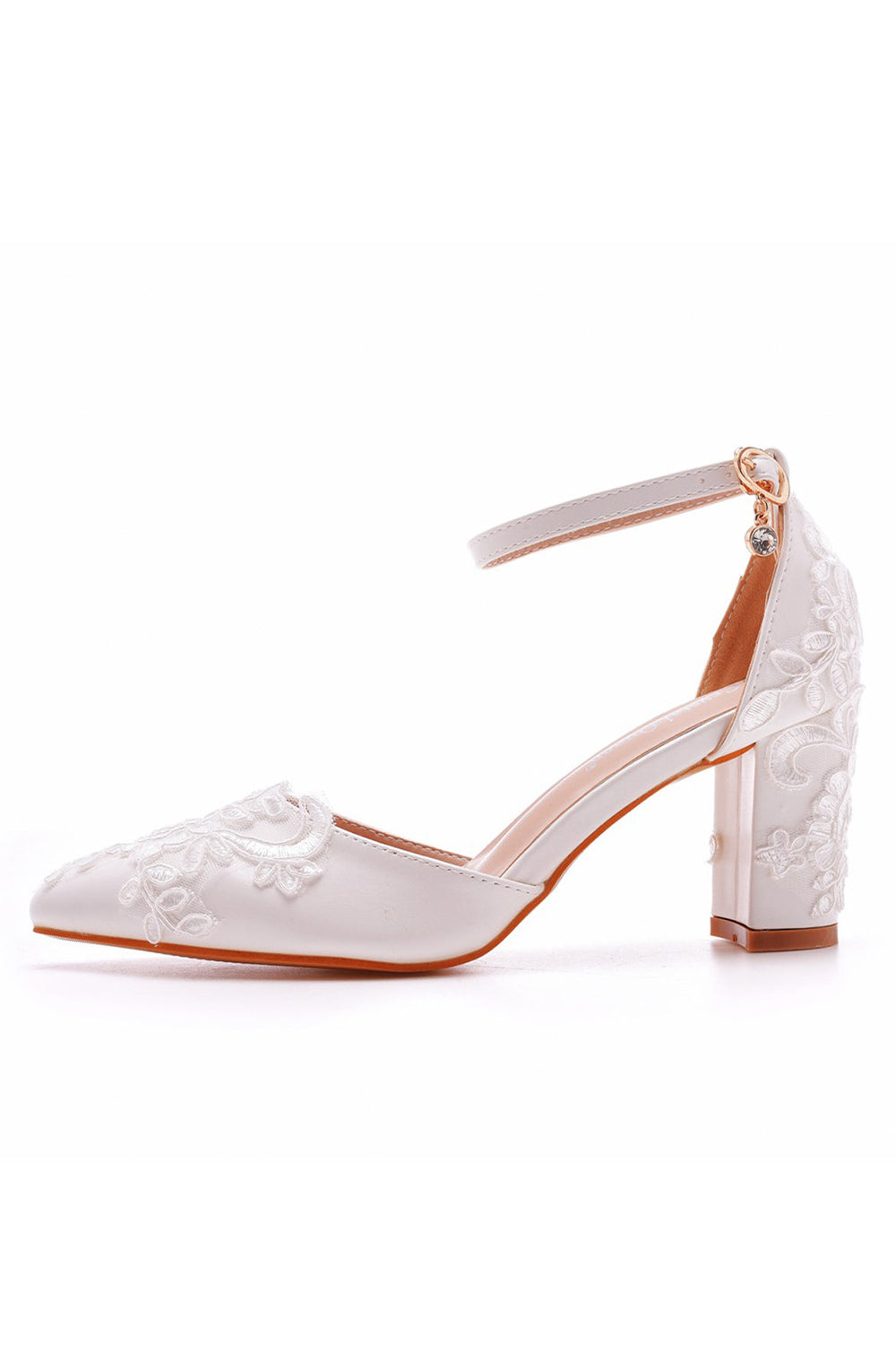 White Pointed Toe Lace Ankle Strap Chunky Heels