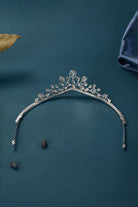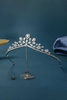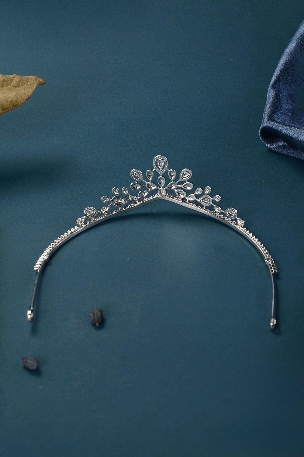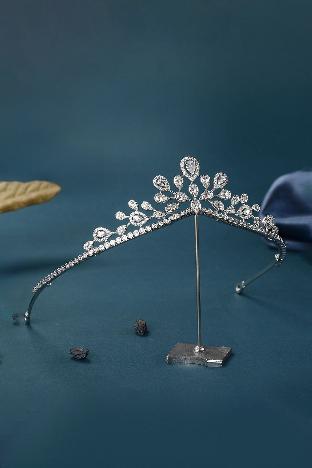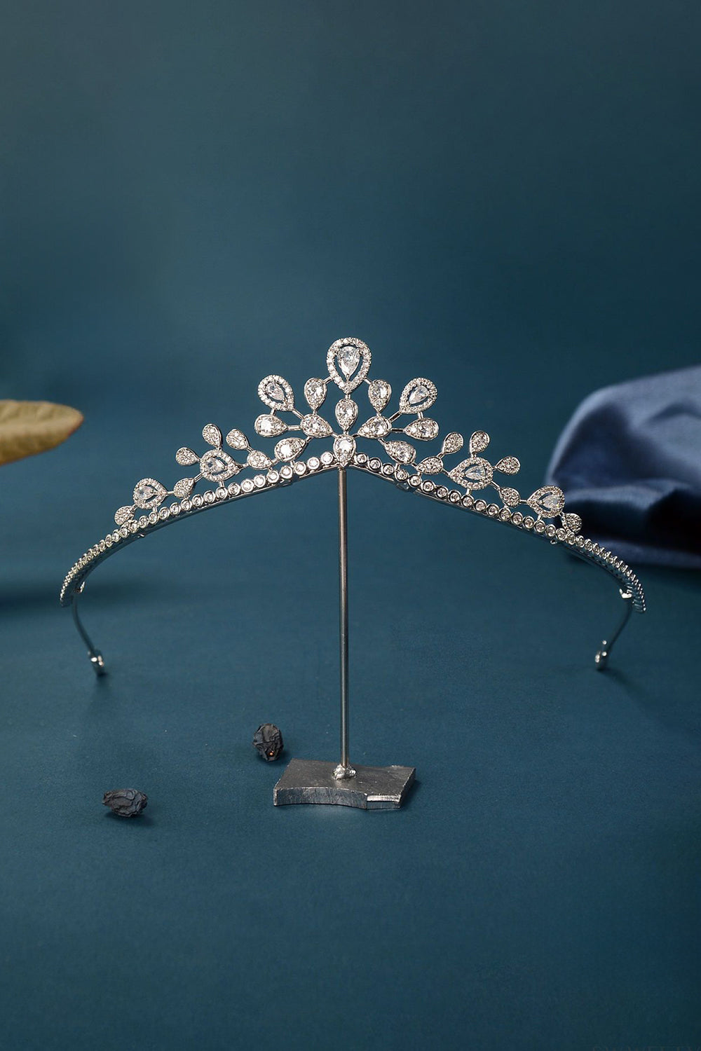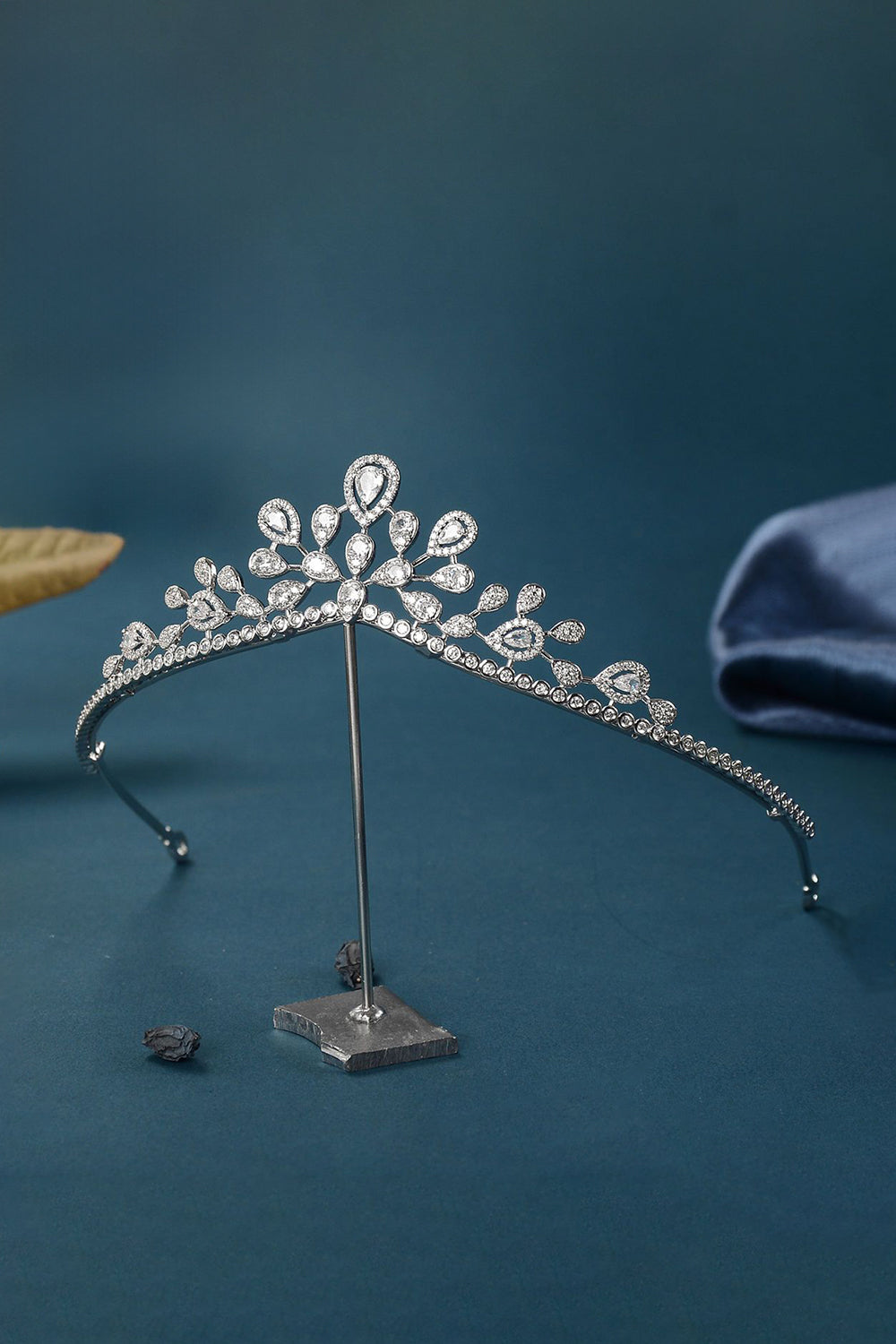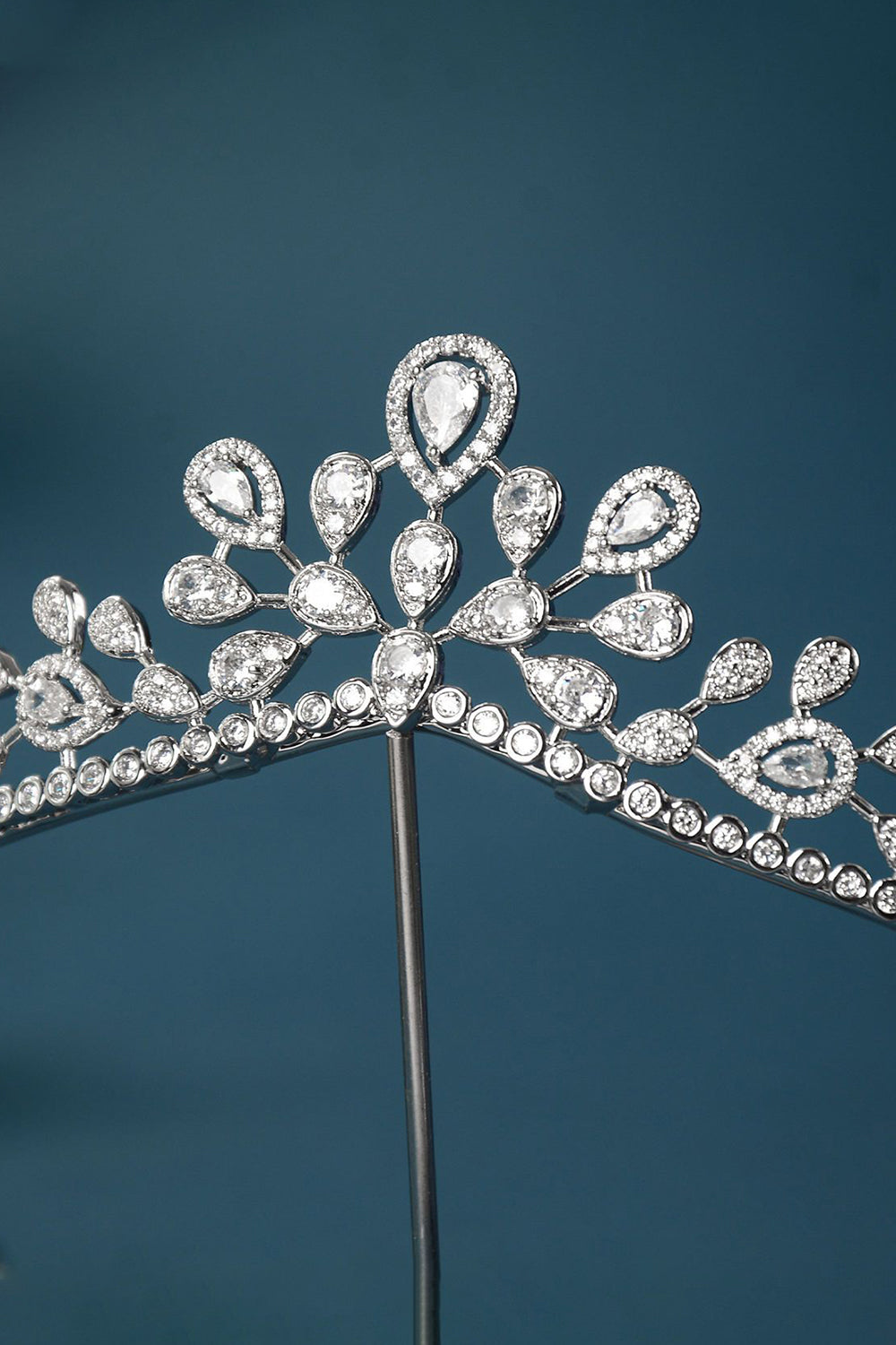 This tiara features a delicate design with teardrop-shaped zircon stones arranged in a radiant pattern, resembling a blossoming flower. The central teardrop zircon serves as a striking focal point, surrounded by smaller stones that enhance the crown's brilliance. A row of round zircons lines the base, adding an extra touch of sparkle.?