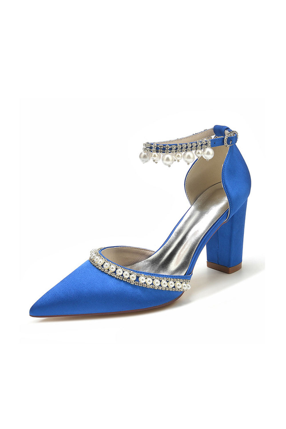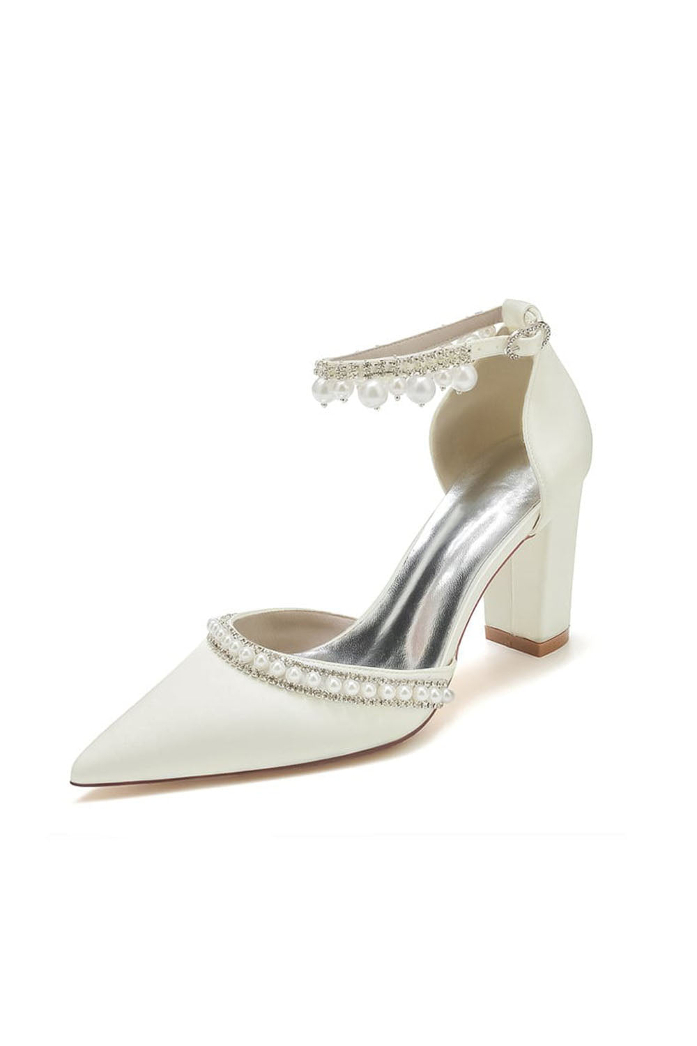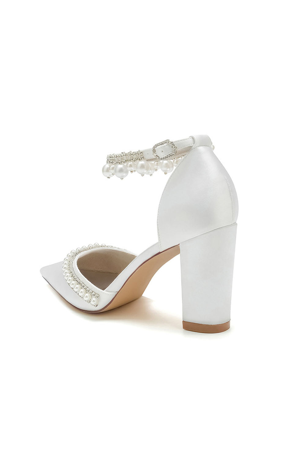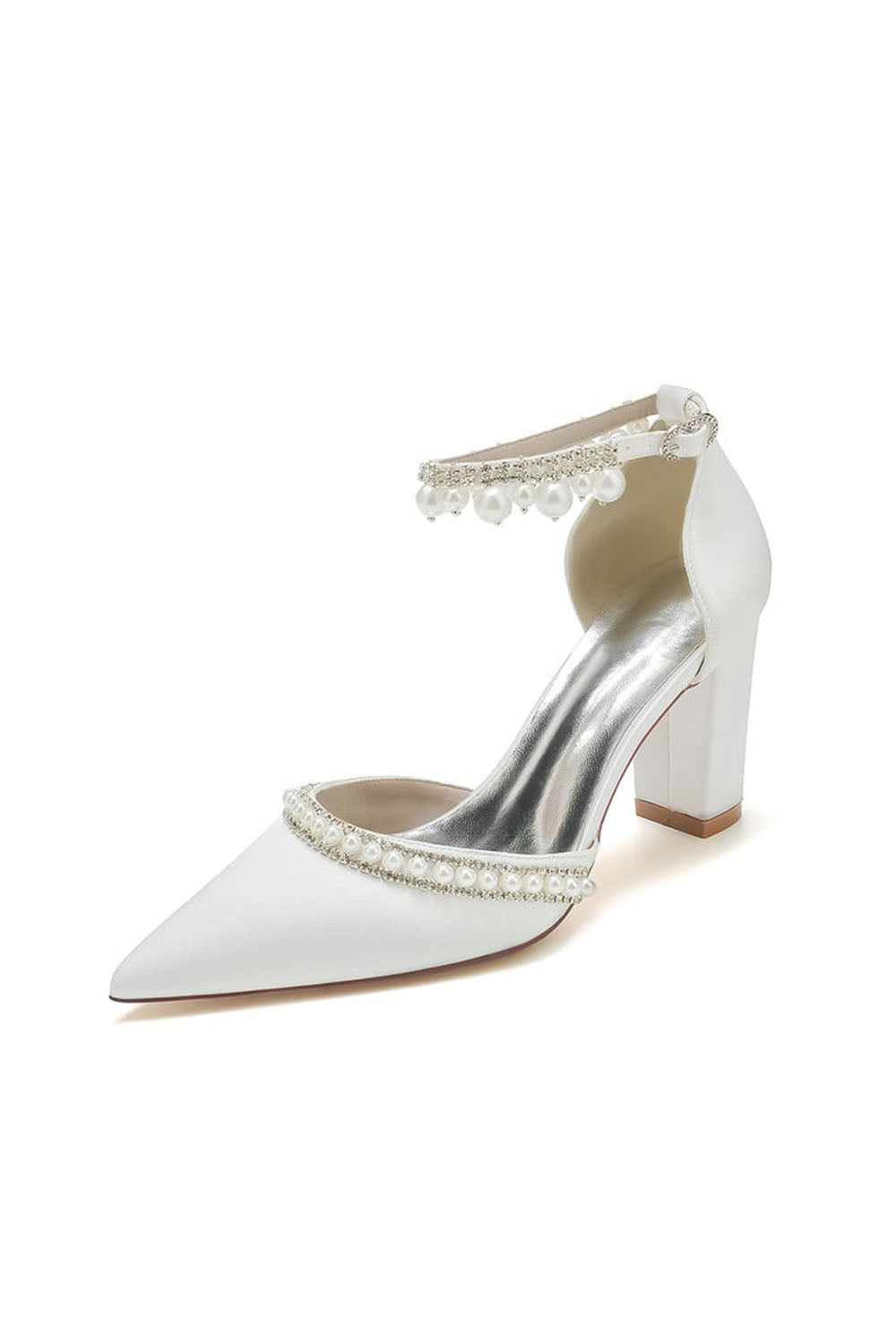 Women's Wedding Shoes Satin Block Heel Pearl Rhinestone Tassel Wedding Shoes