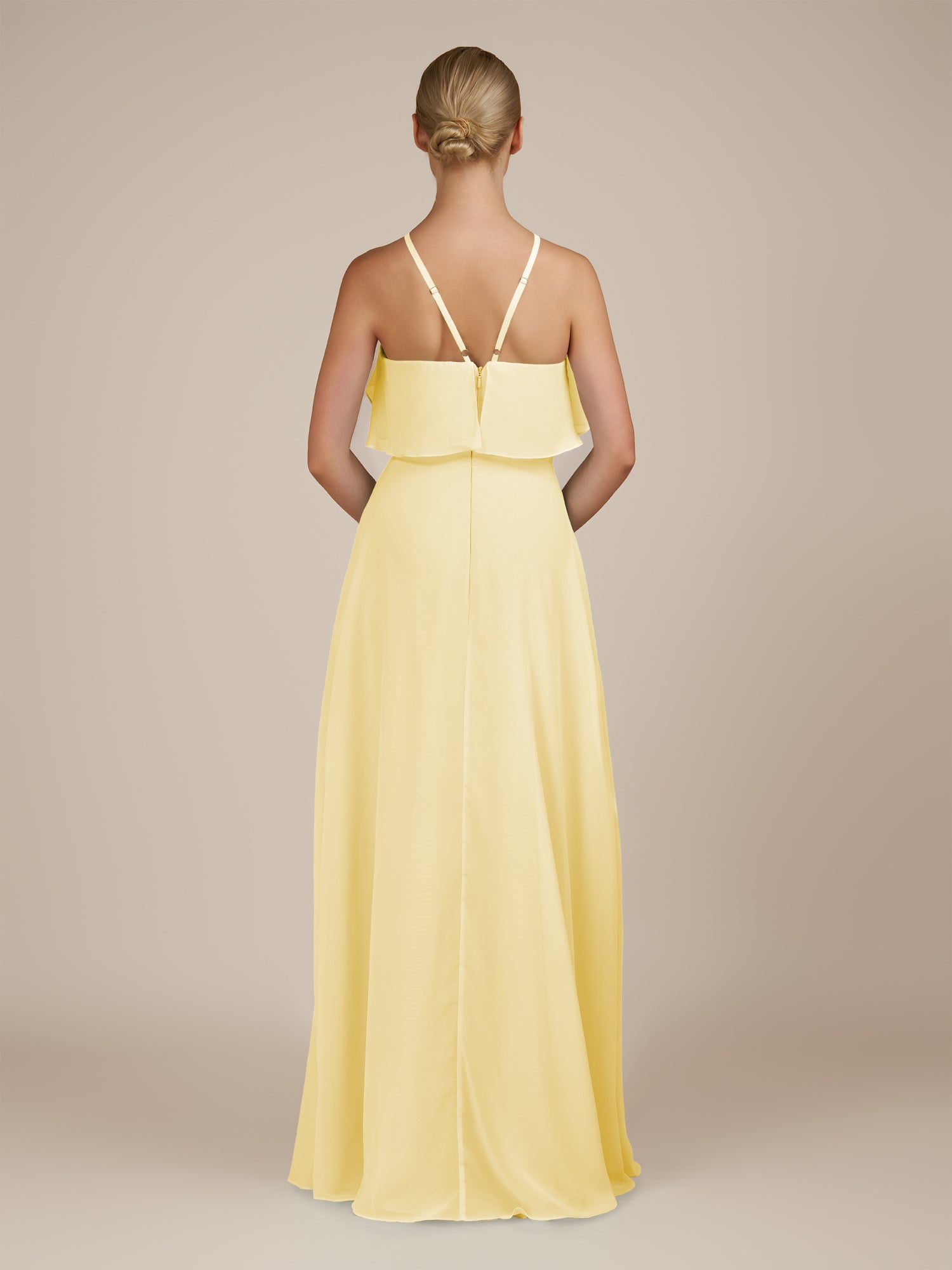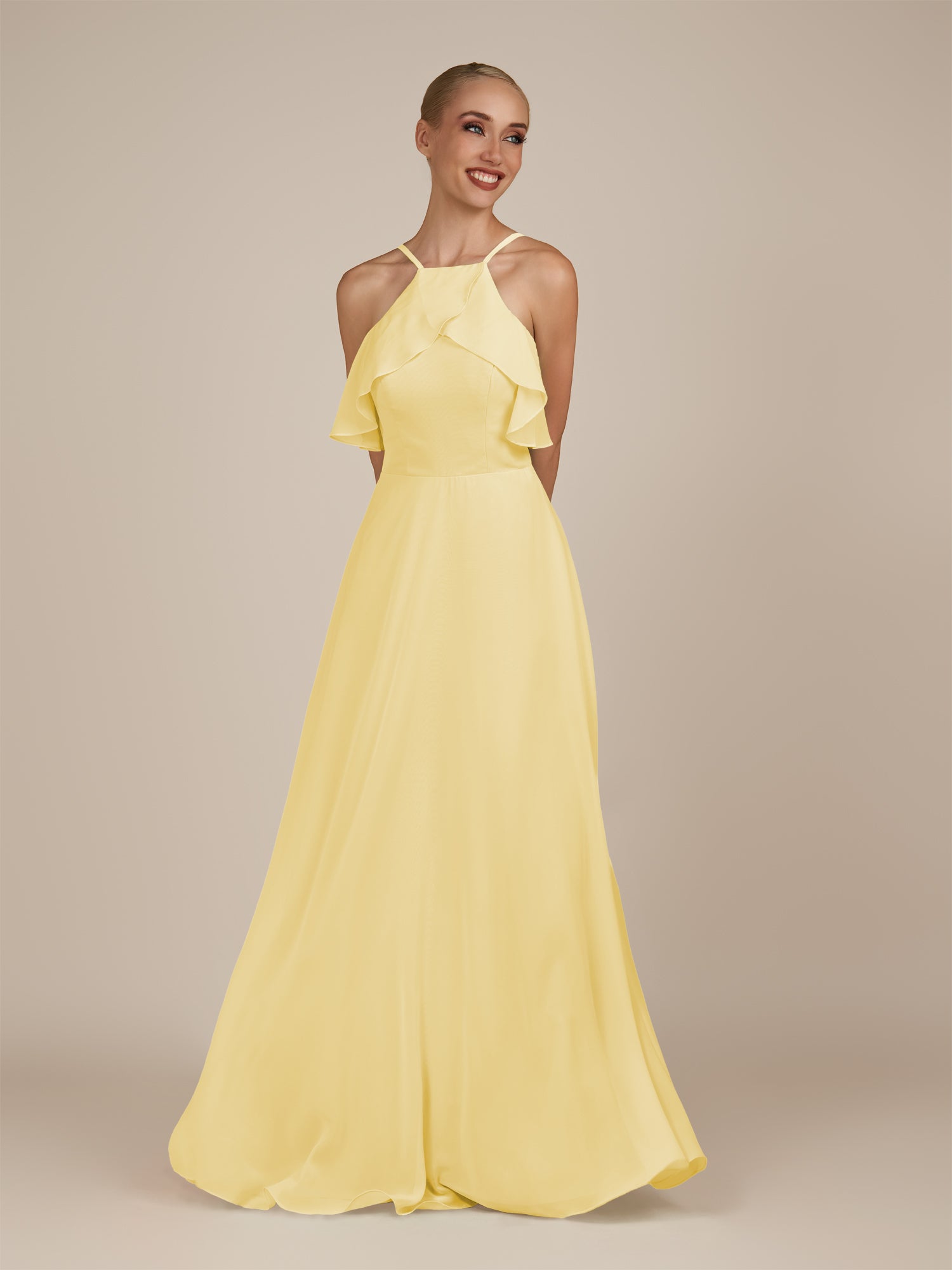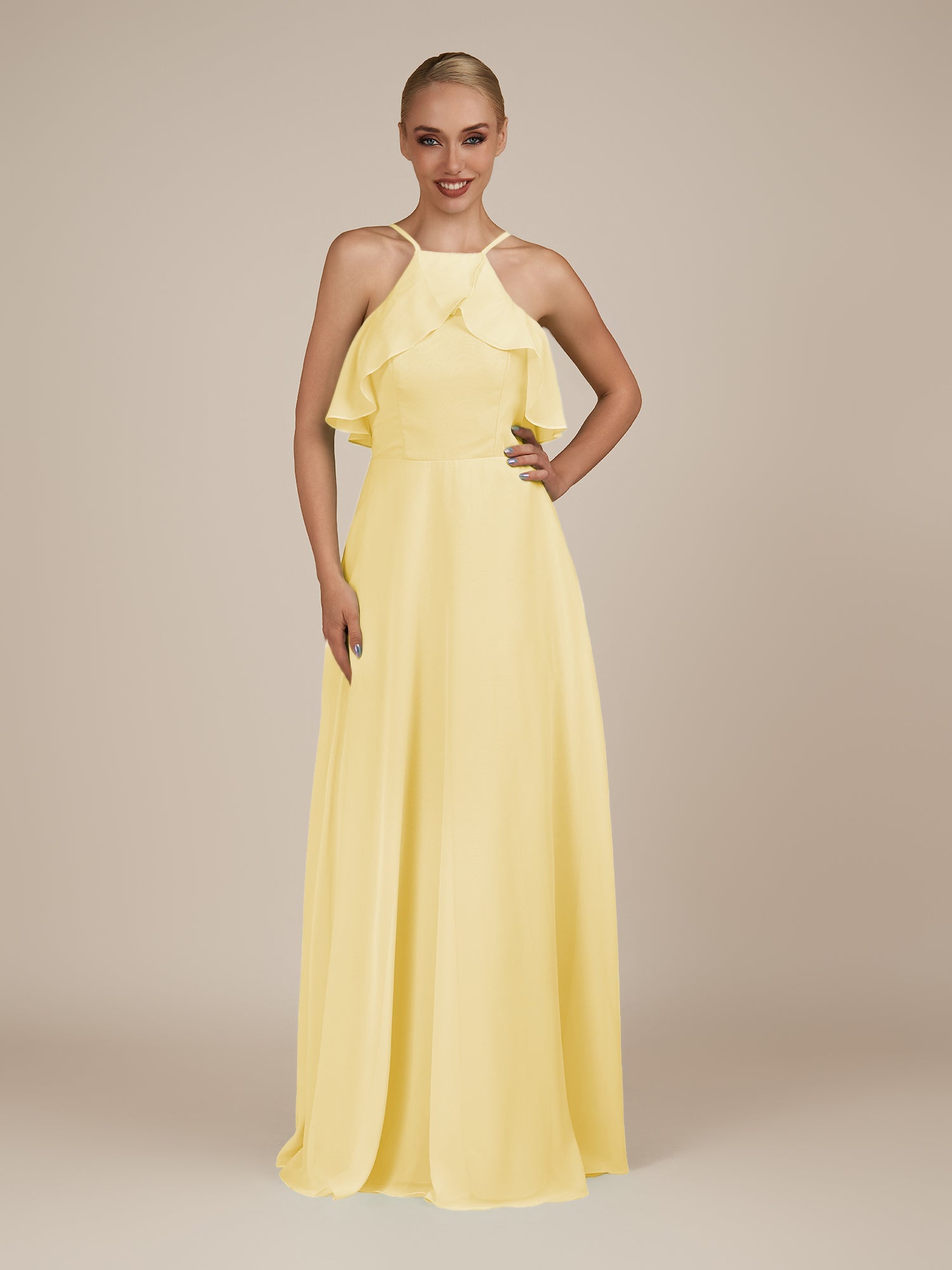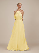 Wynne | Pastel Yellow - A Line Chiffon Halter Neck Ruffled Overlay Long Bridesmaid Dress
