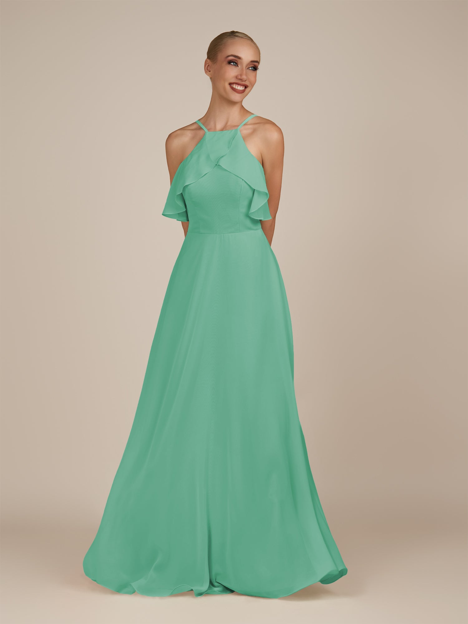 Wynne | Turquoise - A Line Chiffon Halter Neck Ruffled Overlay Long Bridesmaid Dress