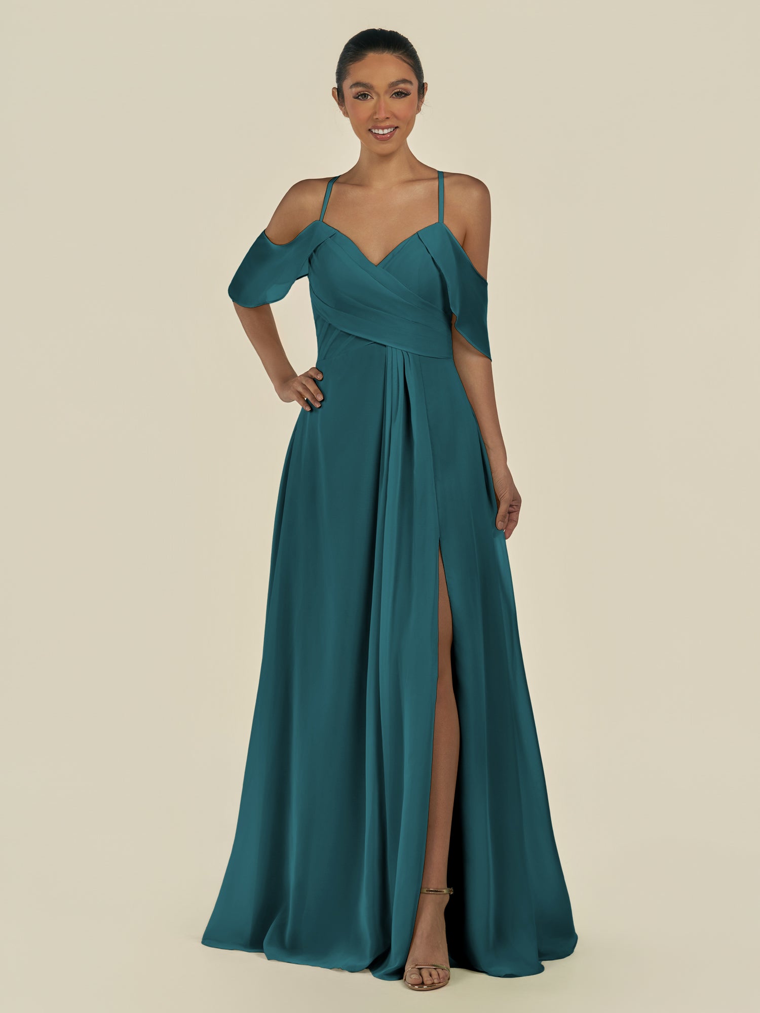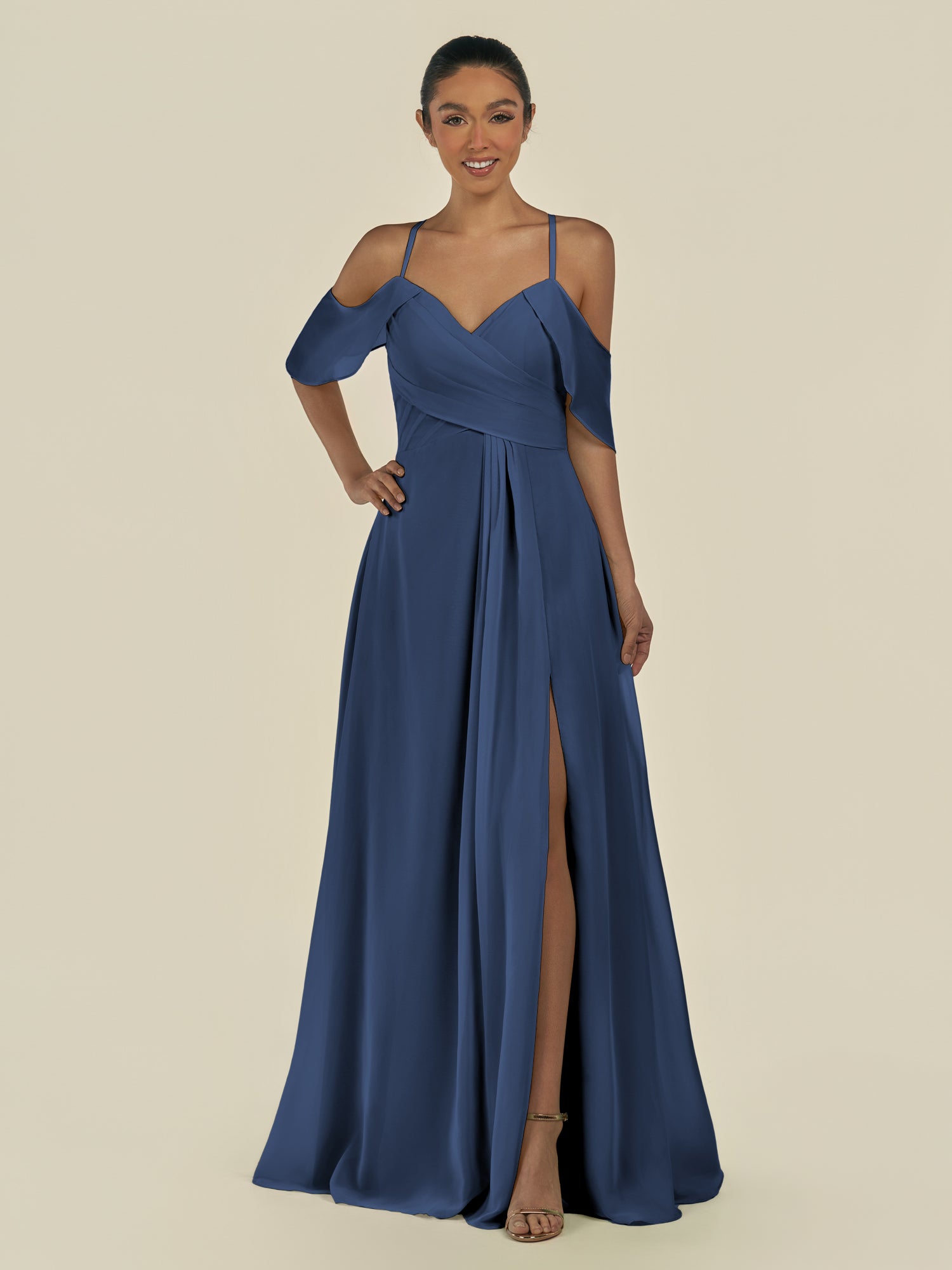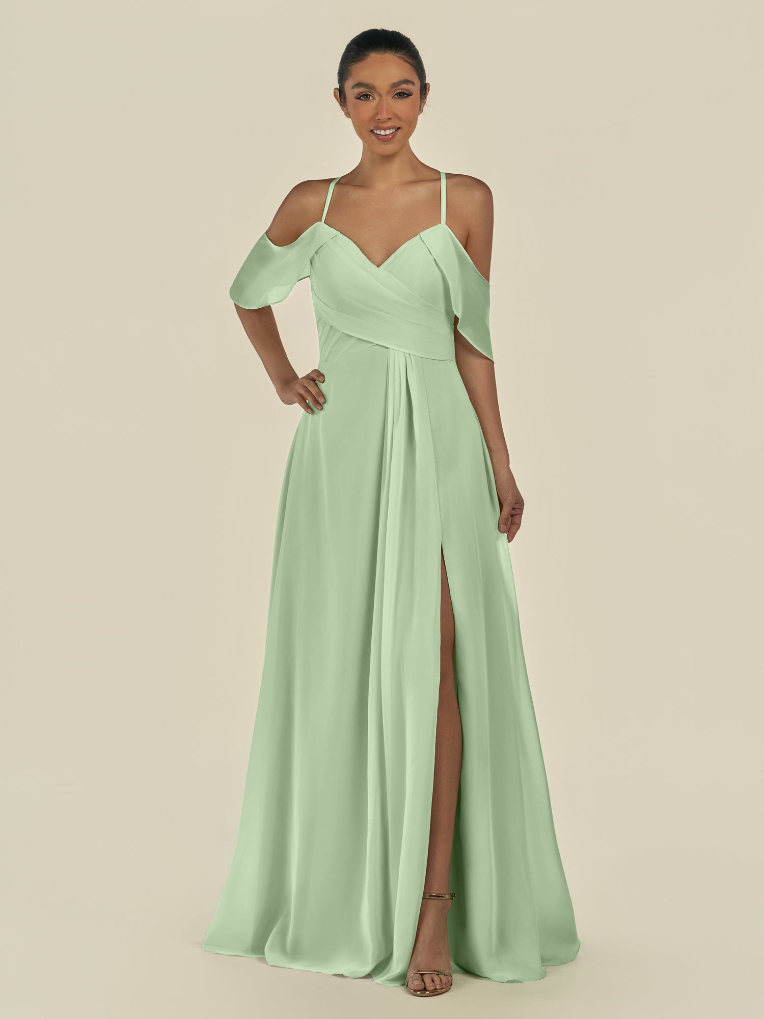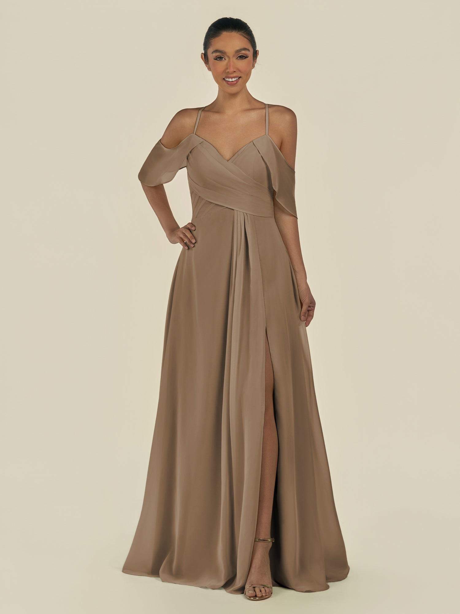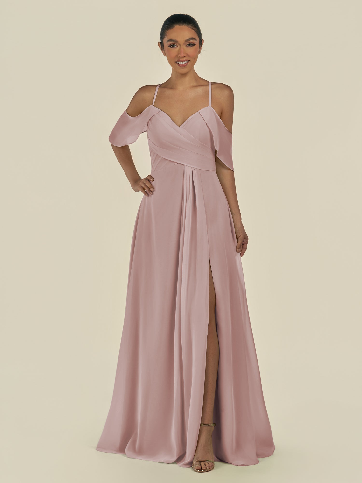 Yeoh | A Line Chiffon Off the Shoulder Pleated Long Bridesmaid Dress with Slit