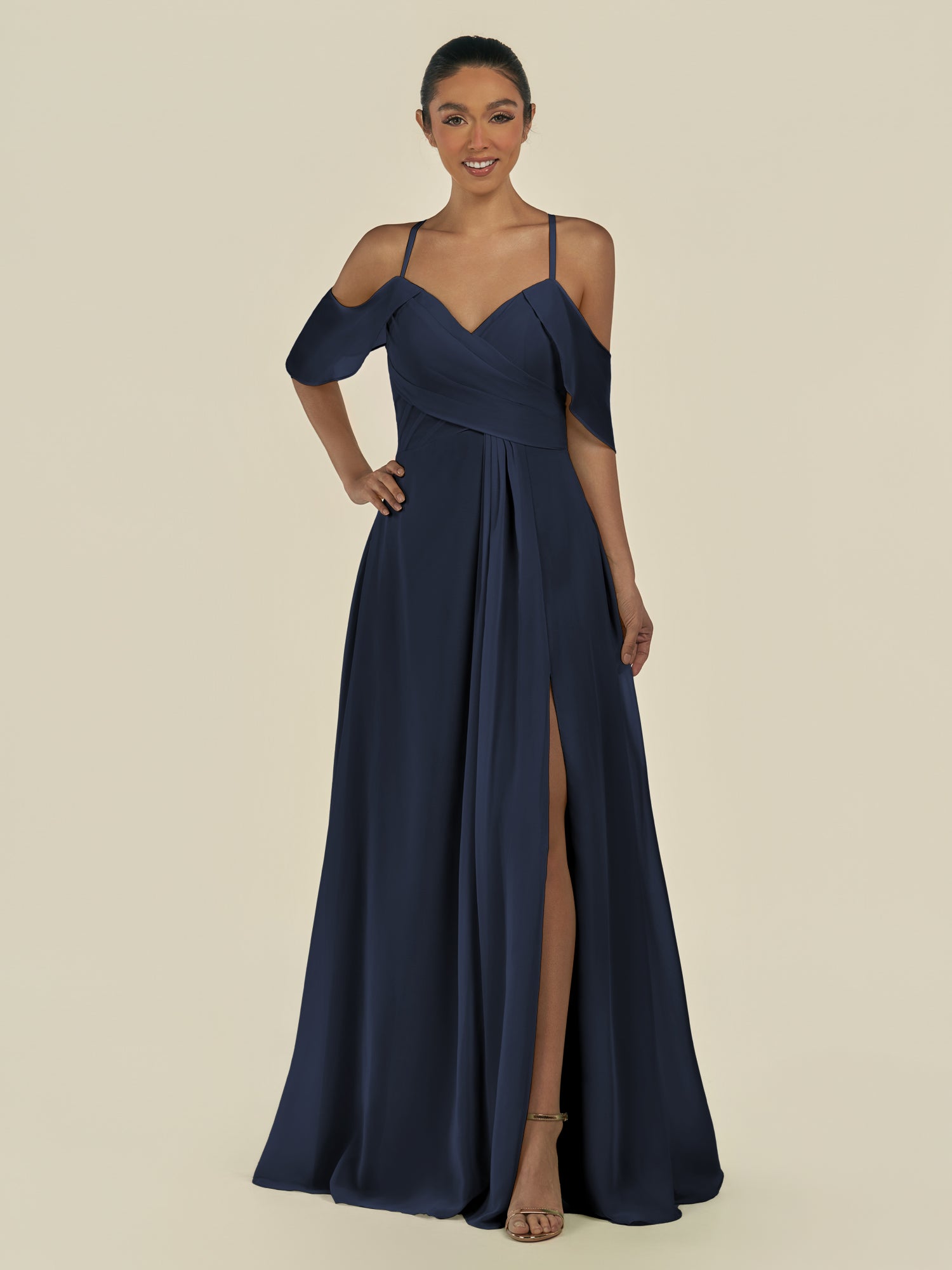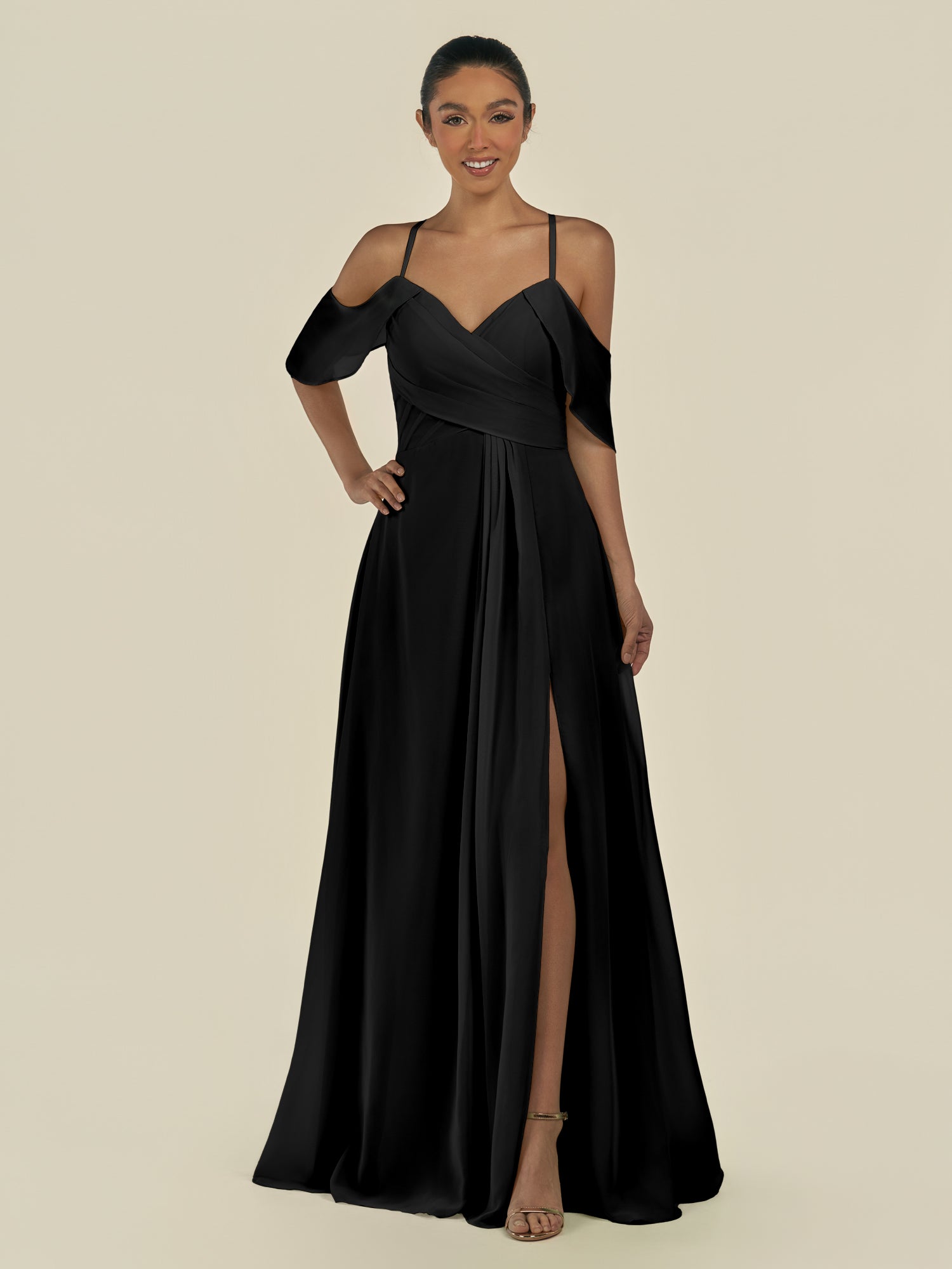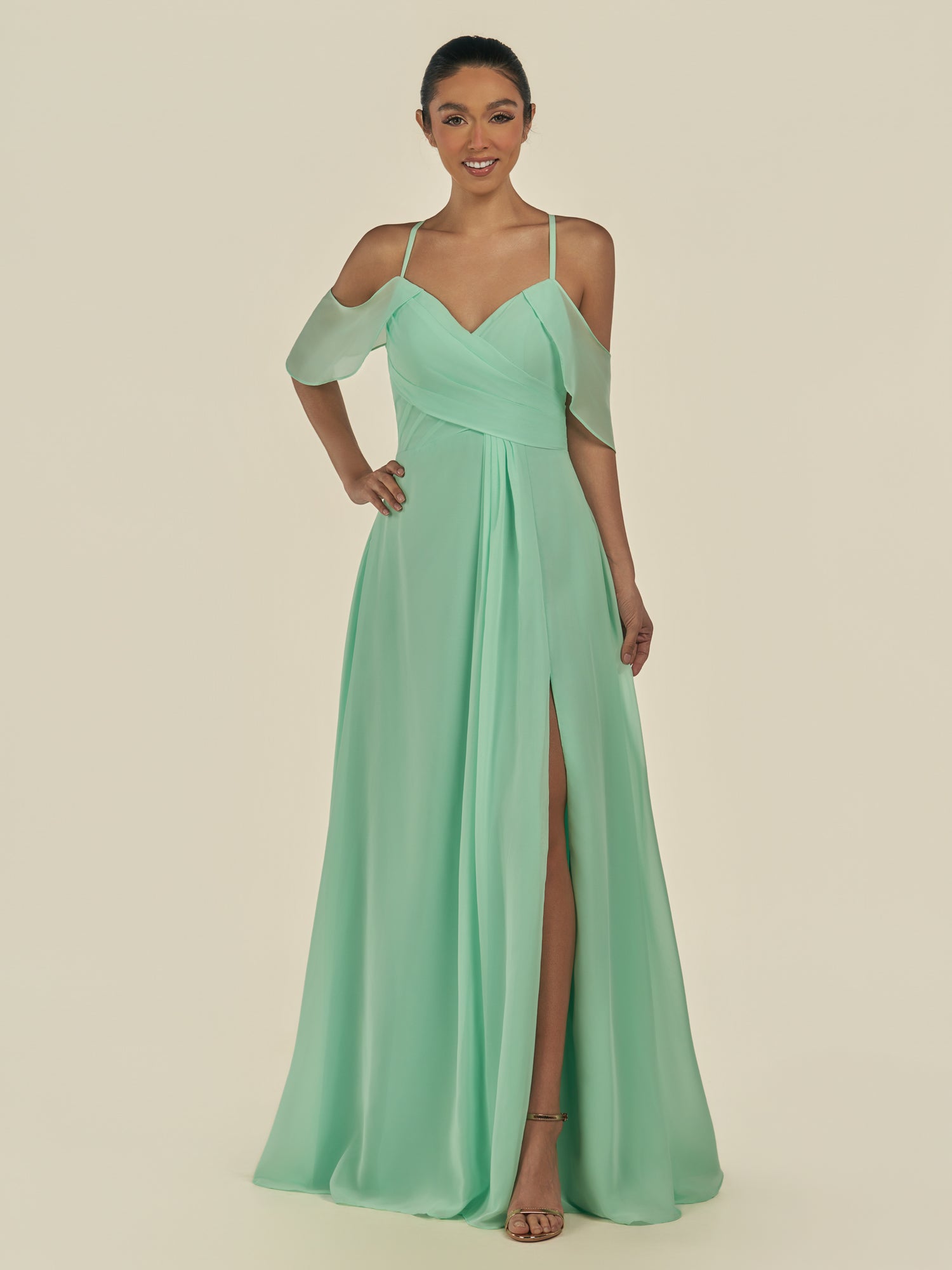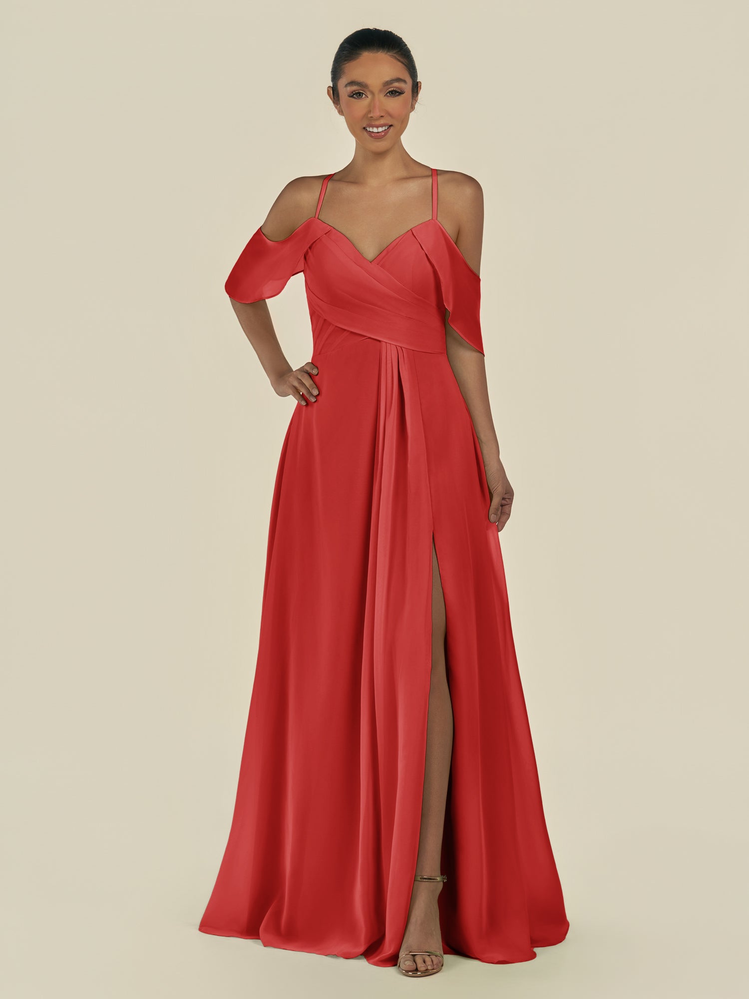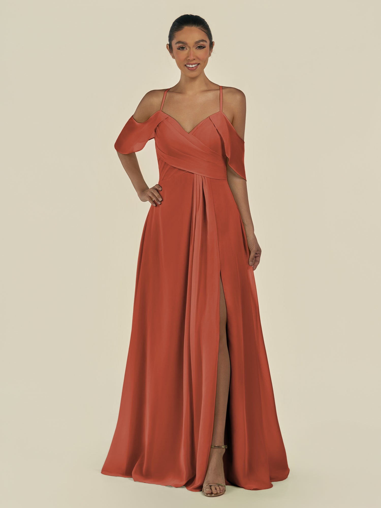 Yeoh | A Line Chiffon Off the Shoulder Pleated Long Bridesmaid Dress with Slit