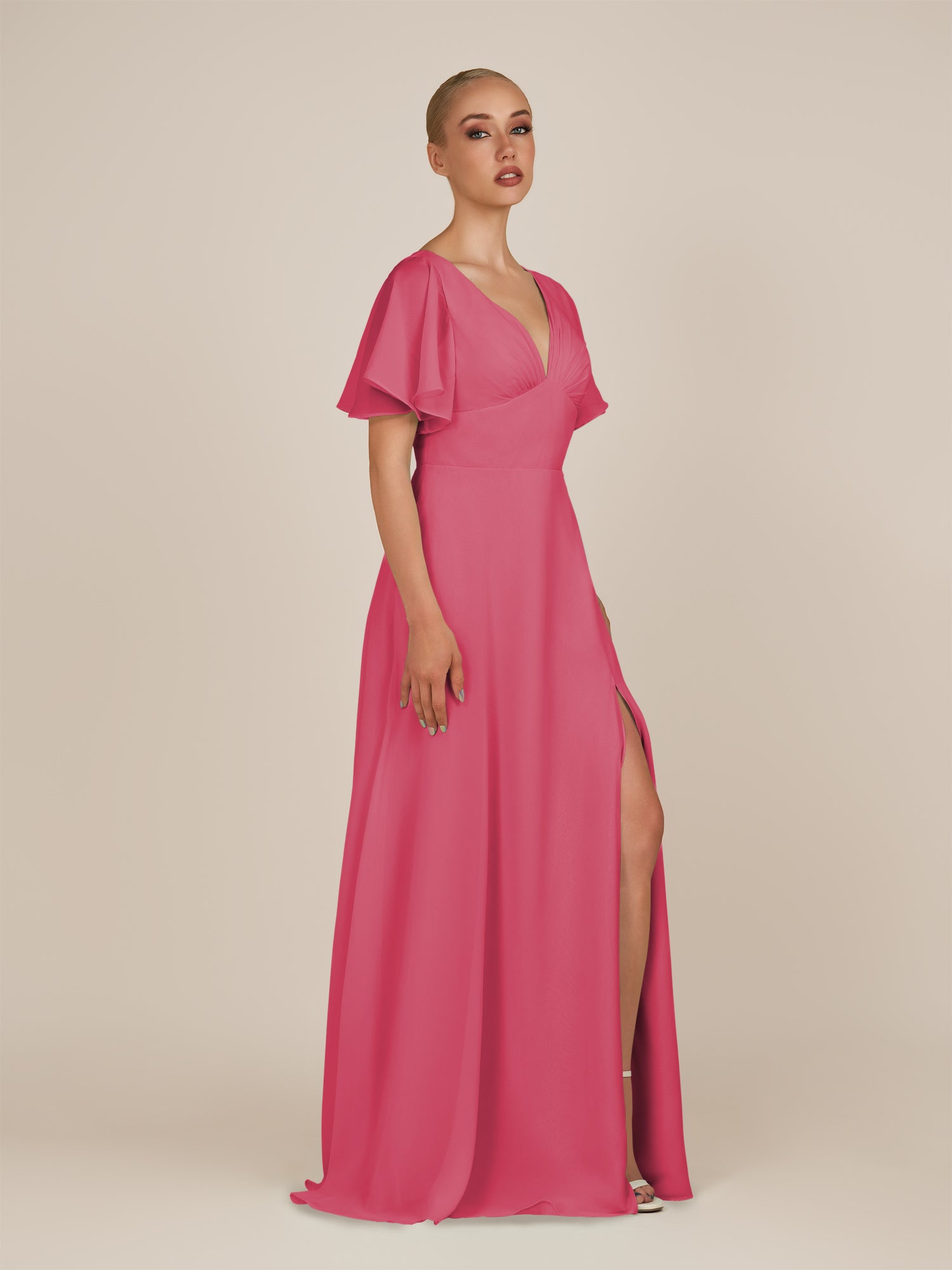 Zorina | Fuchsia - Sheath Chiffon Cap Sleeves V Neck Long Bridesmaid Dress with Slit