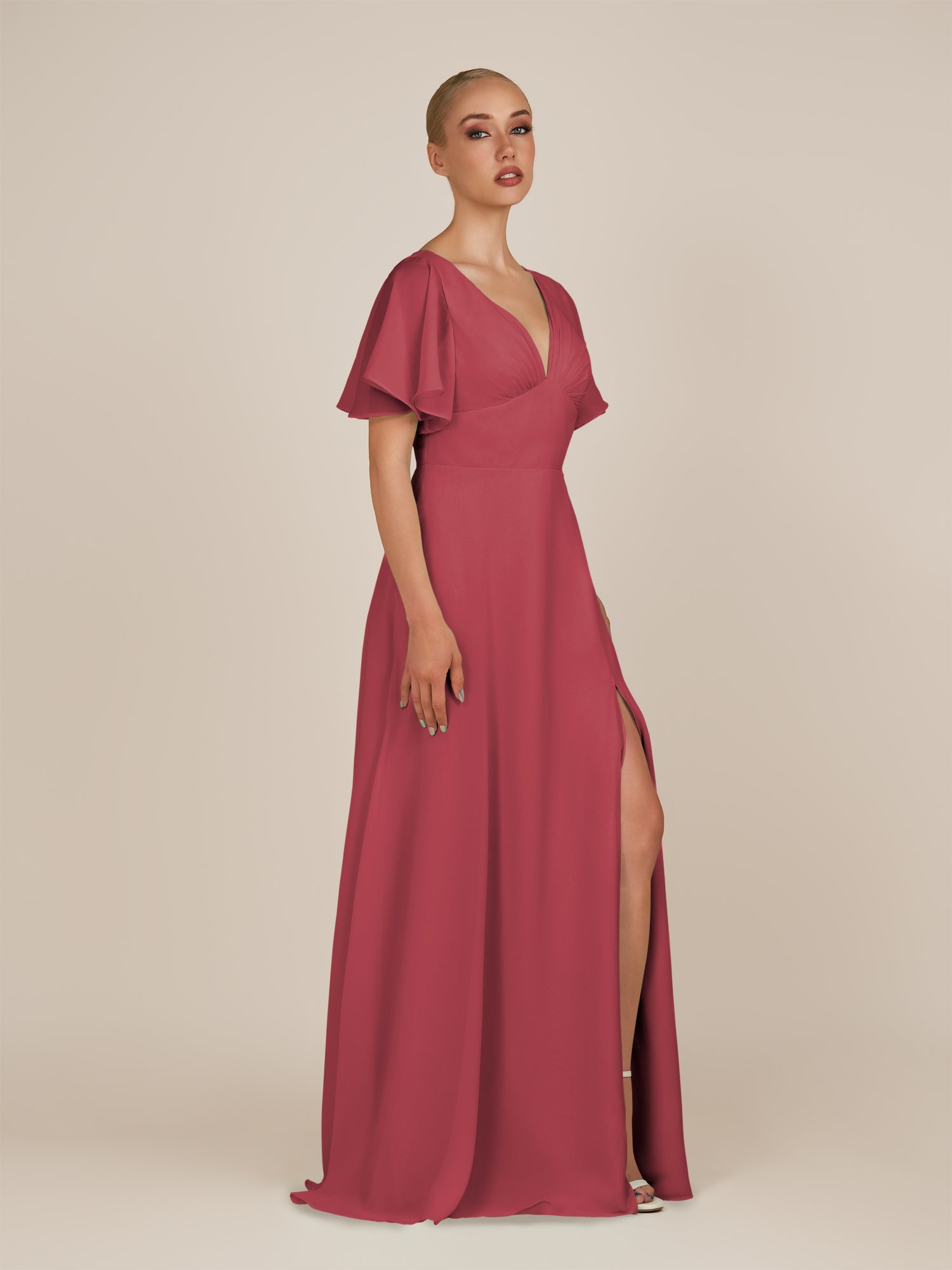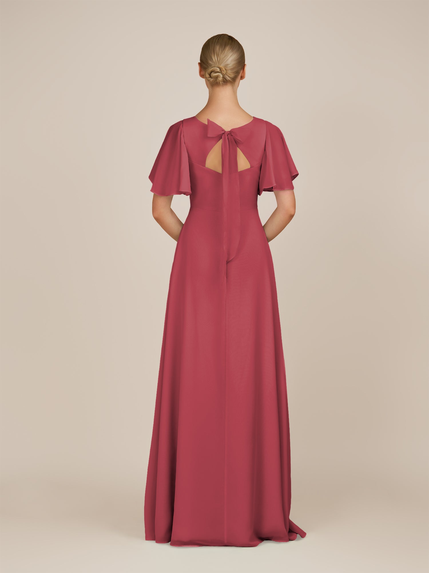 Zorina is a refined and elegant choice for your bridal party. Crafted from soft chiffon, she features a flattering V neckline and delicate cap sleeves for a touch of romance. Her floor-length sheath skirt flows gracefully with every step, accented by a subtle leg slit and a charming bow detail. Finished with a smooth zipper back, Zorina combines timeless sophistication with modern flair, perfect for weddings and special occasions.
